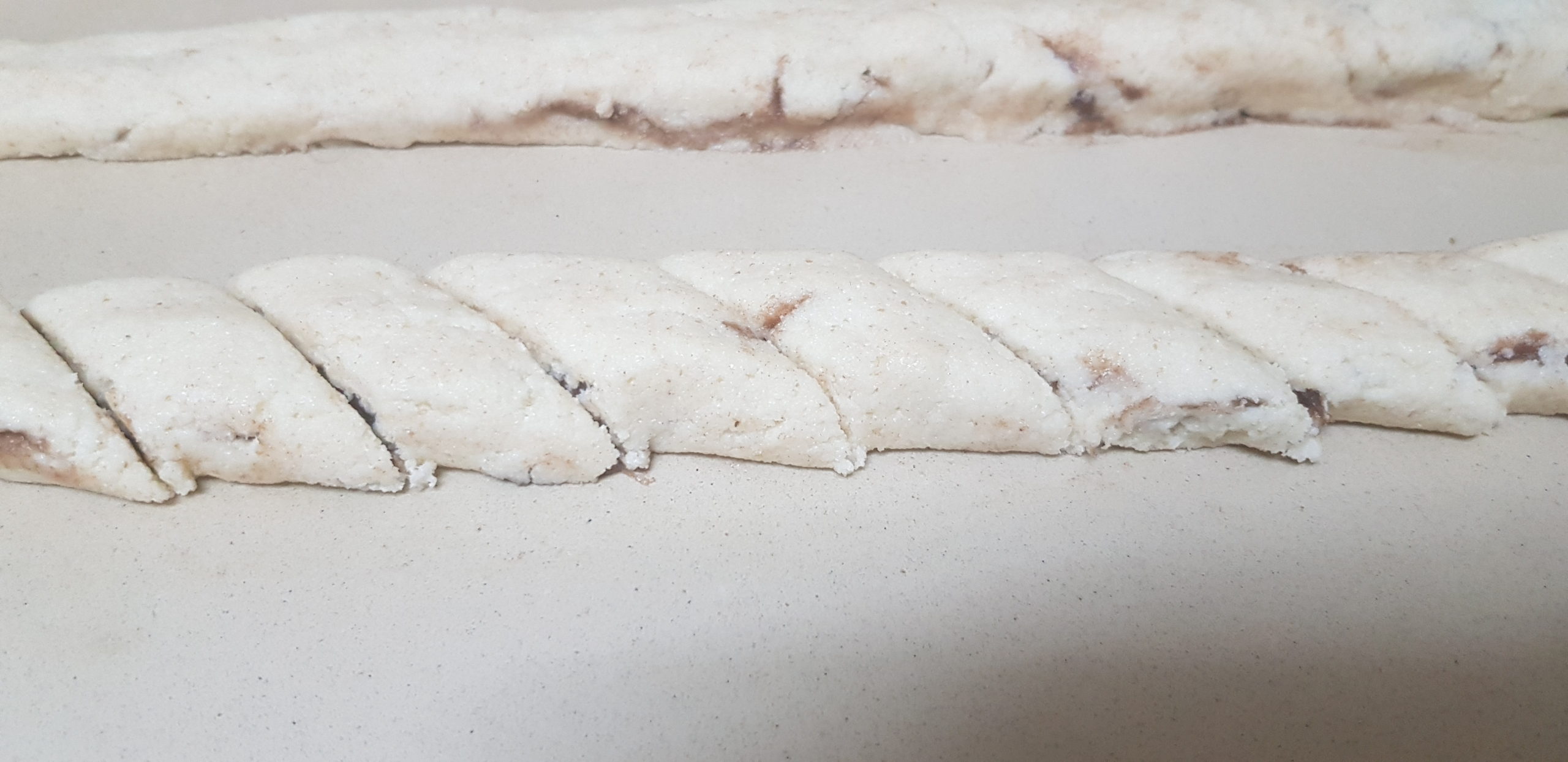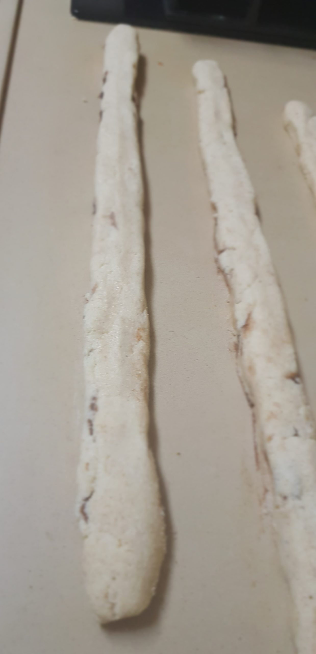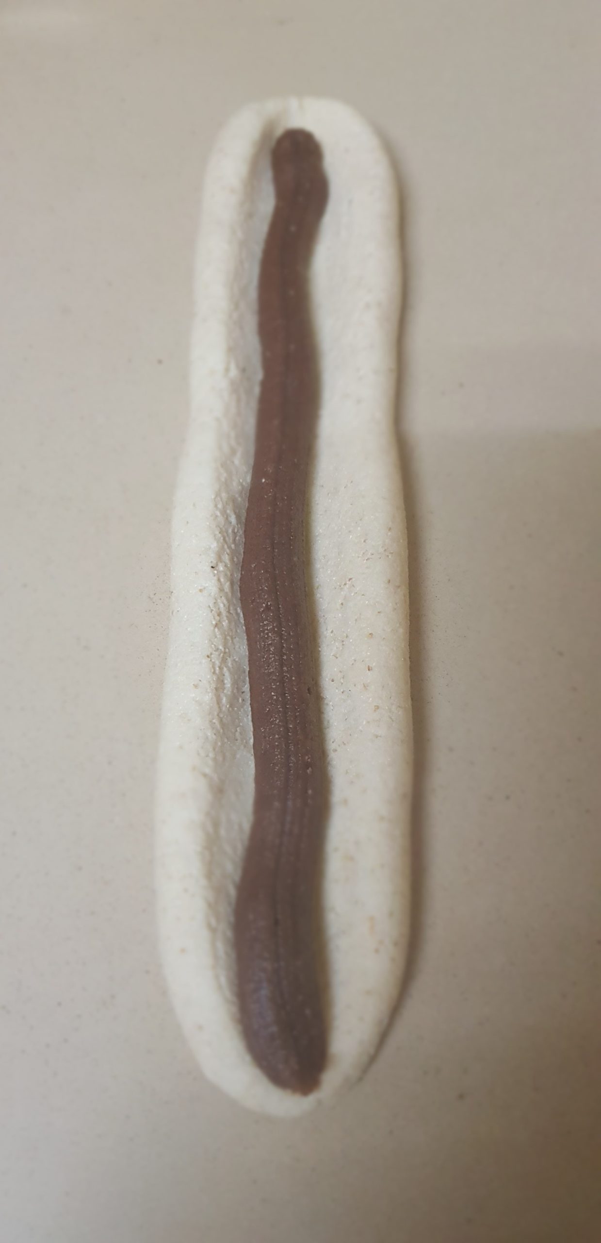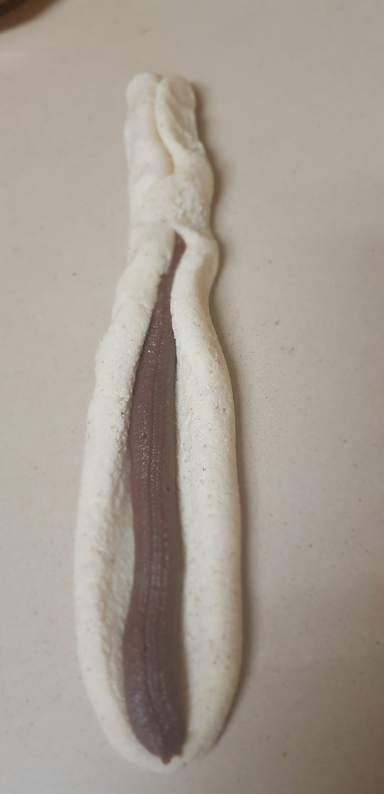Préparer entre temps la farce avec la pate de date, margarine, fleur d’oranger et un peu de cannelle, puis prélever une boule de pate, et la former en boudin fin (aidez vous d’une douille si vous n’arrivez pas à la rouler), et faire pareil avec le reste de la farce, et les recouvrir de film alimentaire.