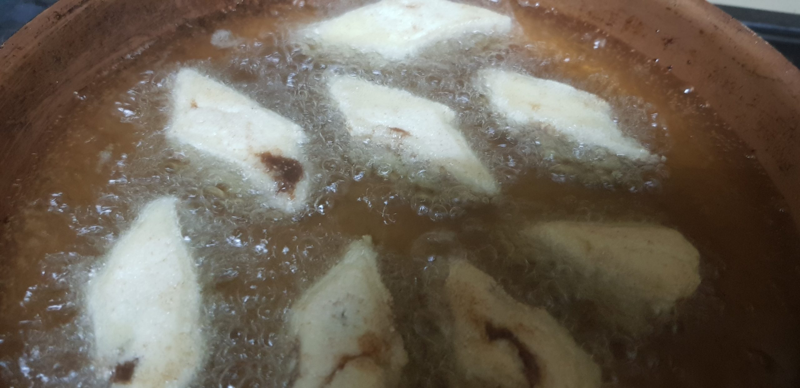 Pour la pate, ajouter de l’eau et de la fleur d’oranger progressivement pour avoir une pate ferme qui ne doit pas s’effriter et former un gros boudin, et faire un puit au centre sur toute la longueur avec votre index et placer le boudin de farce aux dattes, et refermer et donner une autre forme . Couper en biais avec le couteau et laisser frire dans un bain d’huile sur feu moyen ( ni trop chaud, ni trop faible) .