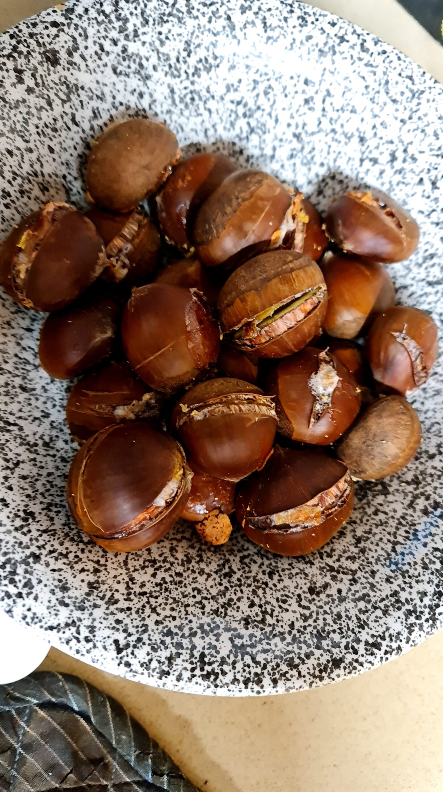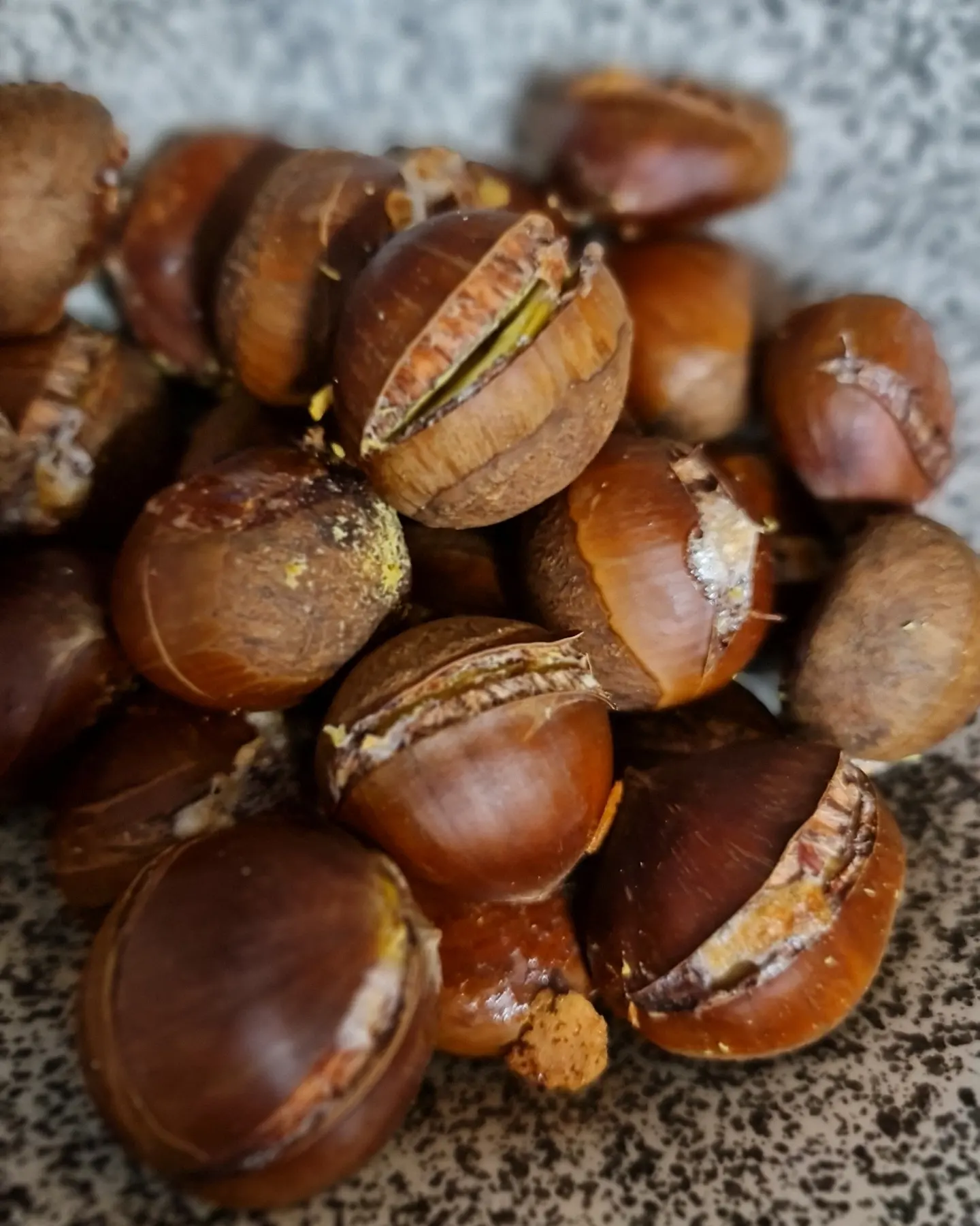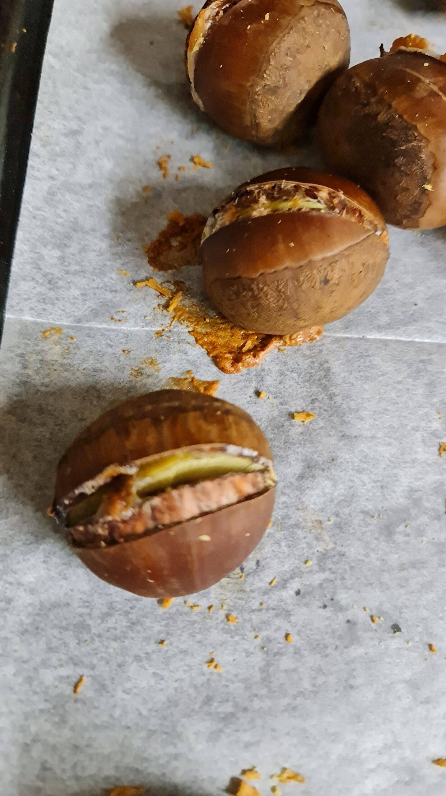 Les marrons sont bons quand ils sont chauds et encore mieux quand ils sont préparés avec amour, pour cela il suffit de les fendre dans la largeur, les laisser tremper une heure dans de l’eau avec une cuillère à soupe de bicarbonate et ensuite les faire cuire au four 30 minutes à 220 degrés !