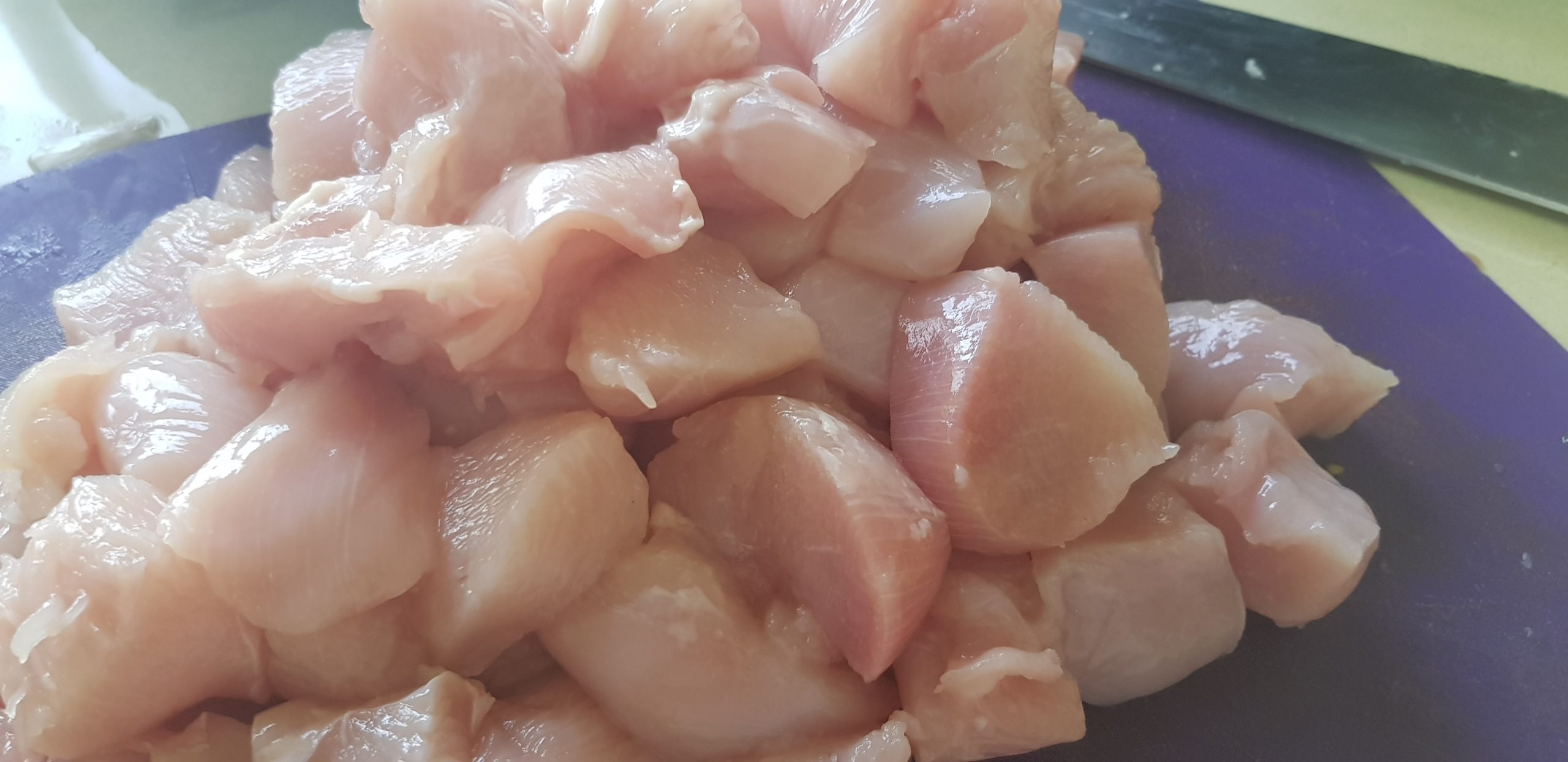 1 – Couper la poitrine de poulet en petit carré moyens, et réserver.