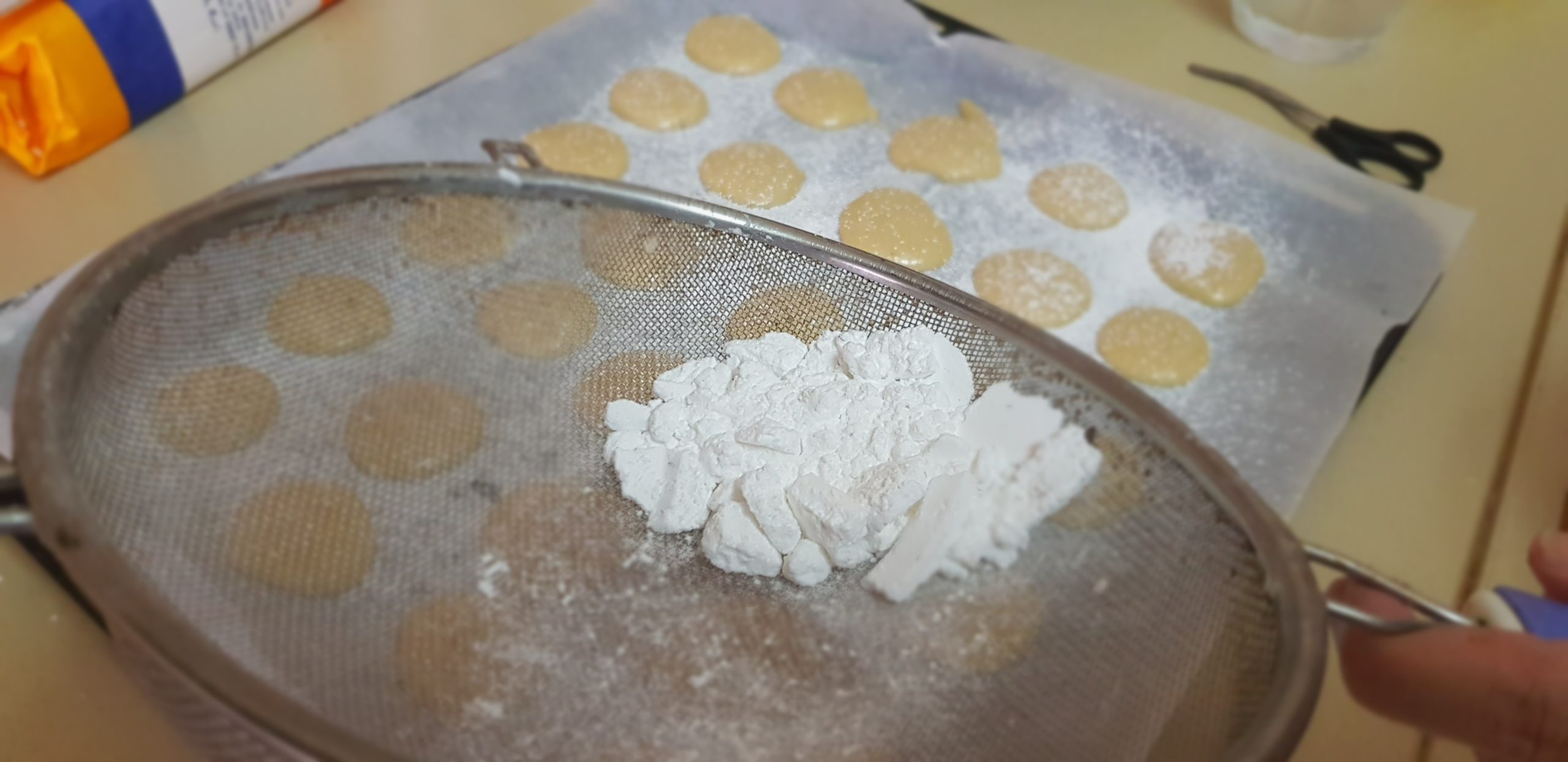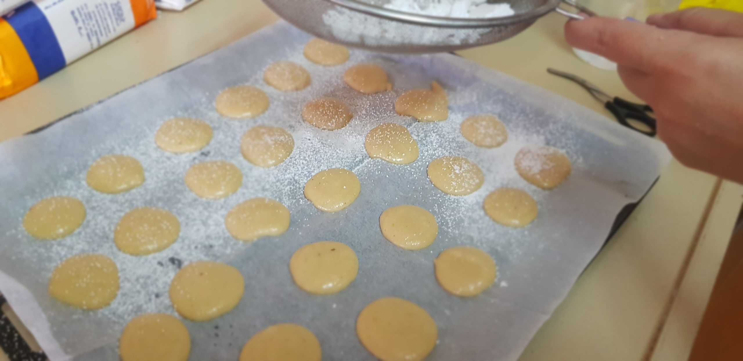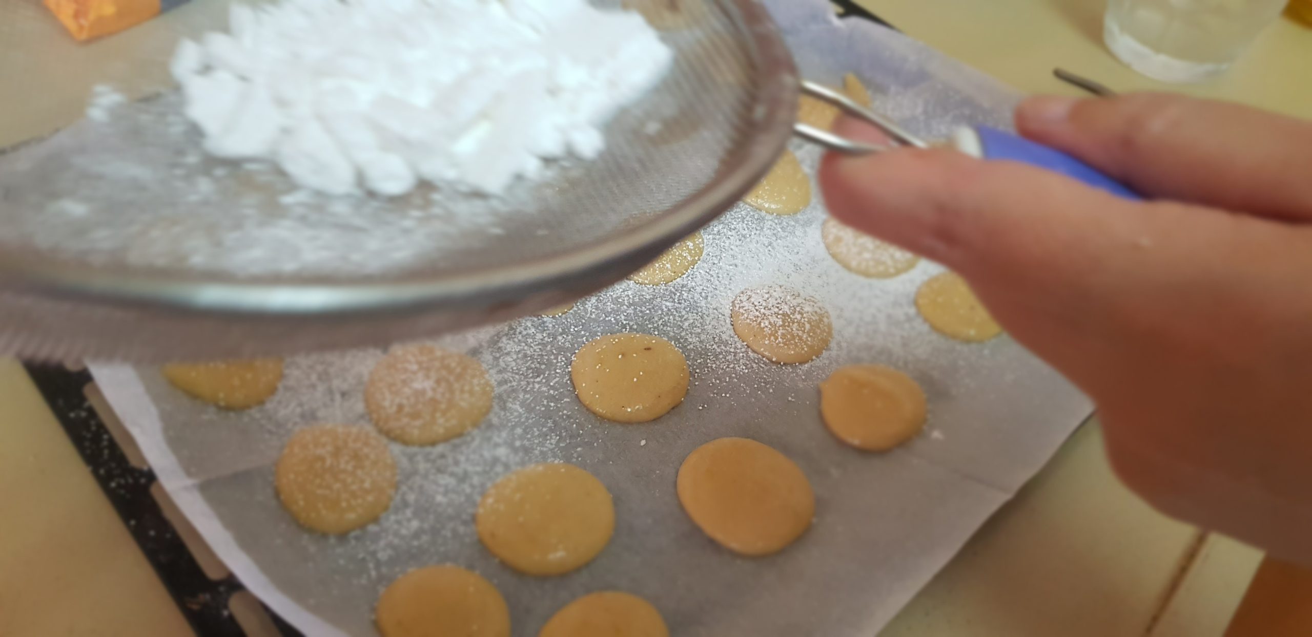 Saupoudrer généreusement de sucre glace puis cuire les amaretti à 160°C pendant 15 min.