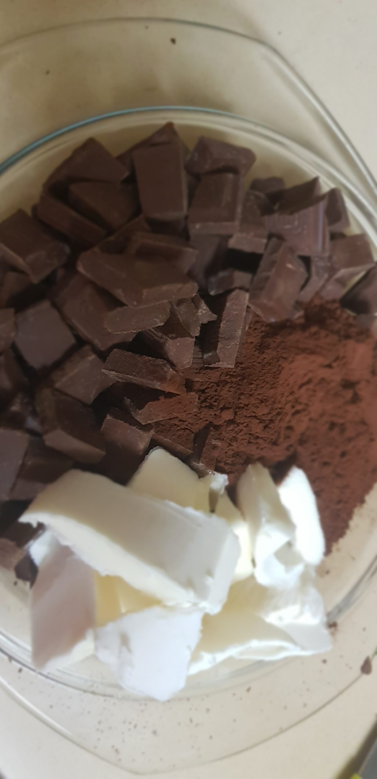 Dans un bol adapté au micro-ondes, placez le cacao, le chocolat noir, le beurre et faites chauffer le tout par petites impulsions.