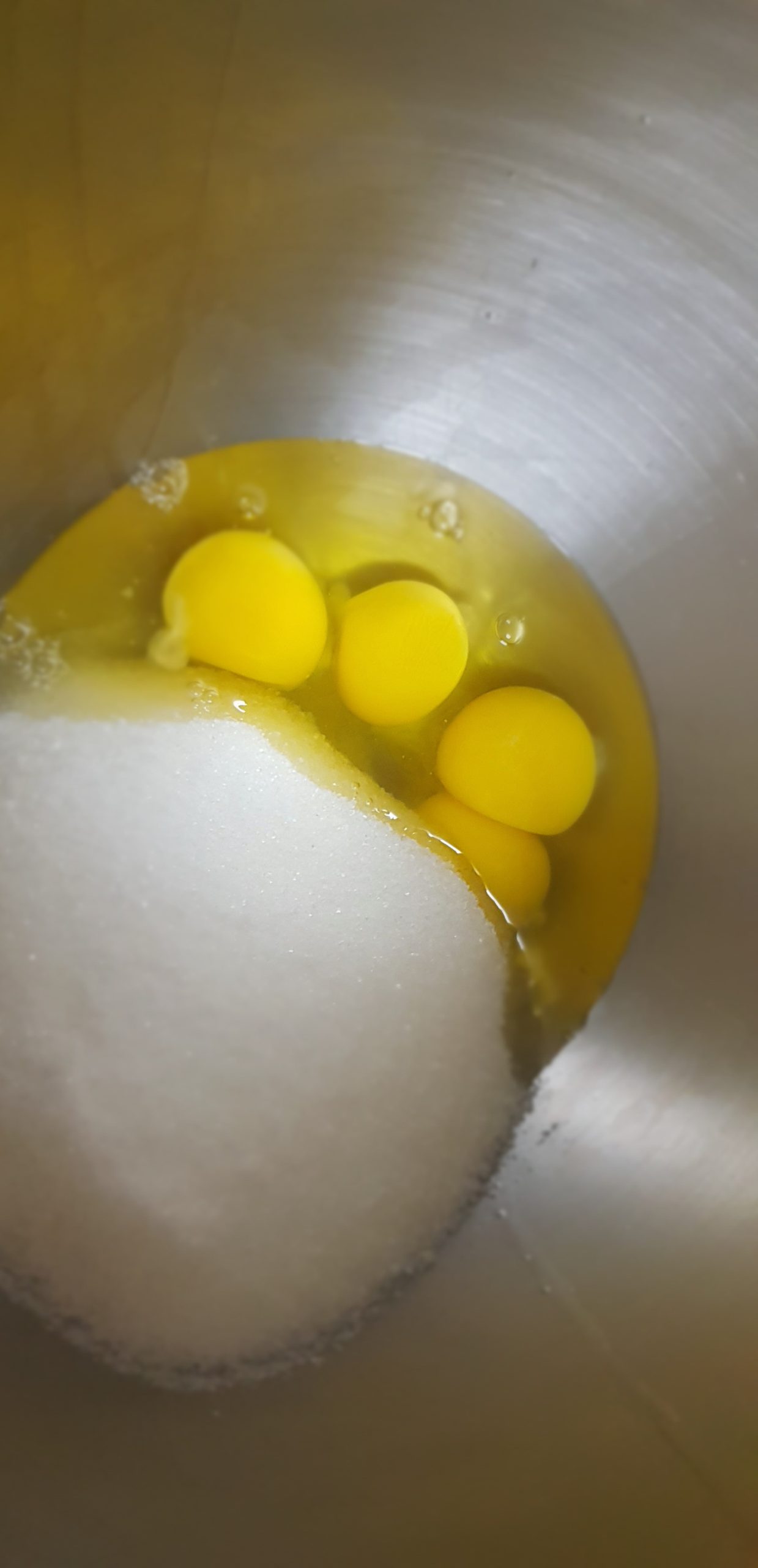 Dans un bol mélangeur avec le ballon à fouetter, fouetter le sucre et les œufs entre 4-5 minutes.