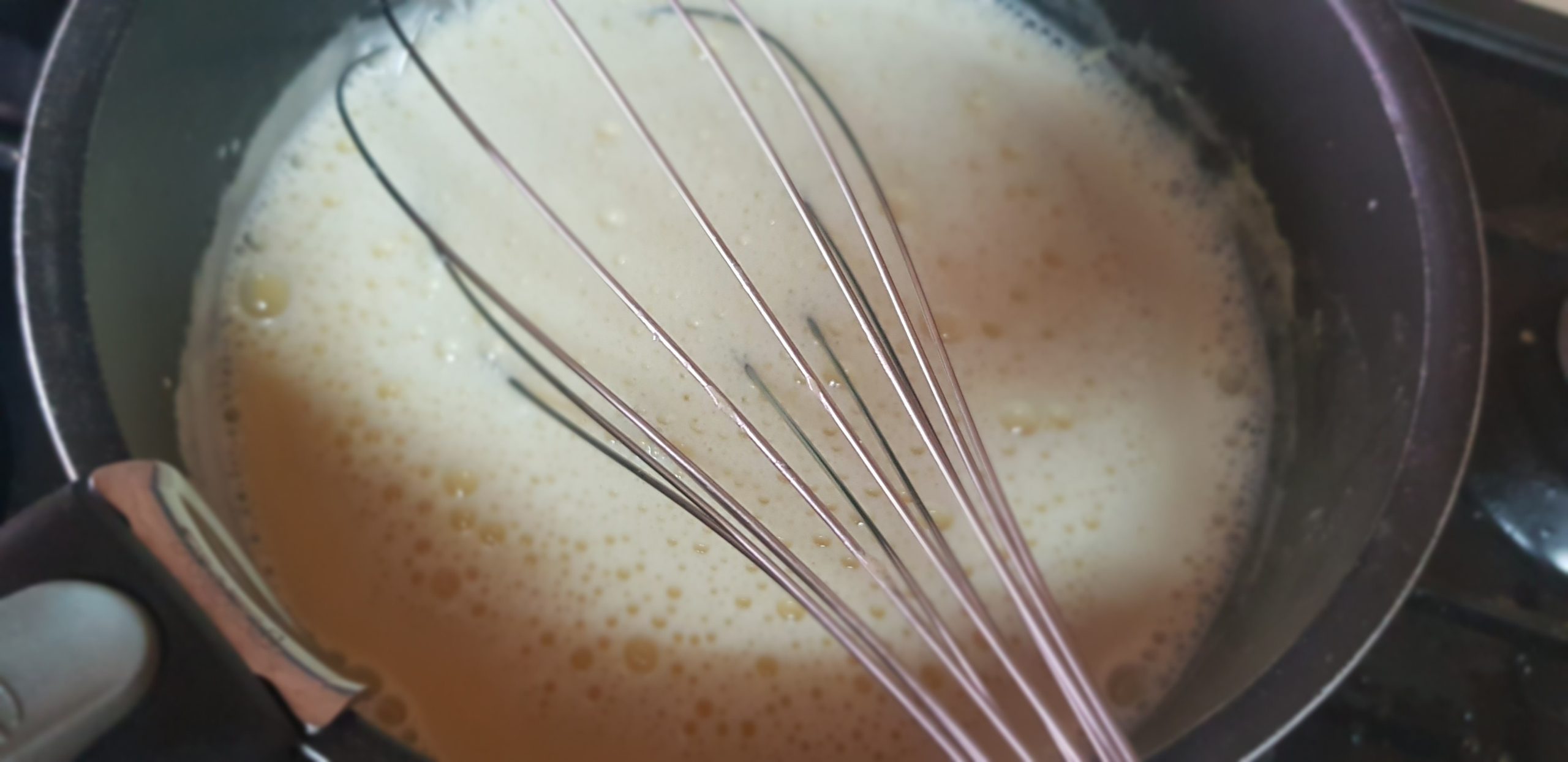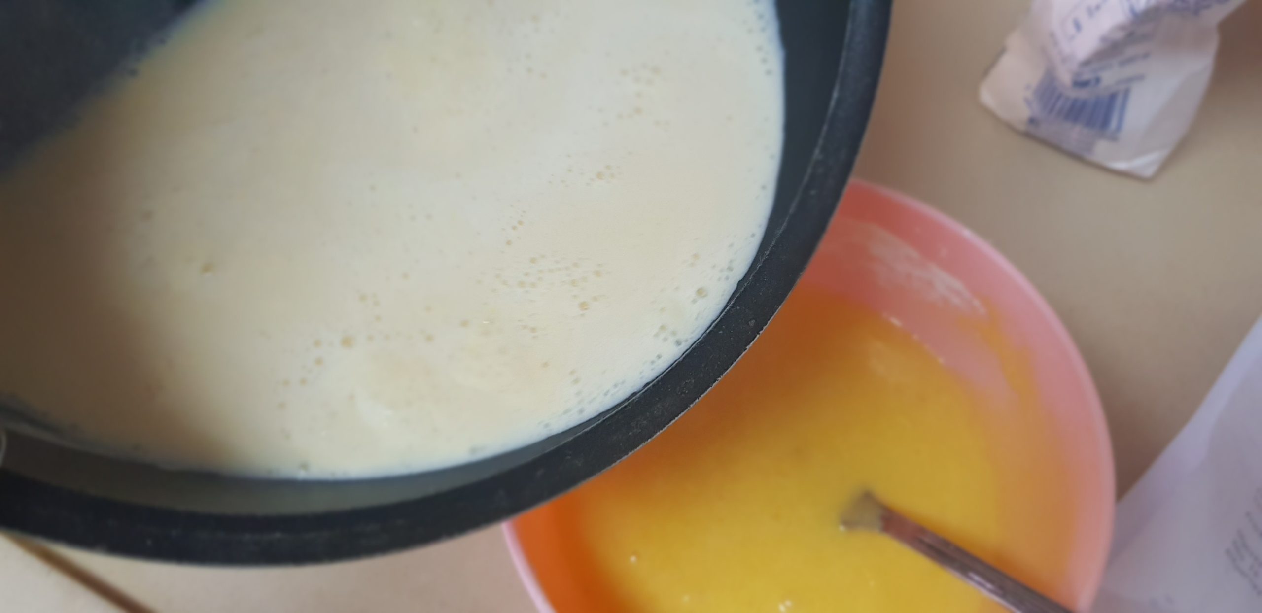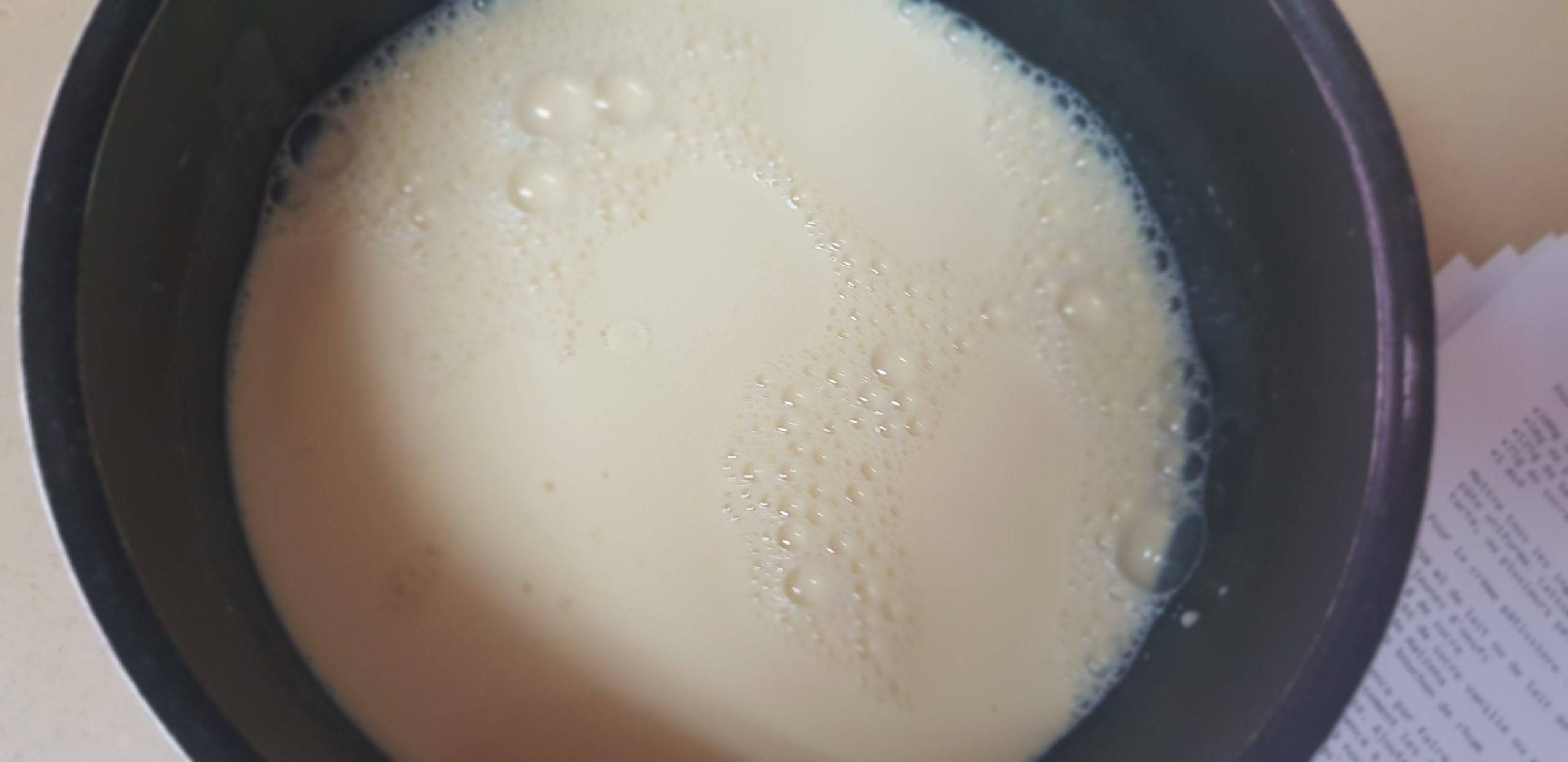 4 – Dés que le lait commence à frémir versez le sur le mélange des œufs tout en remuant