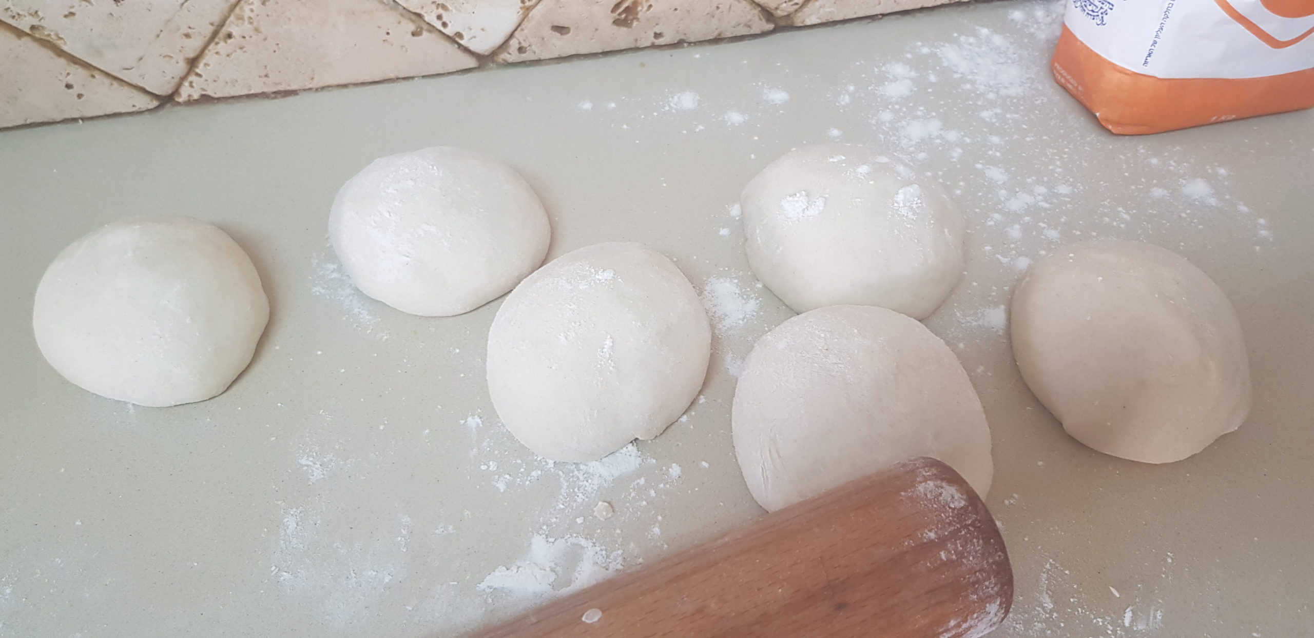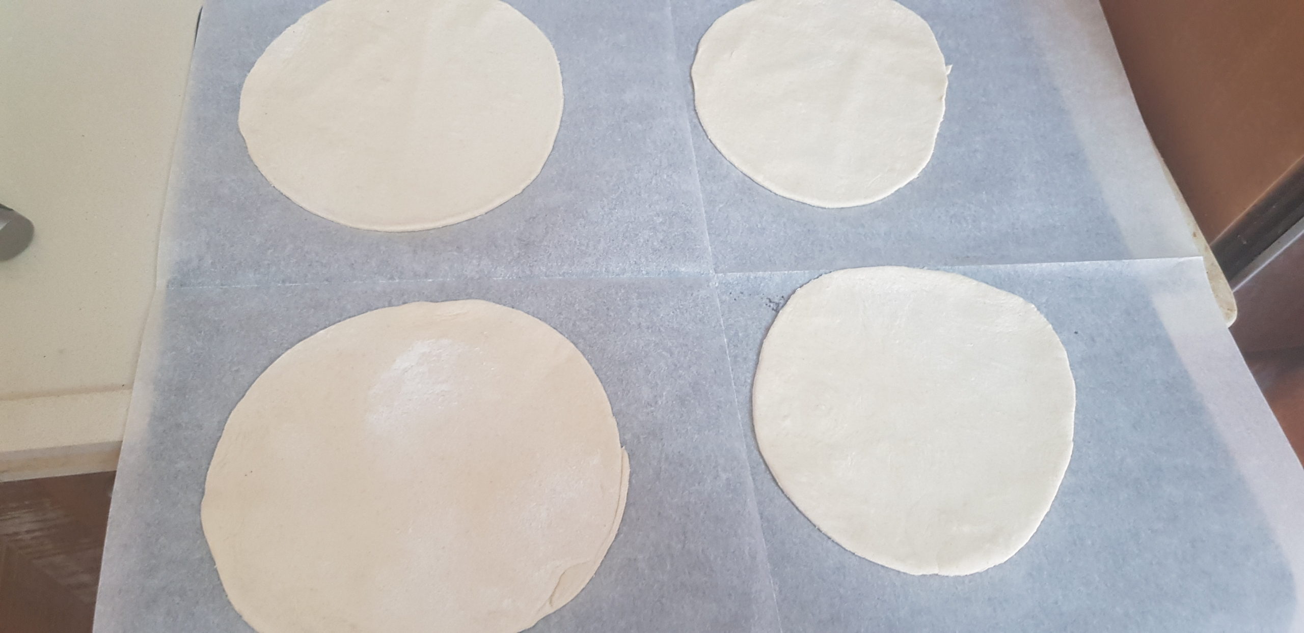 5. Une fois la pâte levée, la retourner sur une surface farinée et la diviser en 8 morceaux égaux. Étalez chaque morceau en une forme ronde ou ovale très fine. Essayez de rendre chacun aussi mince que possible.