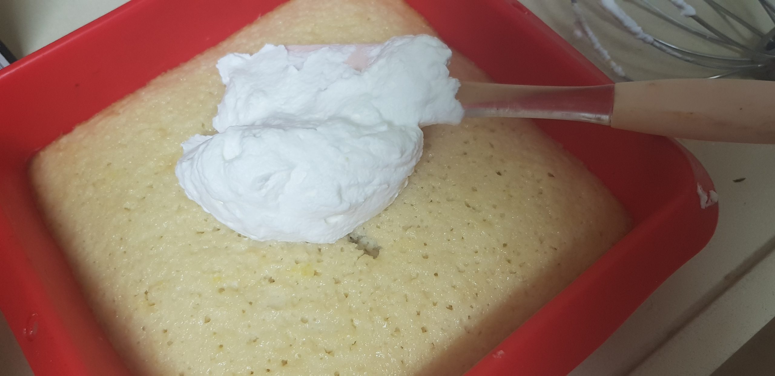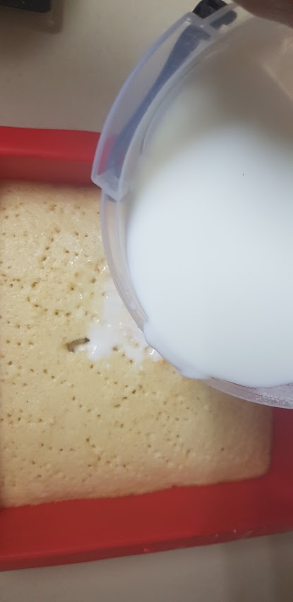 Mélanger 200 ml de lait, avec le sucre vanillé et chauffer un peu au micro-onde dans une casserole, piquer le gâteau avec une fourchette partout et verser le lait vanillé, en 2/3 fois et placer la gâteau imbibé au frigo 30 minutes.