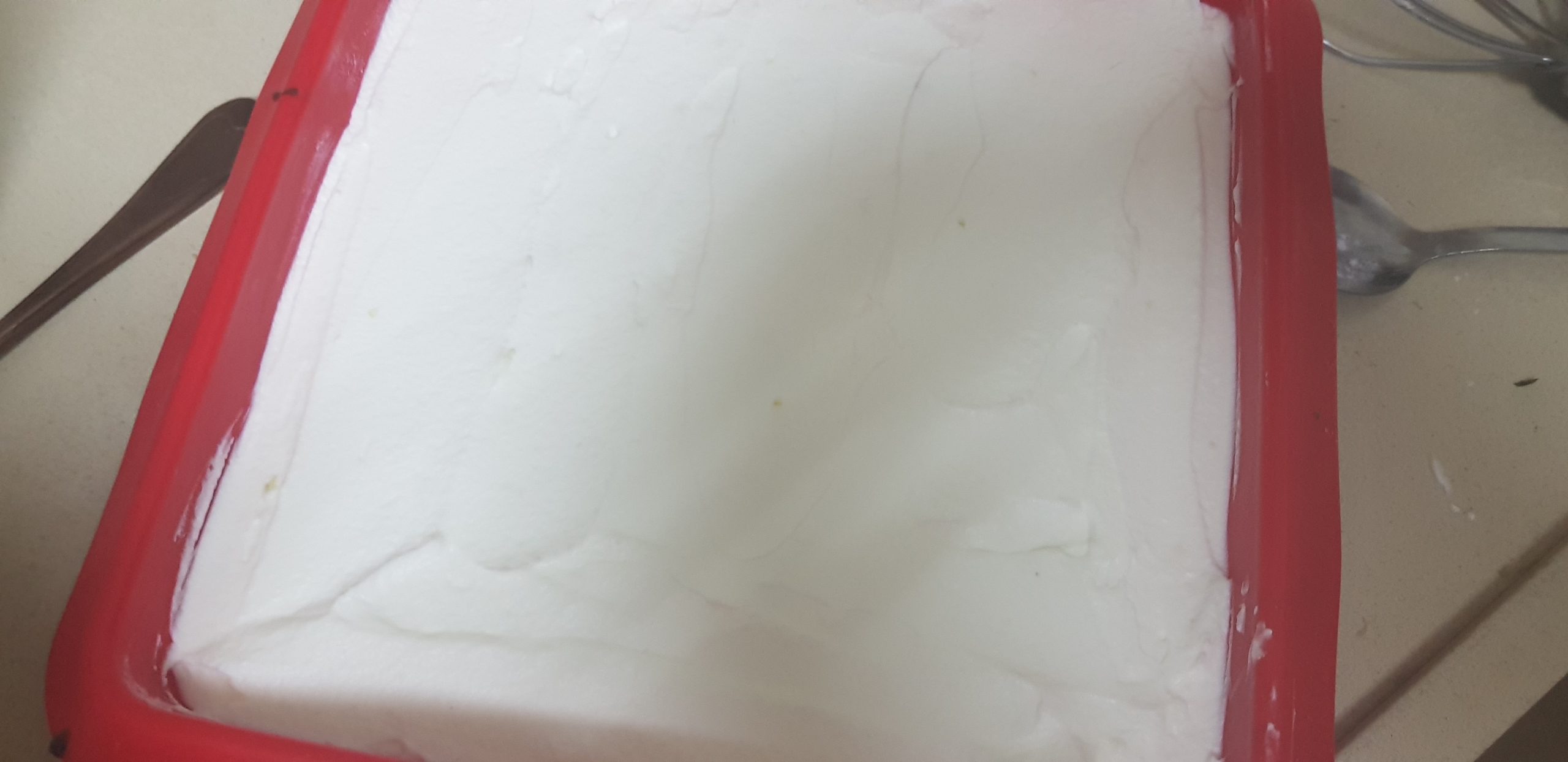 Battre dans un bol froid la crème fraiche liquide 38%, avec le sucre glace, ajouter le zeste de citron (ou/avec deux cuillères à soupe de noix de noix de coco) quand elle est bien montée, mélanger à la Maryse, et disposer la crème sur le gâteau, lisser et placer au frigo, le temps de préparer le glaçage au citron.