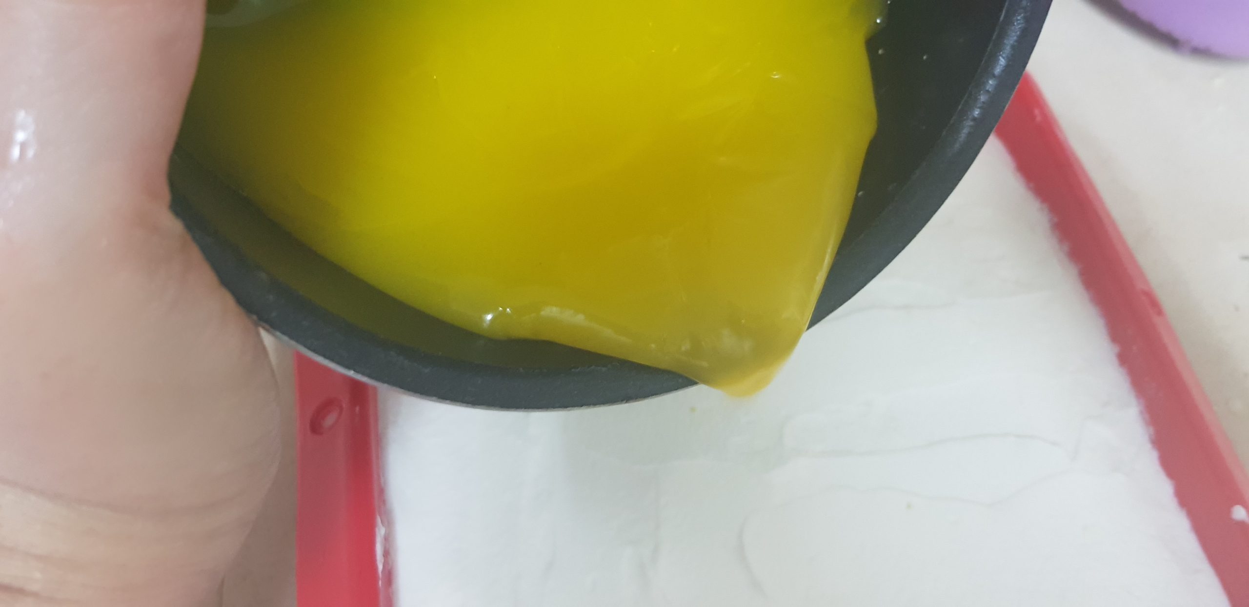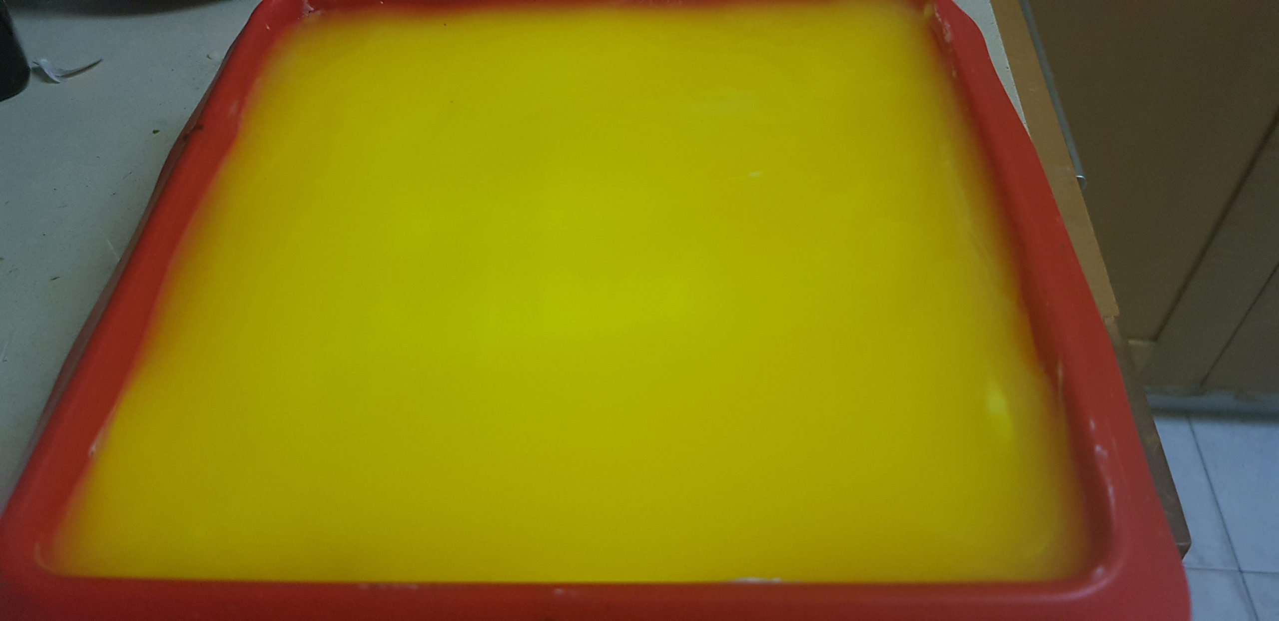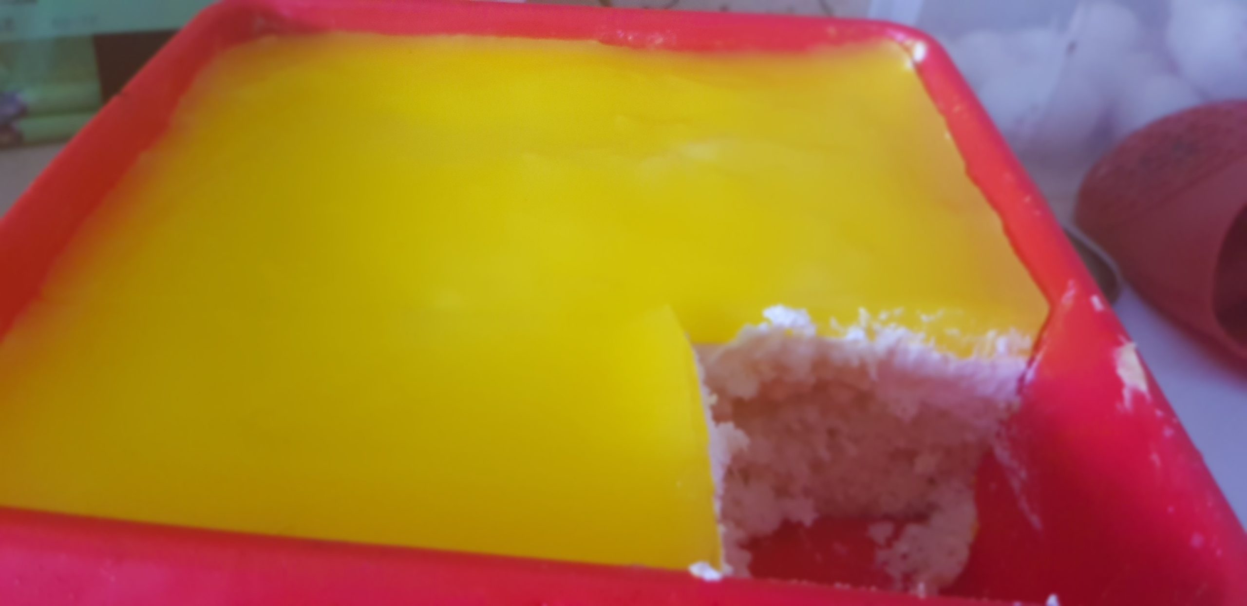 Hors feu, ajouter 4 gouttes de colorant jaune et laisser refroidir ce mélange dans un bol en verre au frigo. Des que le mélange est froid, ajouter sur le gâteau. Réserver 3 heures au frigo.