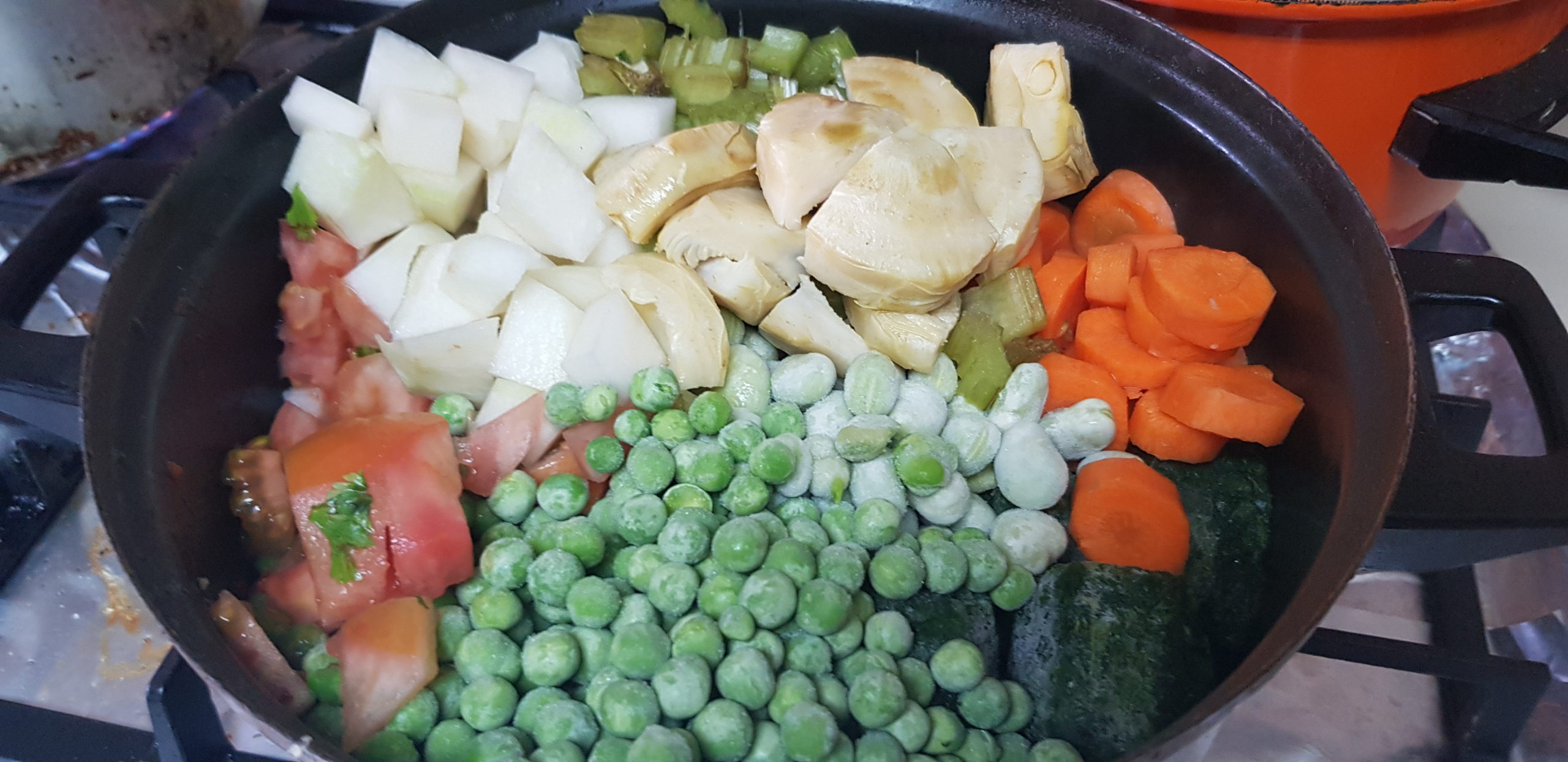Entre temps, faire revenir les oignons en lamelles, et l’ail, ajouter deux tomates concassées, les épinards, le persil, la coriandre fraîche, les carottes en rondelles, les navets en morceaux, les fèves, les petits pois, le choux coupé finement, les artichauts coupés en quatre, une branche de céleri en morceaux, l’épice de rose séchées, sel et poivre et paprika.