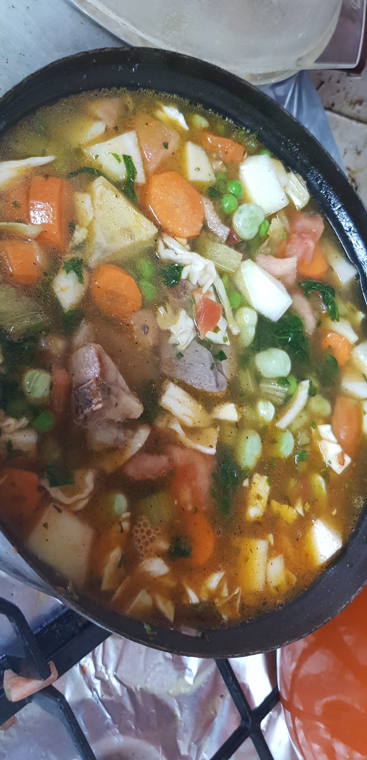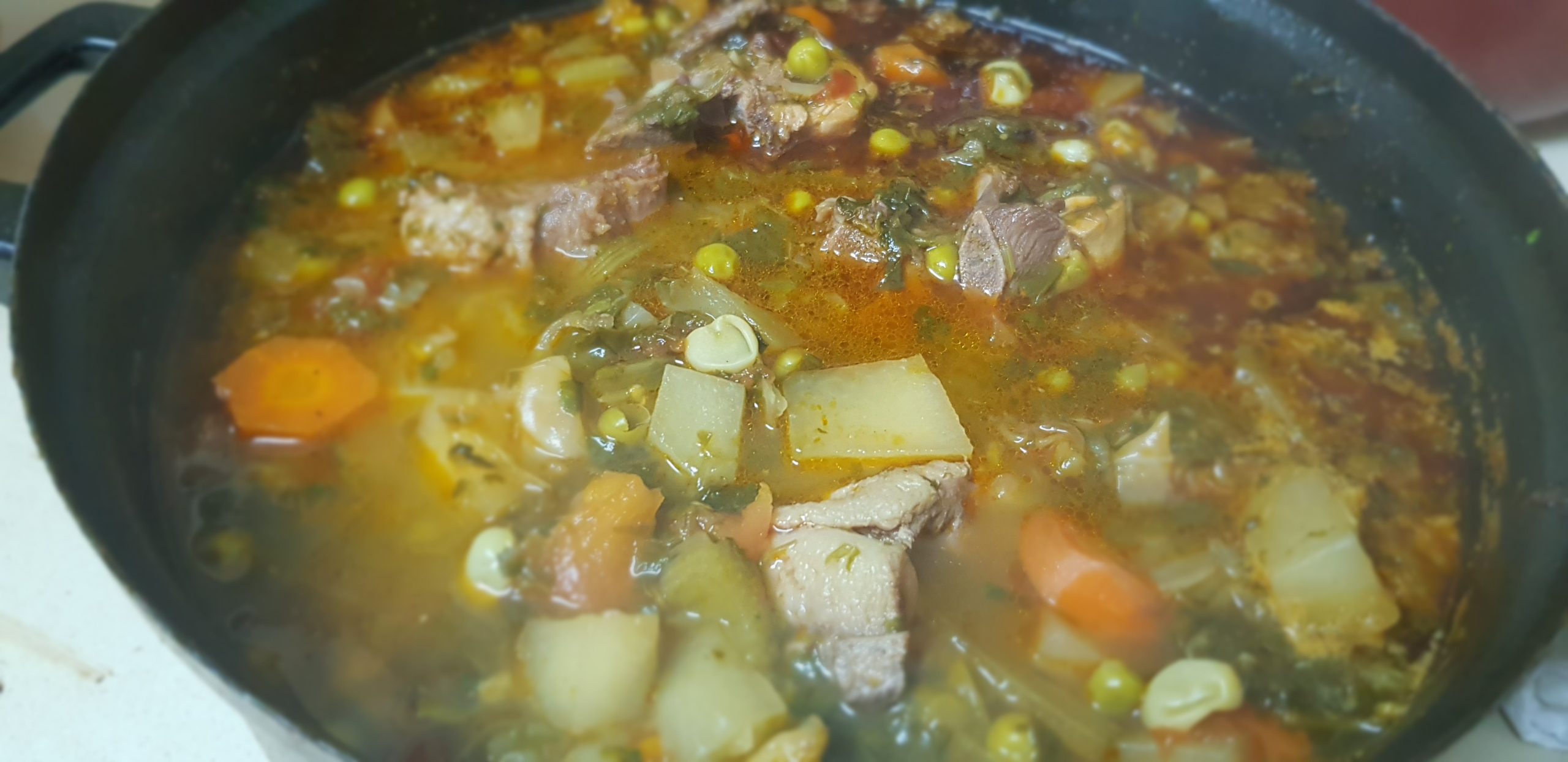 Laisser revenir les légumes et épices et ajouter petit à petit le jus de la viande et les morceaux de viande. Ajouter du bouillon jusqu’à 5 cm au dessus des légumes (max) et laisser mijoter 3 heures.