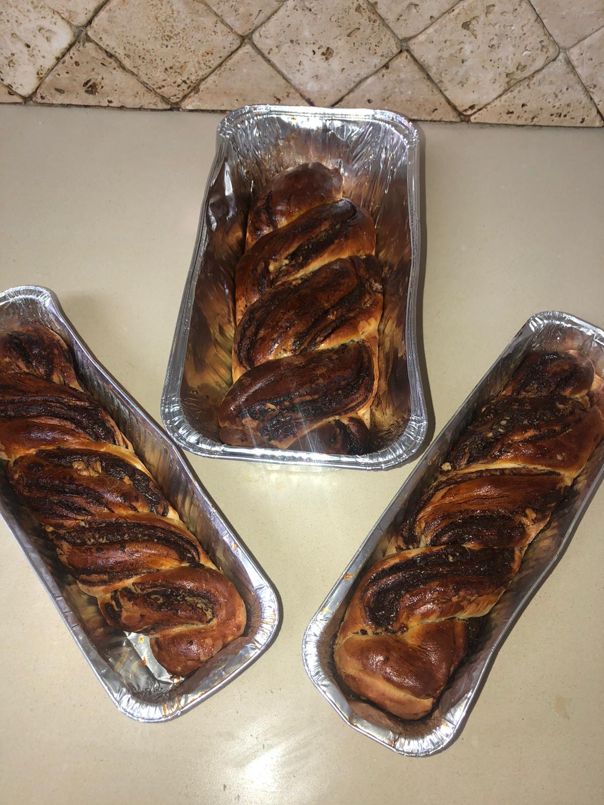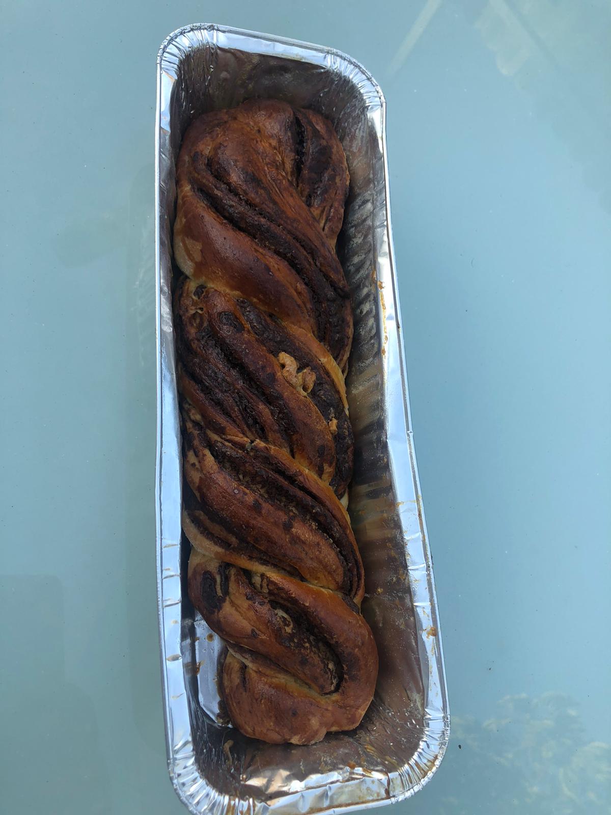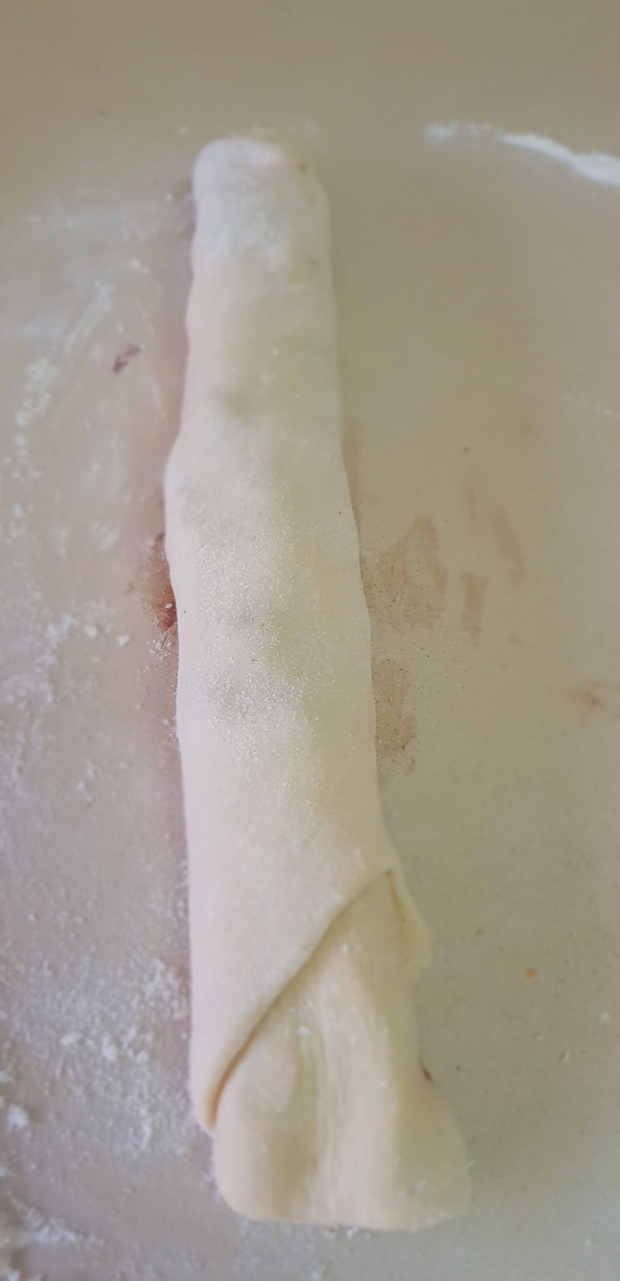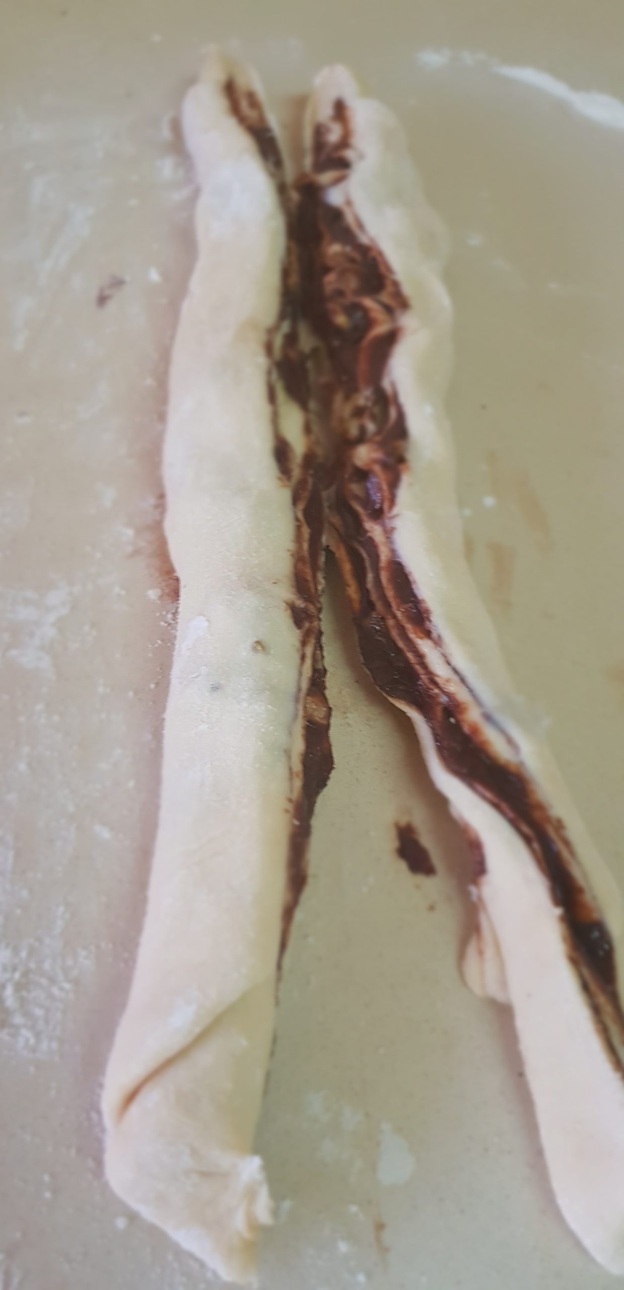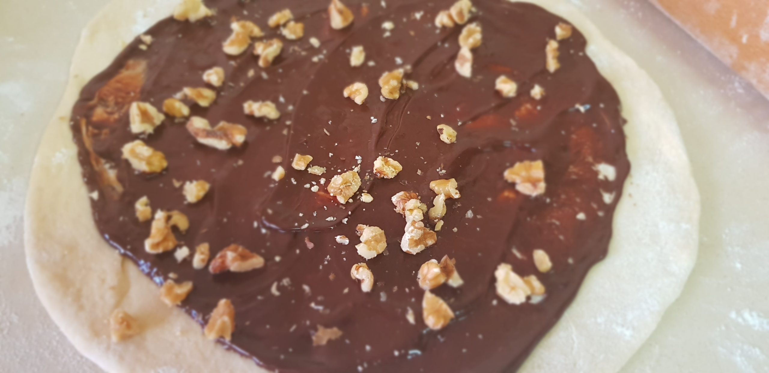 4 – Farinez bien votre plan de travail, étalez votre pâte pour obtenir un rectangle et étalez la garniture de chocolat en laissant les bords pour ne pas que le mélange déborde . Rouler la pâte. Vous pouvez ajouter des noix de pécan hachées ou des noix ou pignon !
