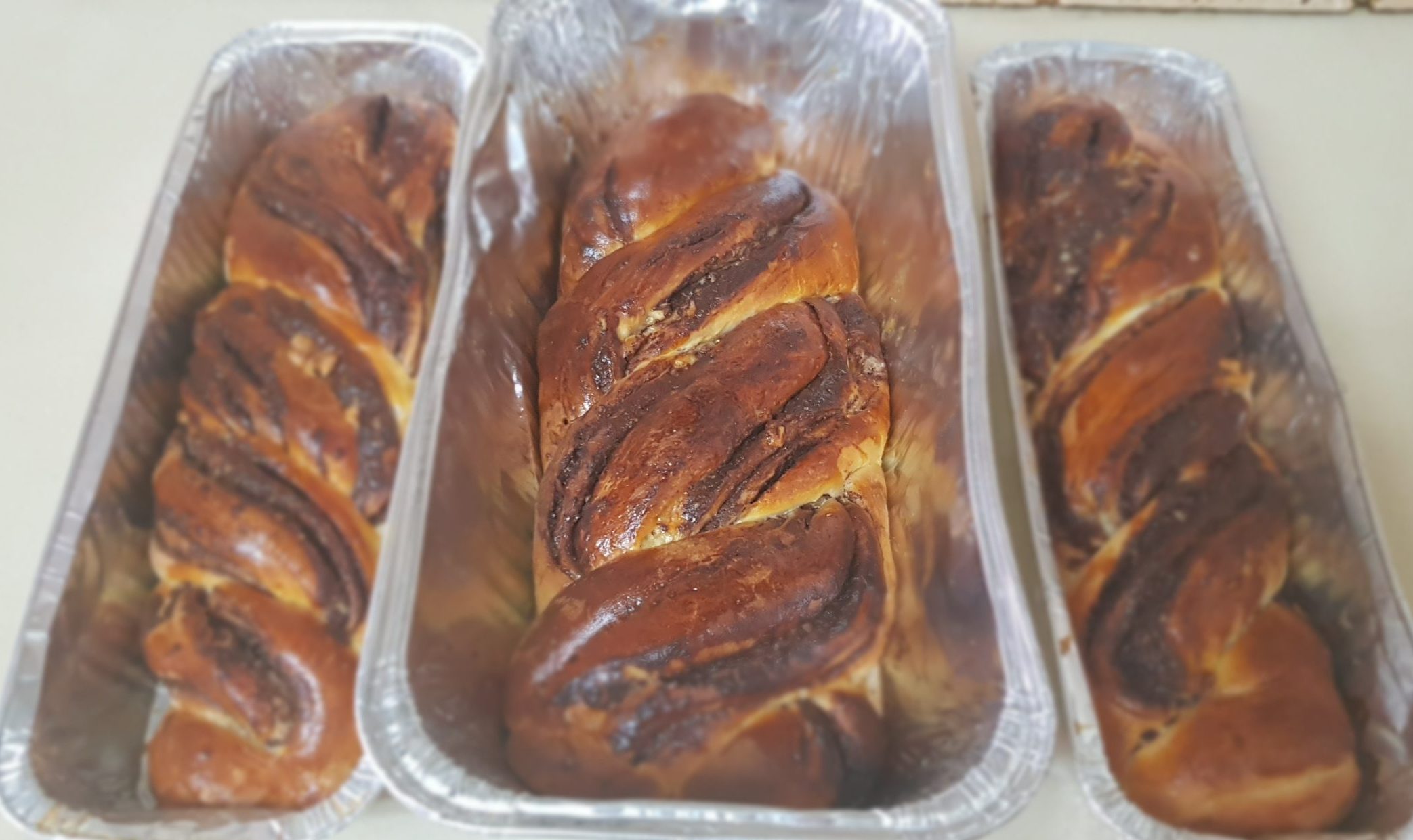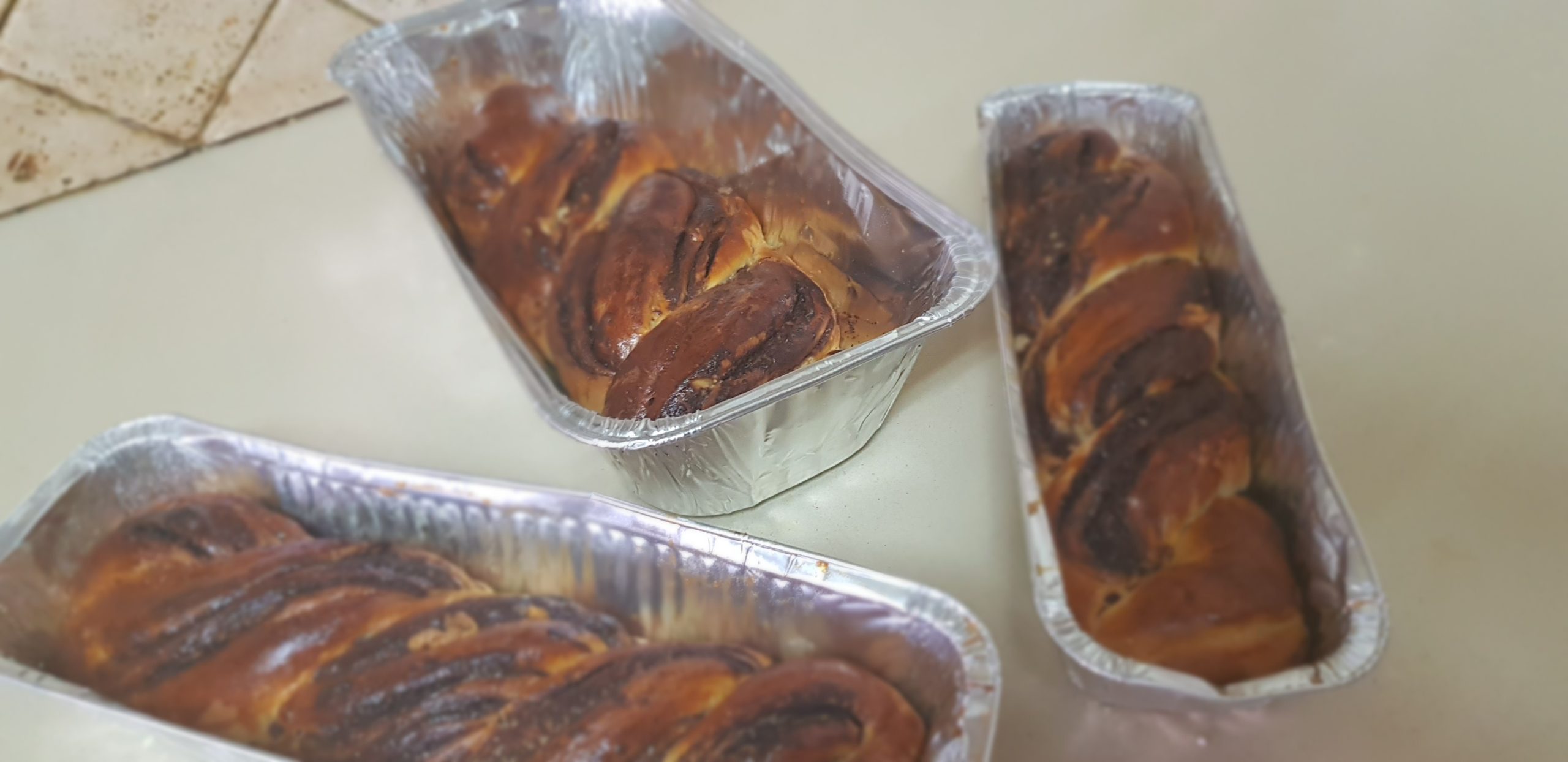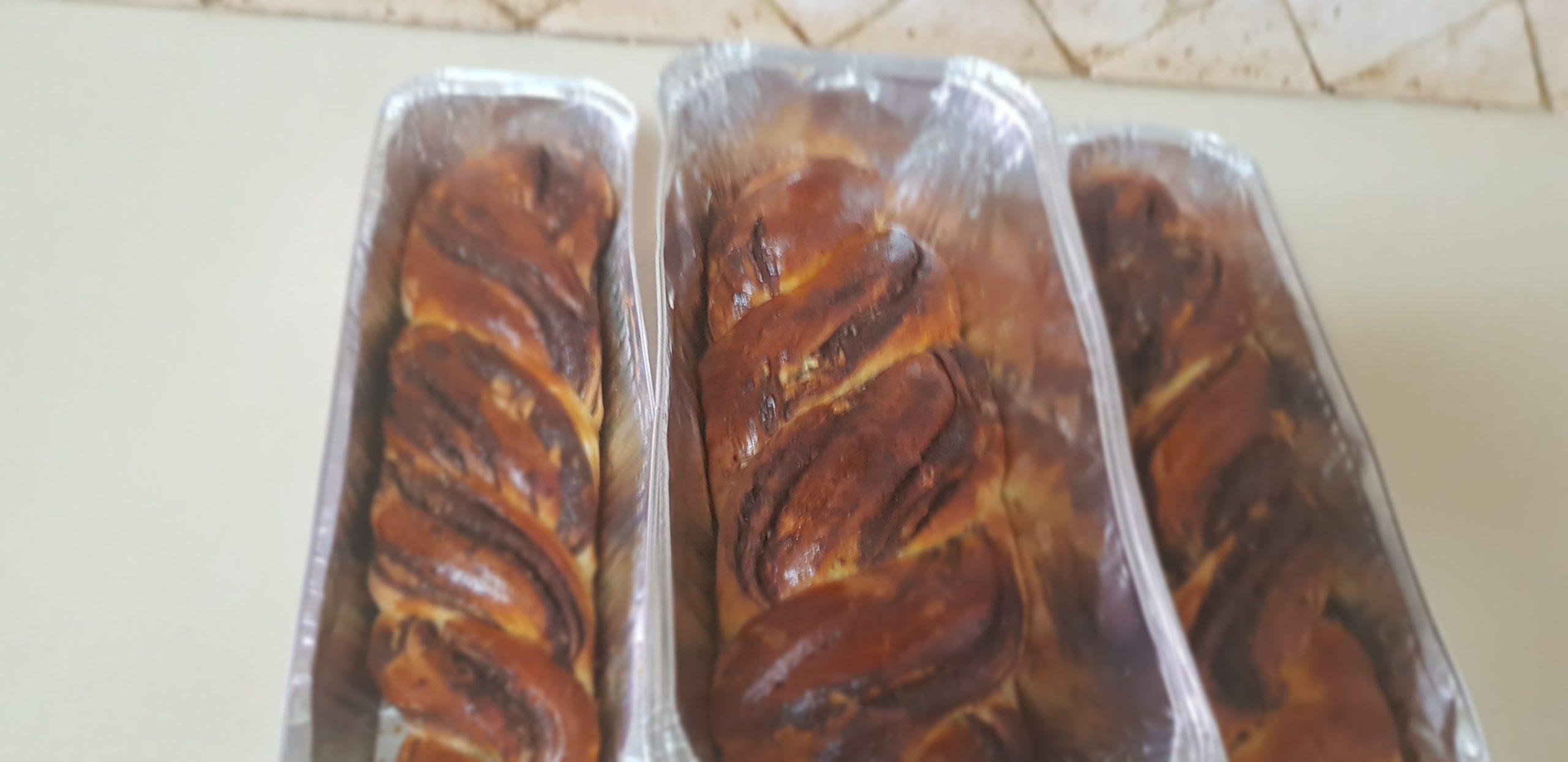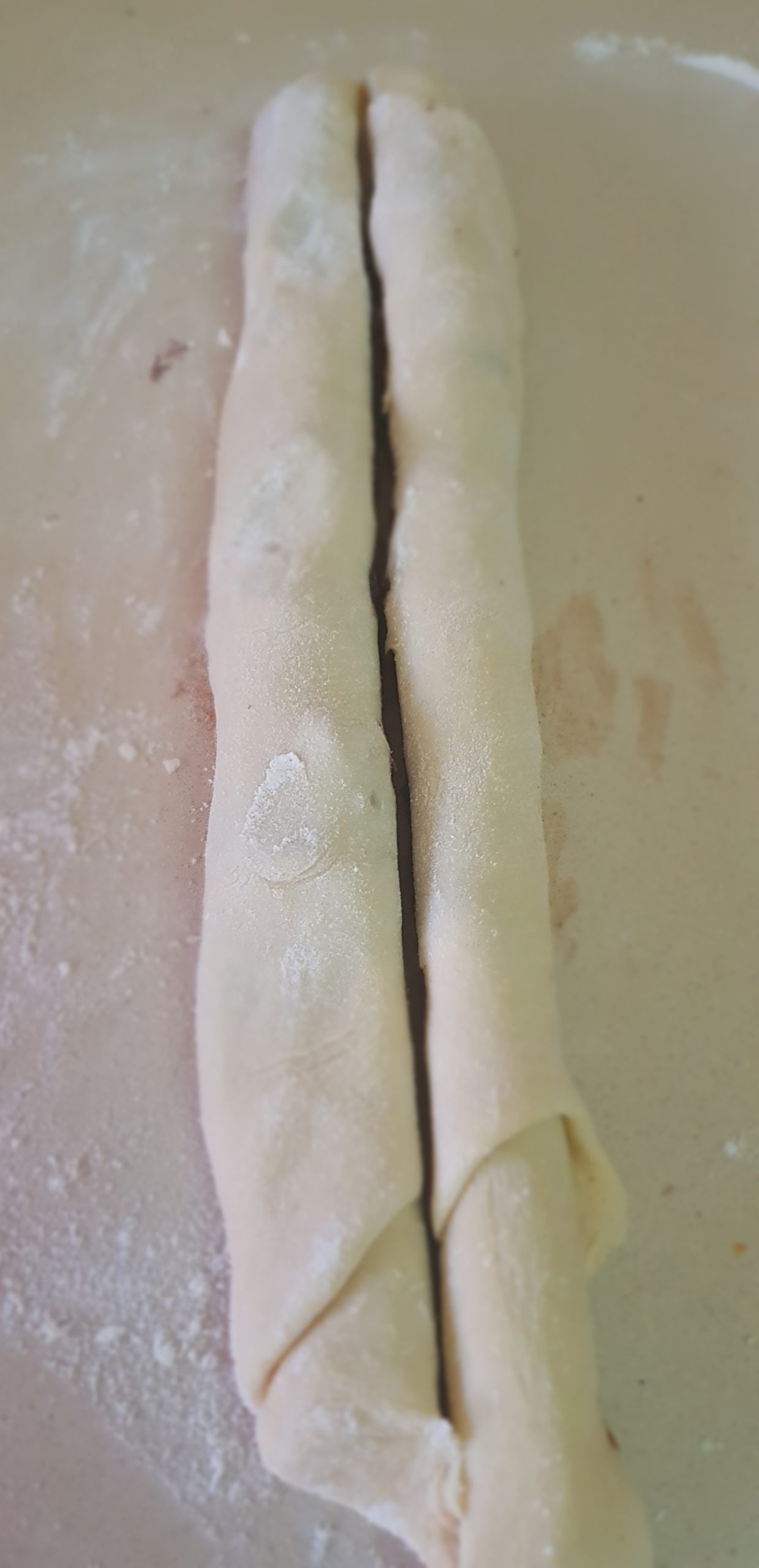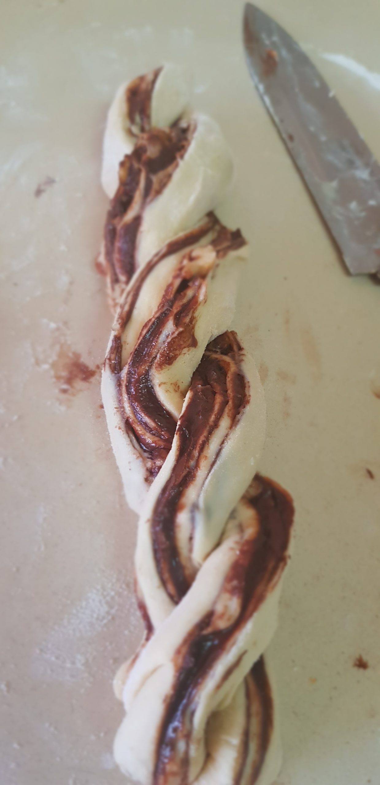 5 – Roulez la pâte, former un long boudin, coupez les extrémités et recoupez votre boudin dans la longueur pour avoir deux parties, face chocolat en haut et terminer en tressant vos deux morceaux de pâte.