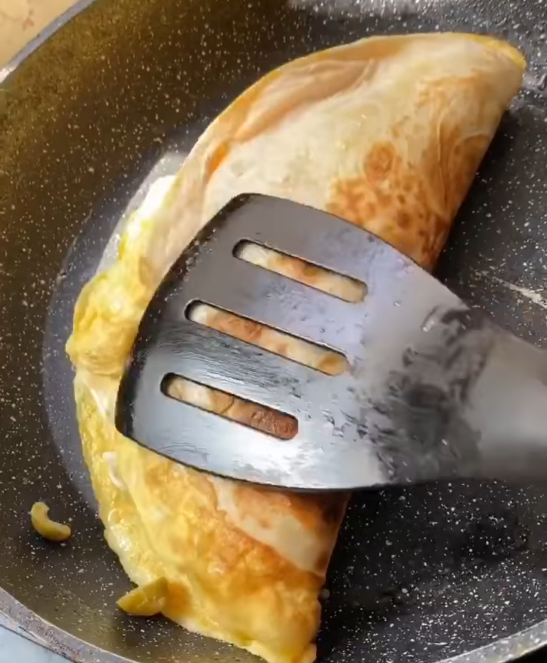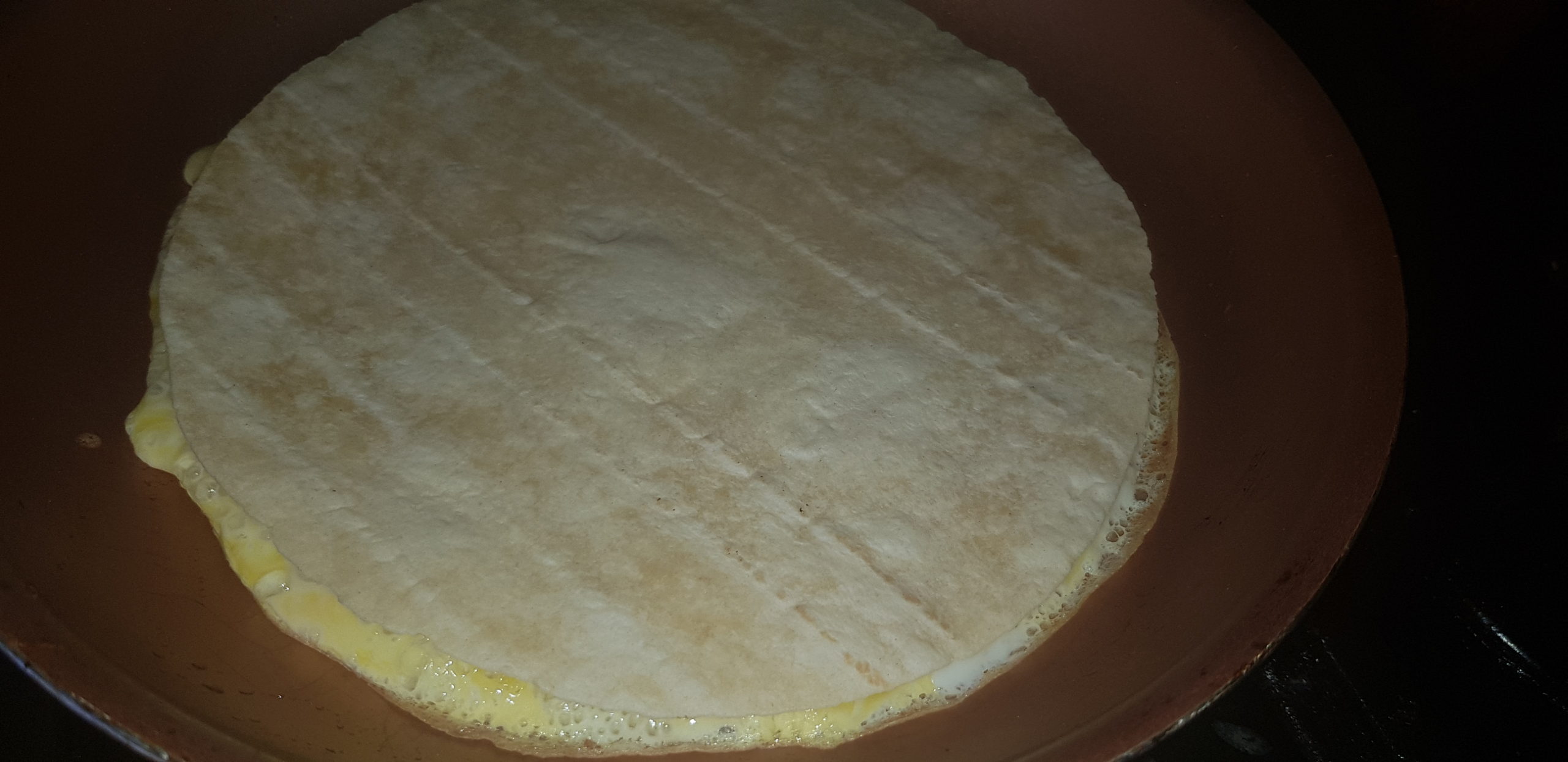Battre deux oeufs avec un peu de sel et poivre, et verser dans une poêle. Laisser cuire 30 secondes, placer dessus une feuille de Takos, puis avec une spatule, retourner le tout.