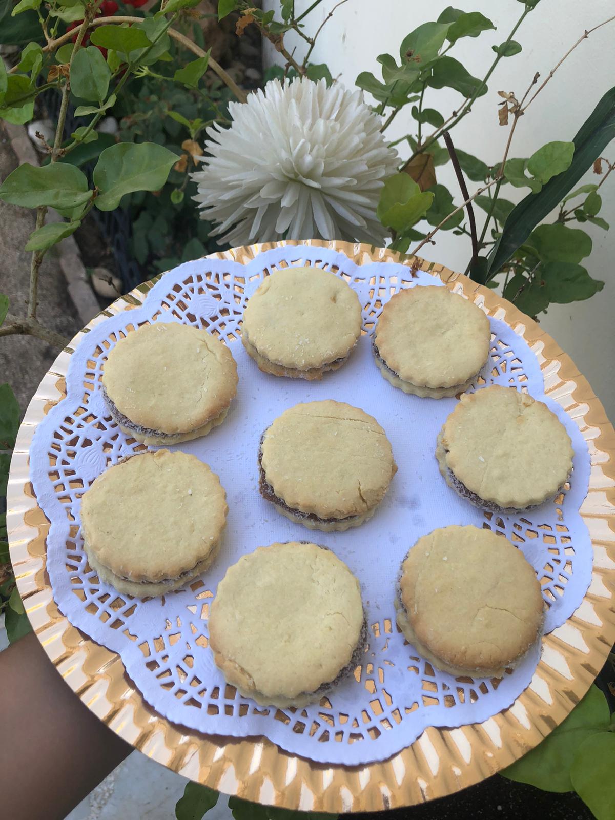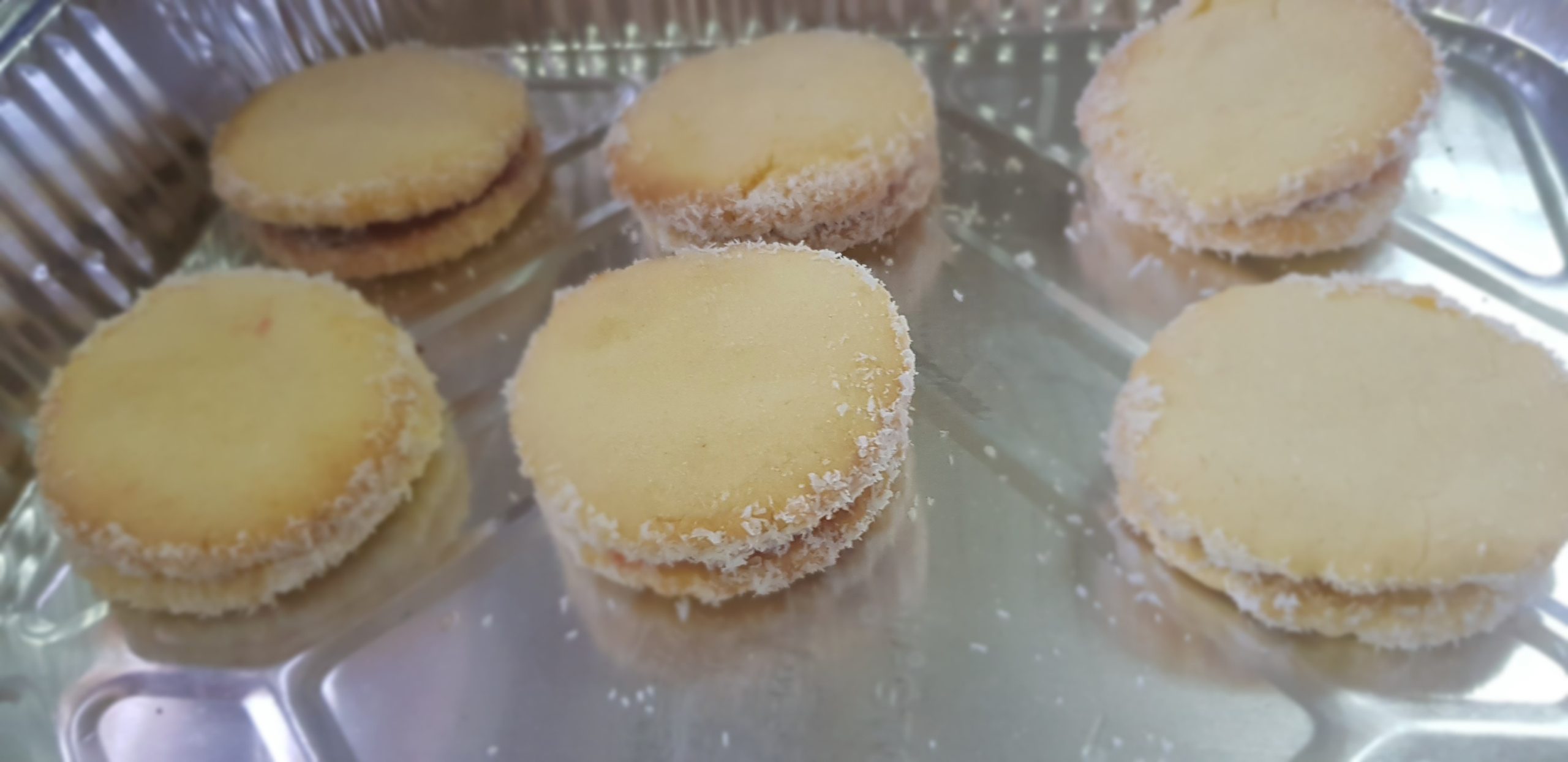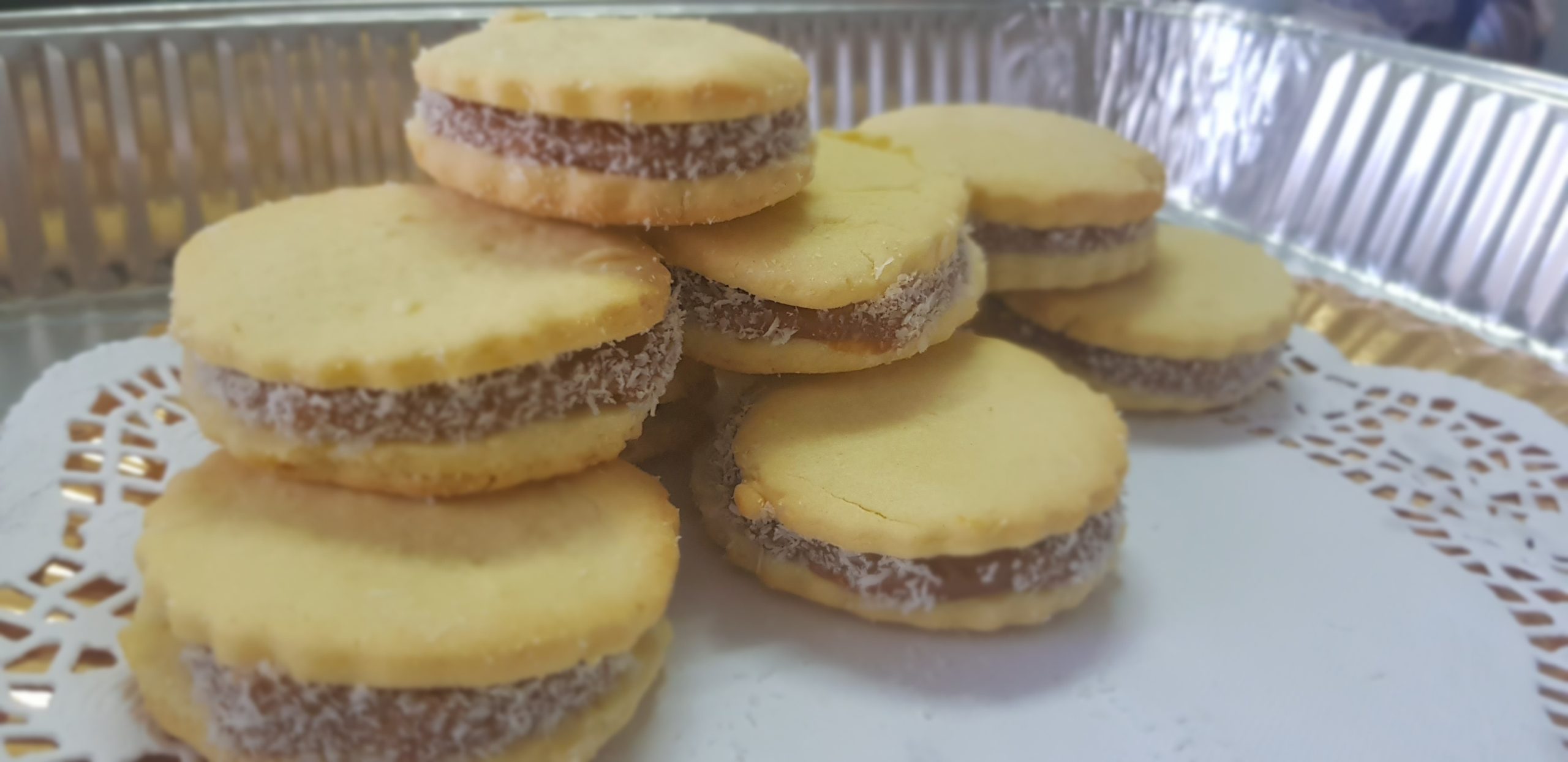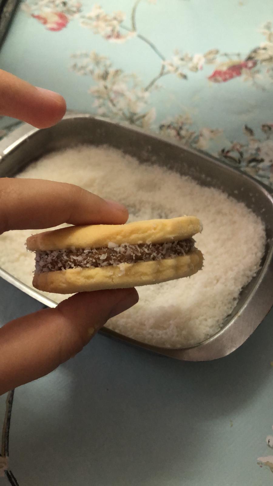 Des que les biscuits seront refroidis, garnir d’une 1/2 cuillère à café de Ribat Halav , ajouter le deuxième biscuit puis la noix de coco.