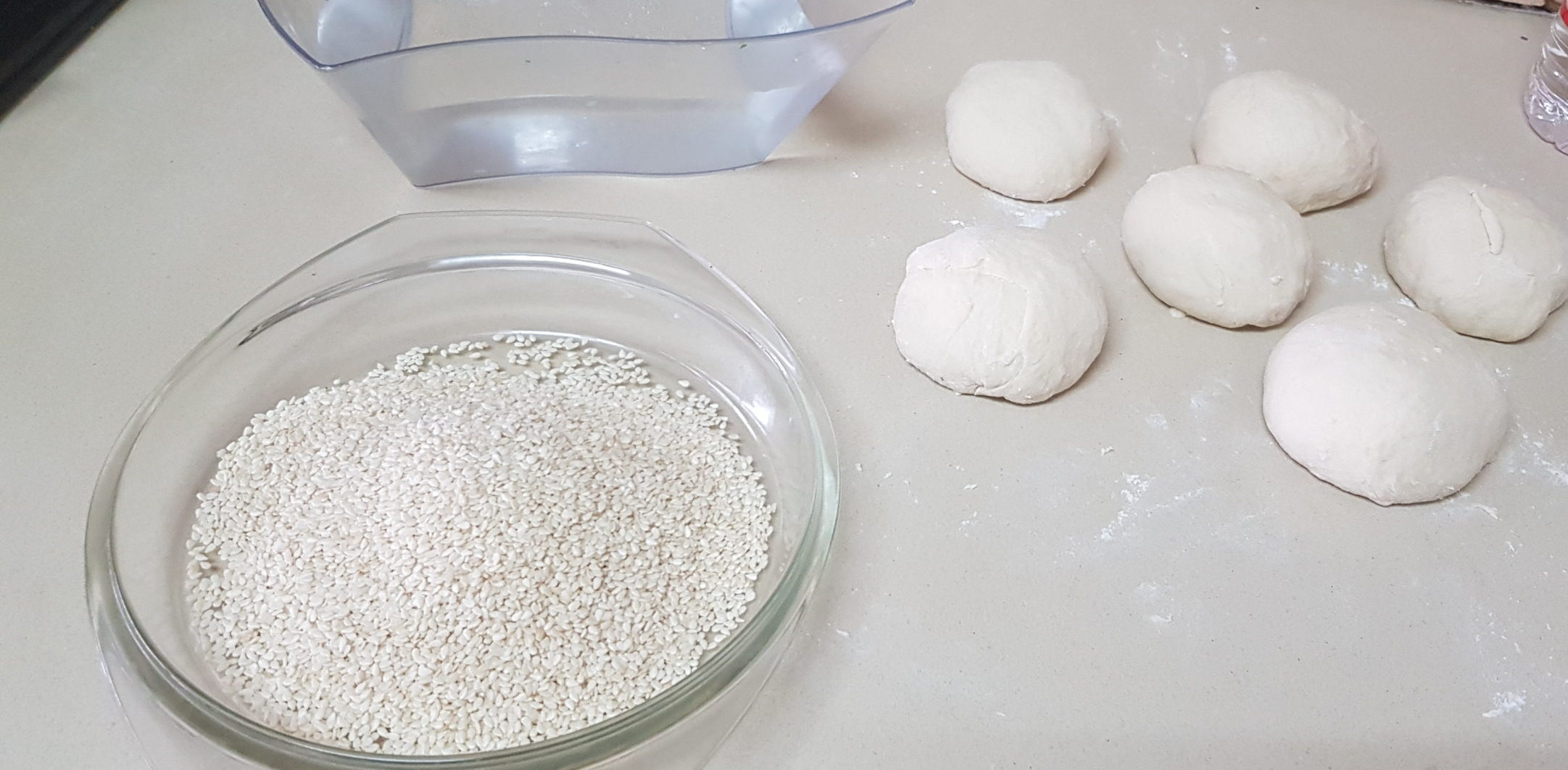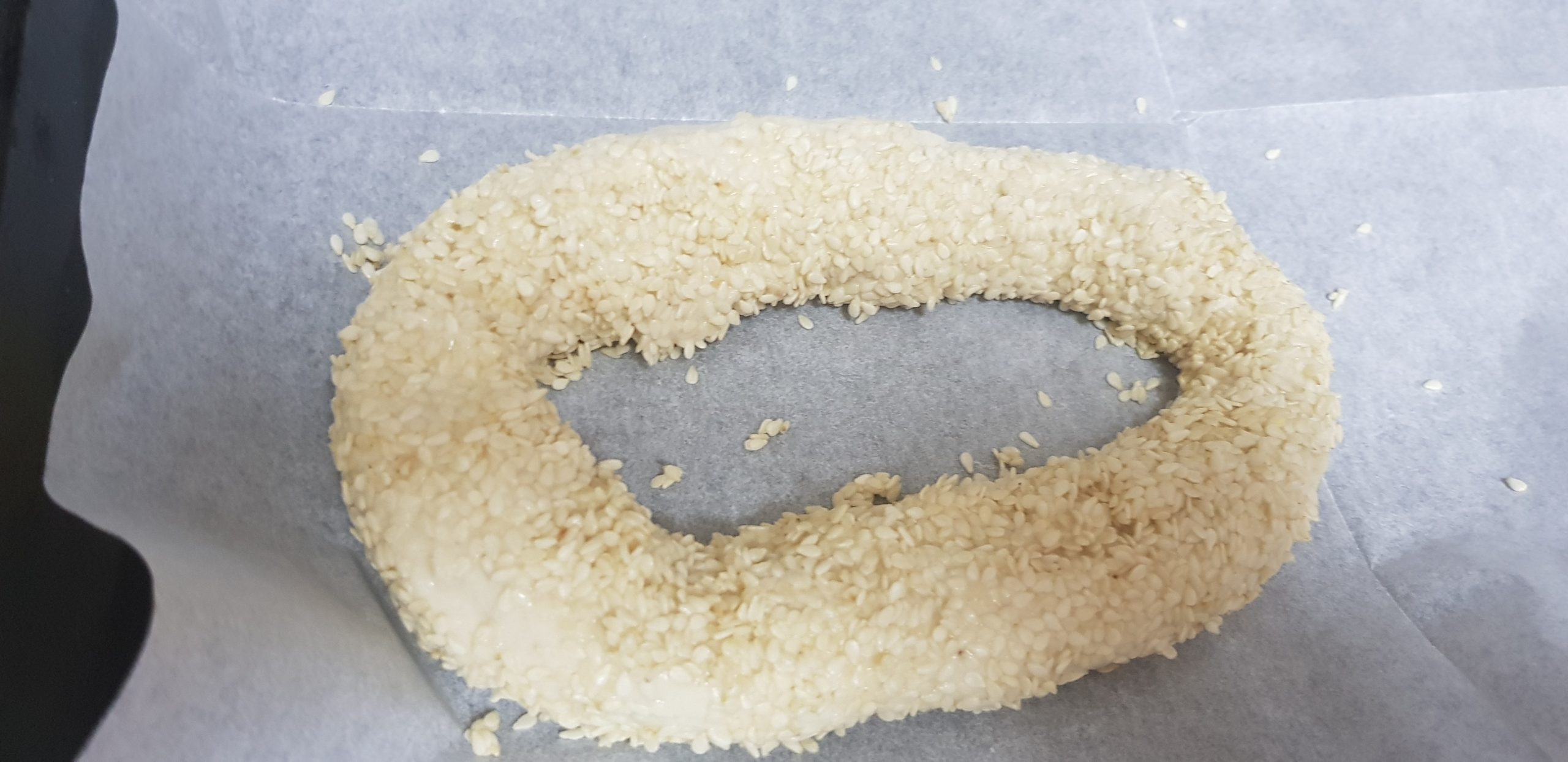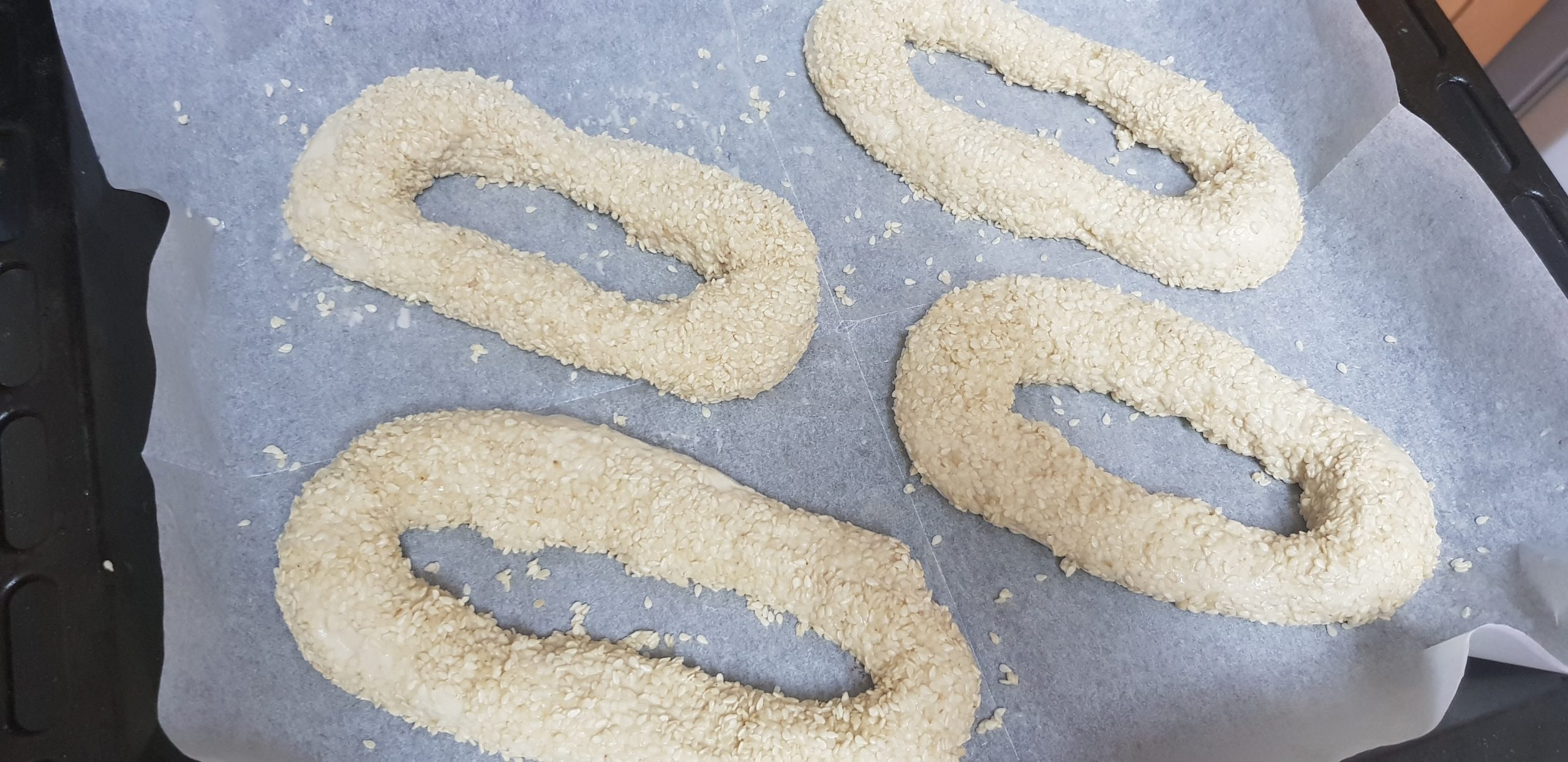4. Trempez les bagels dans l’eau froide puis trempez-les dans les graines de sésame. Placez les bagels sur un essai doublé de papier sulfurisé. Couvrir et laisser reposer 20 minutes.