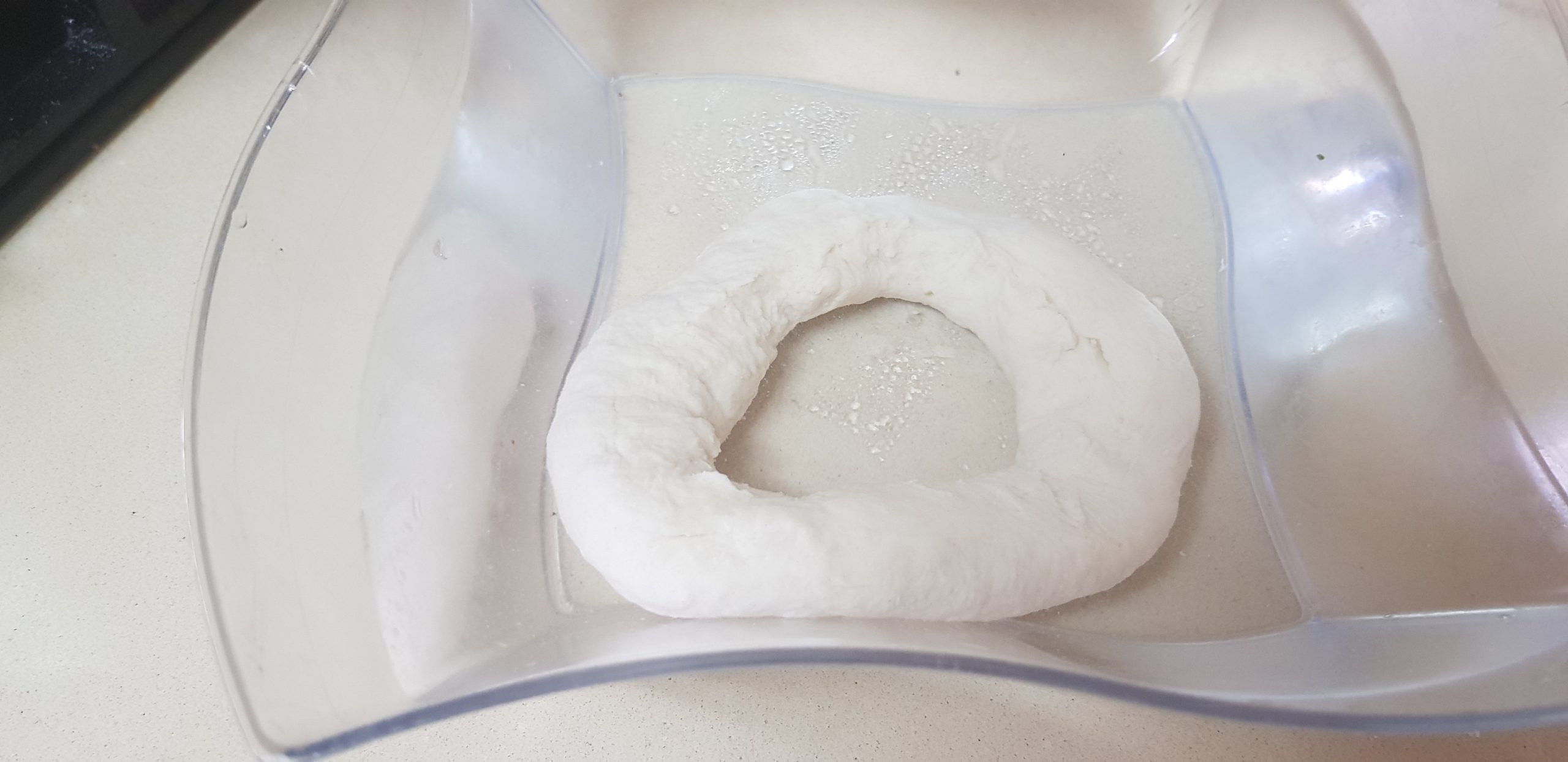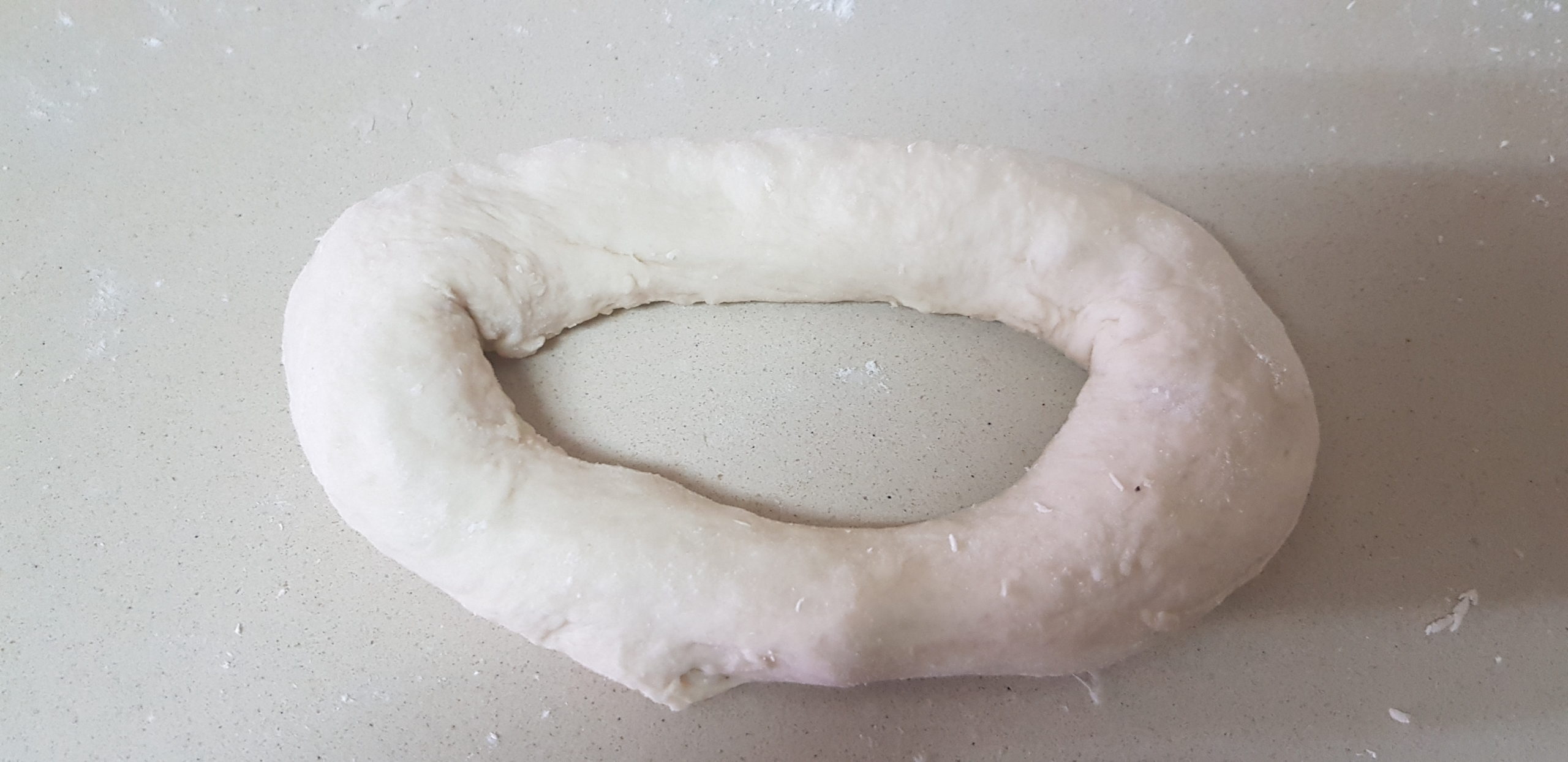 3. Lorsque la pâte a levé, coupez-la et retournez-la sur un comptoir légèrement fariné. Divisez en 6 morceaux égaux. Façonnez chaque pièce en boule. Creusez vos pouces au centre pour créer un trou et étirez la pâte vers l’extérieur pour créer un anneau ovale.