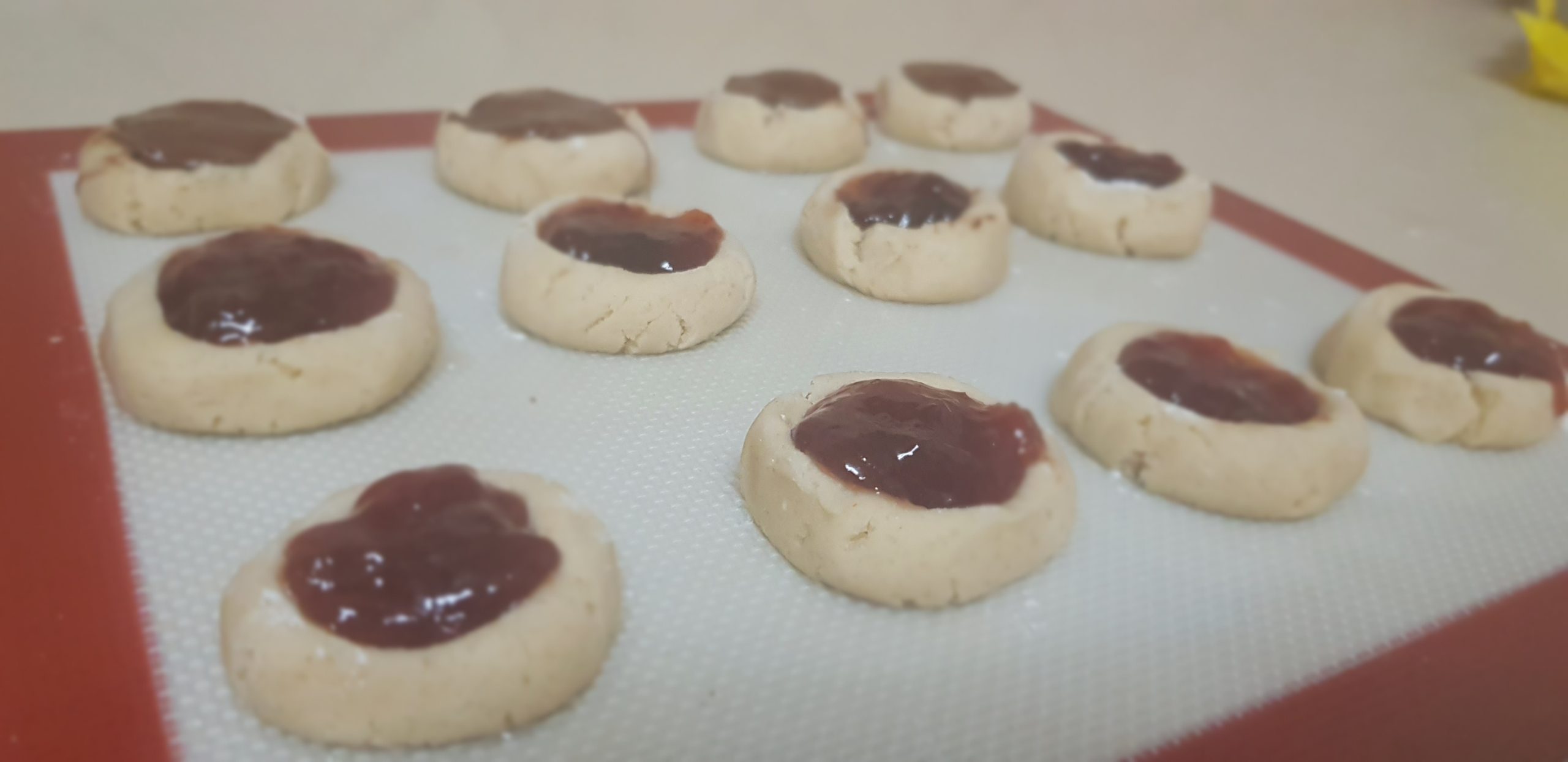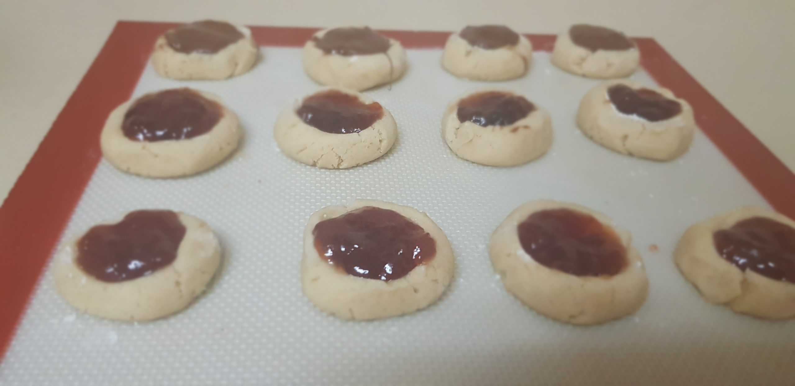 5 – Placez ensuite les boules sur des plaques à pâtisserie préparées. Aplatissez légèrement les boules puis faites une petit puit avec votre pouce ou avec le dos d’une cuillère dosette. À ce stade, si la pâte est trop molle, réfrigérer pendant 30 minutes. Ensuite, remplissez chacun de biscuits à la confiture.