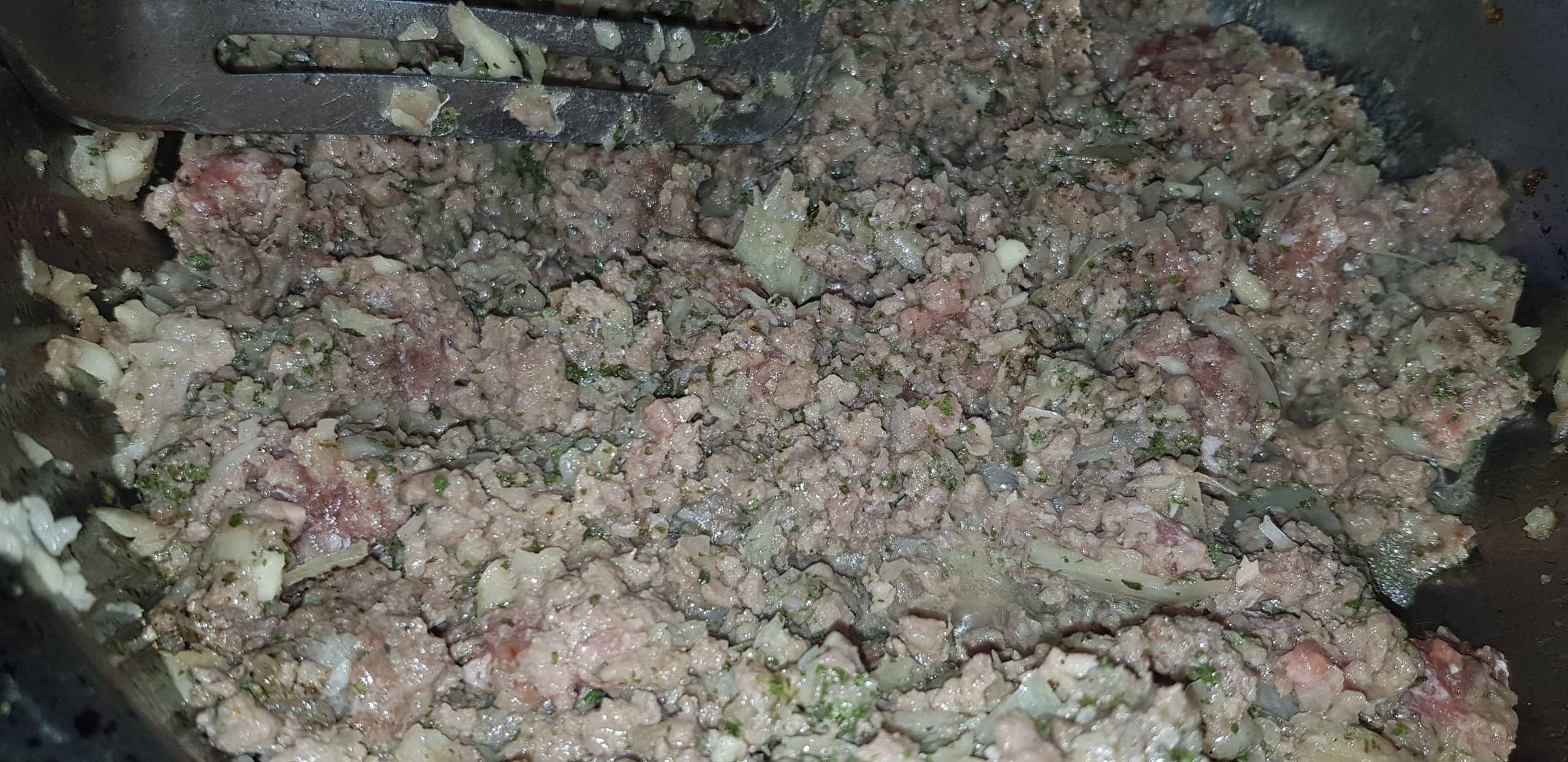 Faire revenir la viande hachée, l’oignon haché, l’ail écrasé et l’huile , ensuite ajouter le sel et les épices et laisser cuire.