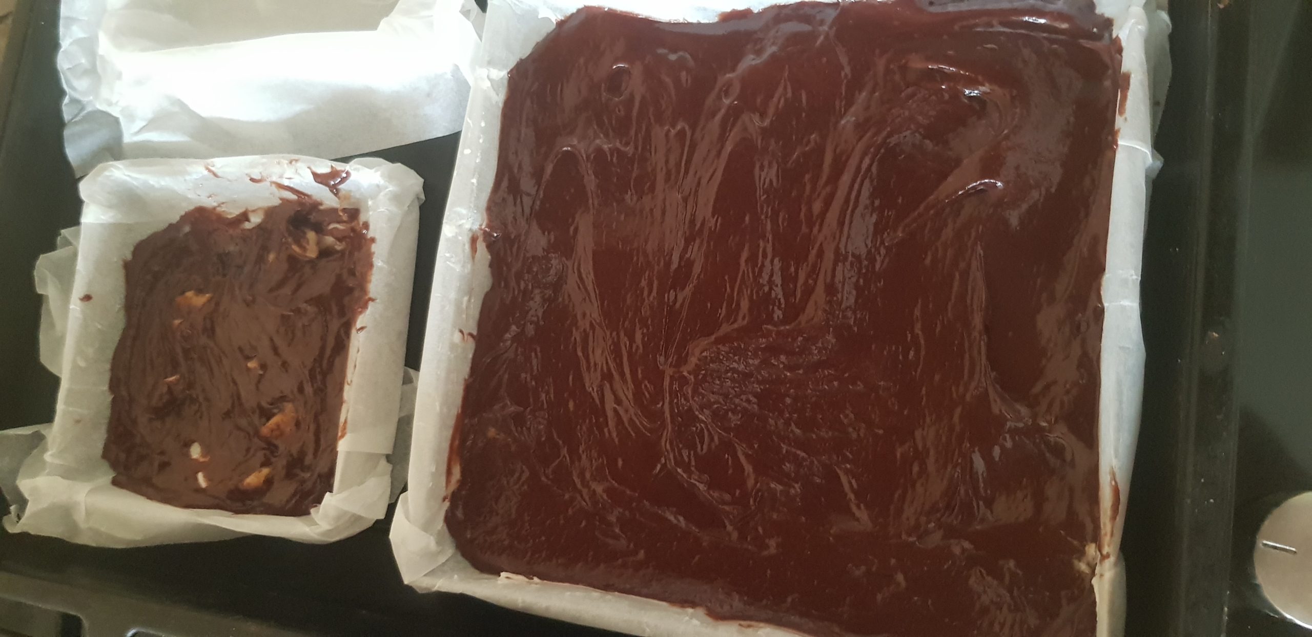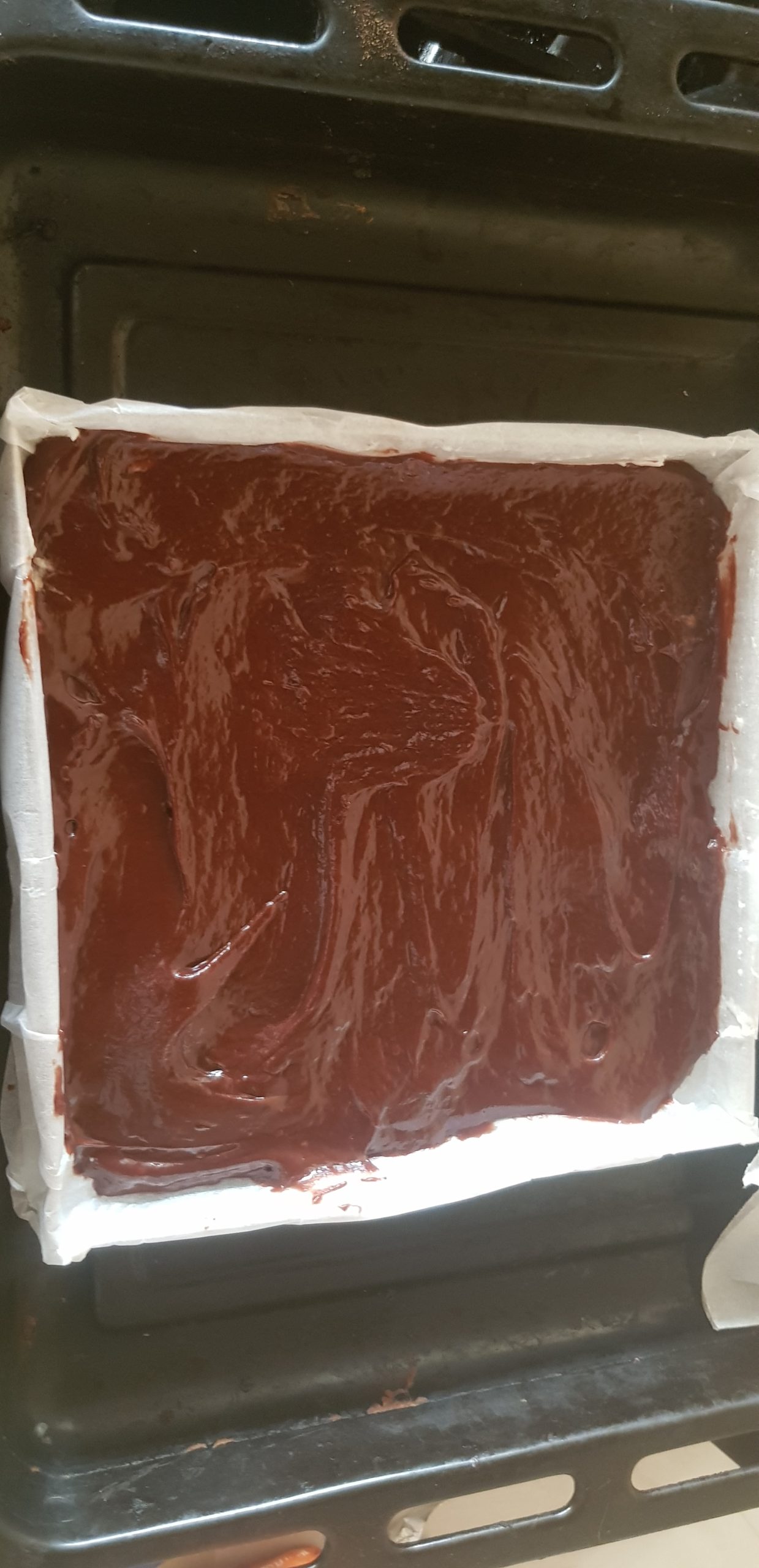 1. Préchauffer le four à 180C. Tapisser un plat de cuisson carré de 20 cm de papier sulfurisé et ajouter un beu de beurre ou margarine pour graisser le plat. Mettre de côté.