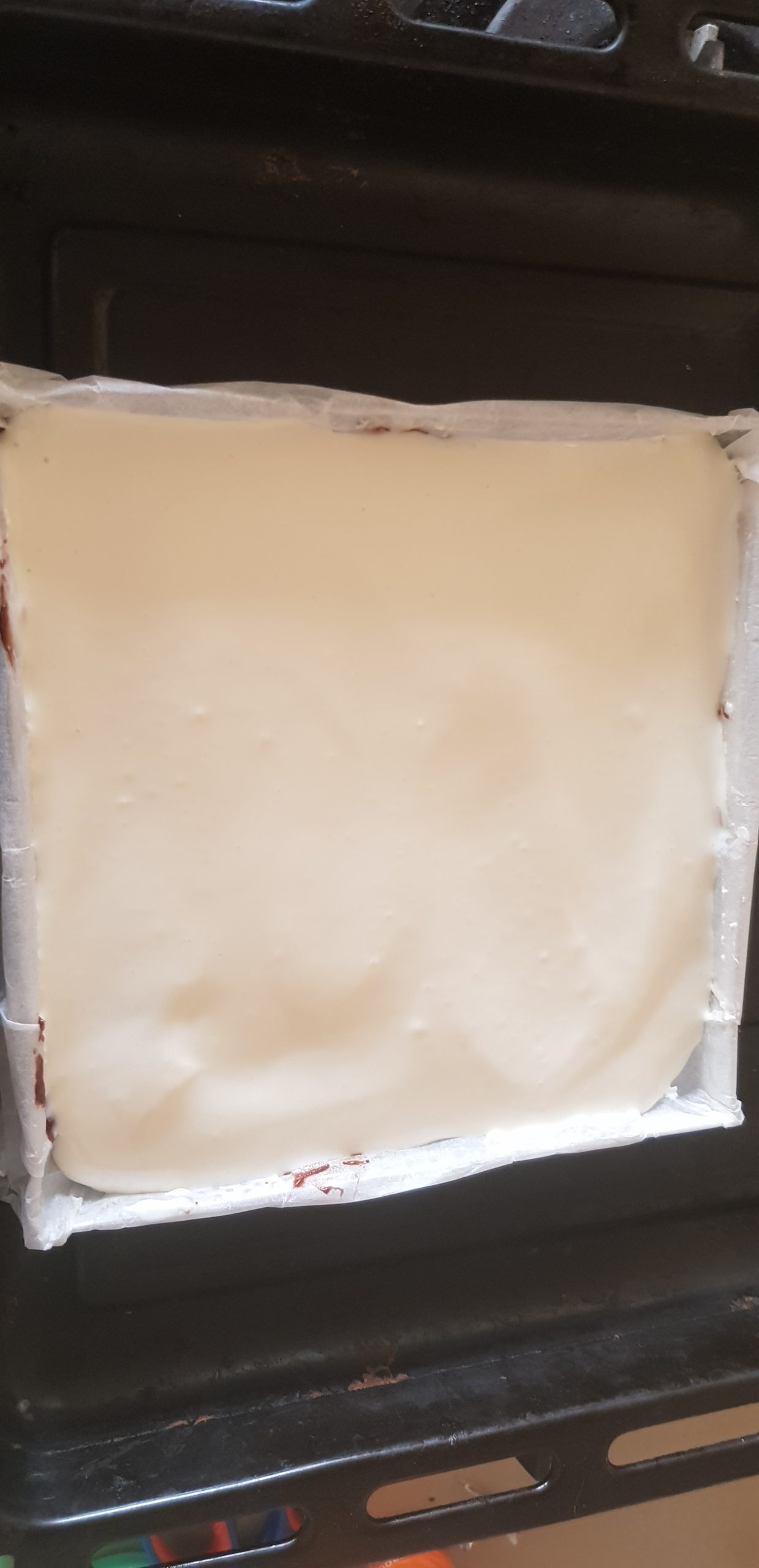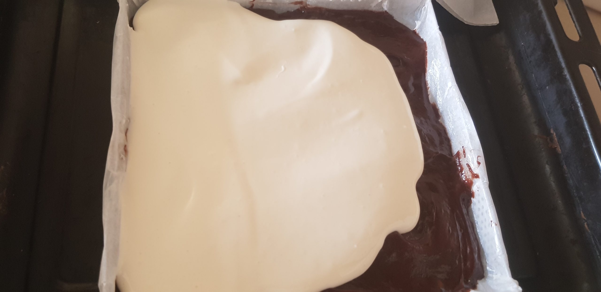 8. Versez le mélange de fromage à la crème sur la couche de brownie.