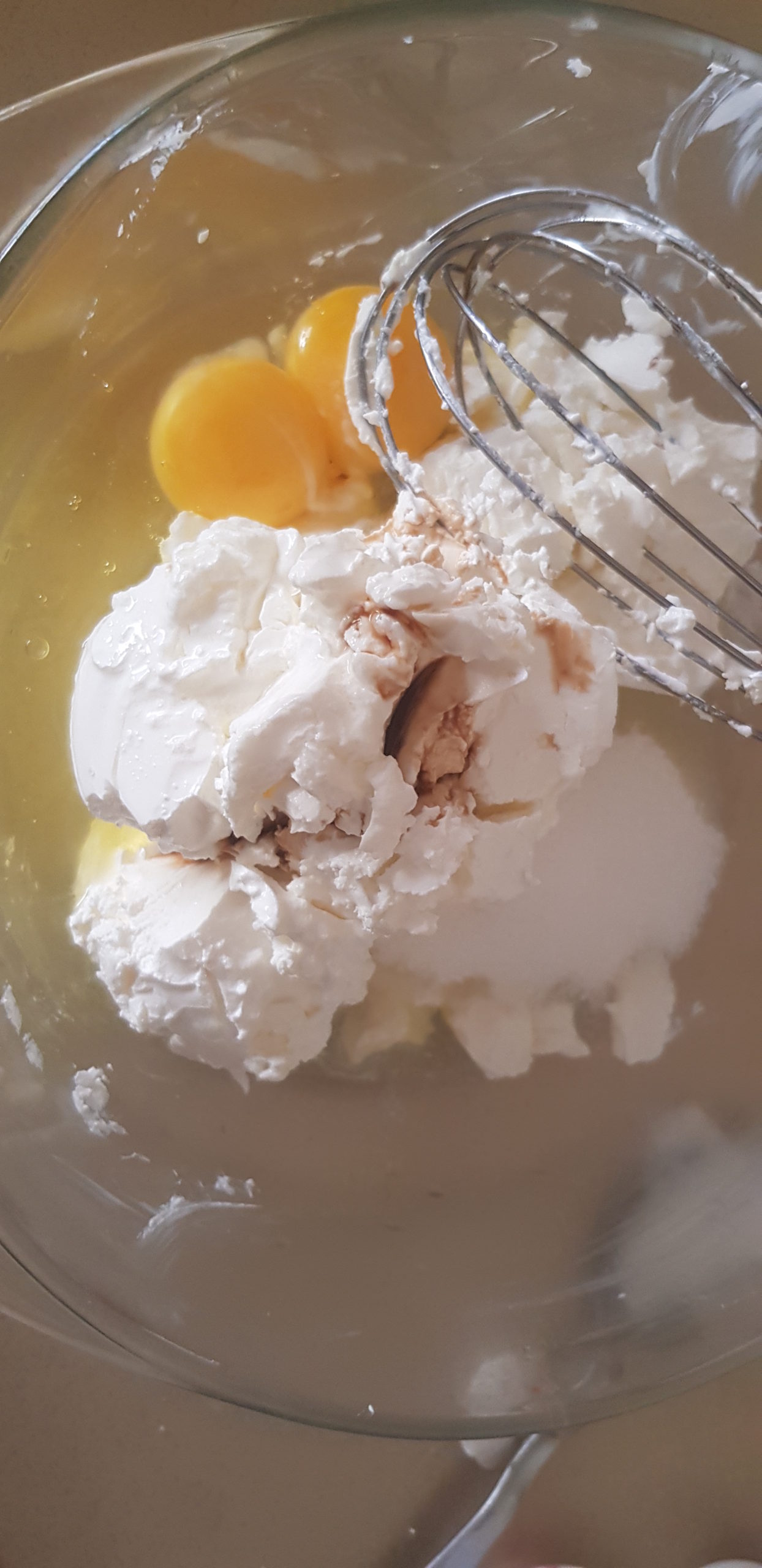7. Dans un bol, fouetter le fromage à la crème, le sucre, l’œuf et l’extrait de vanille.