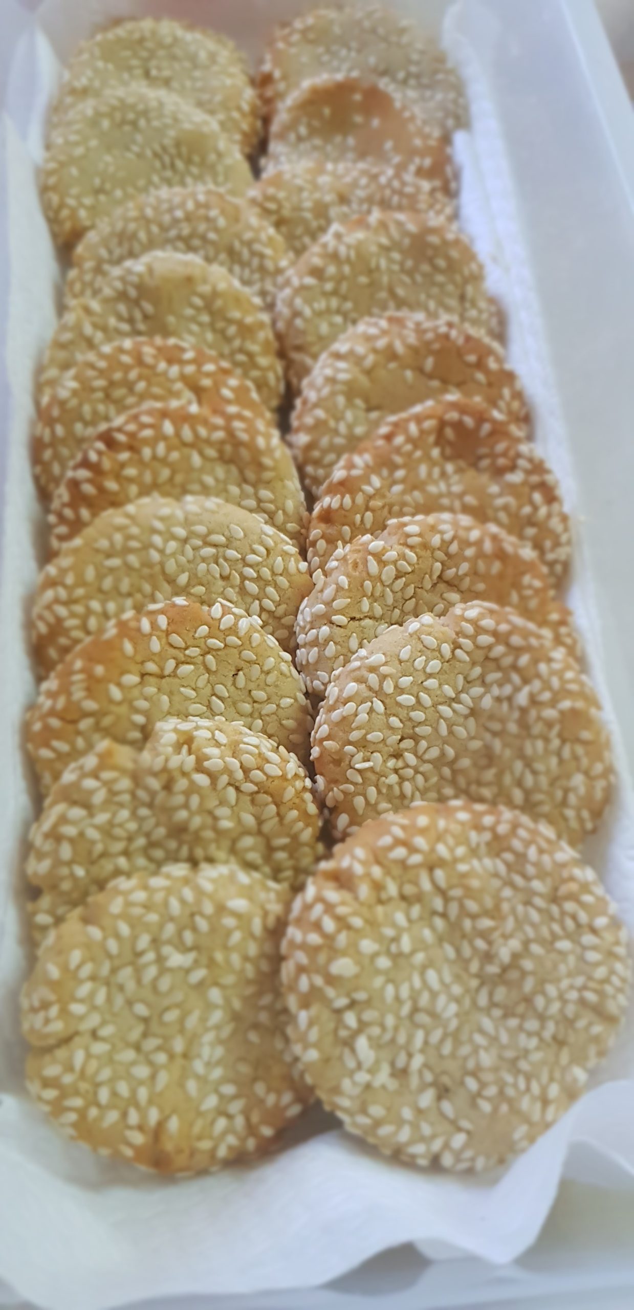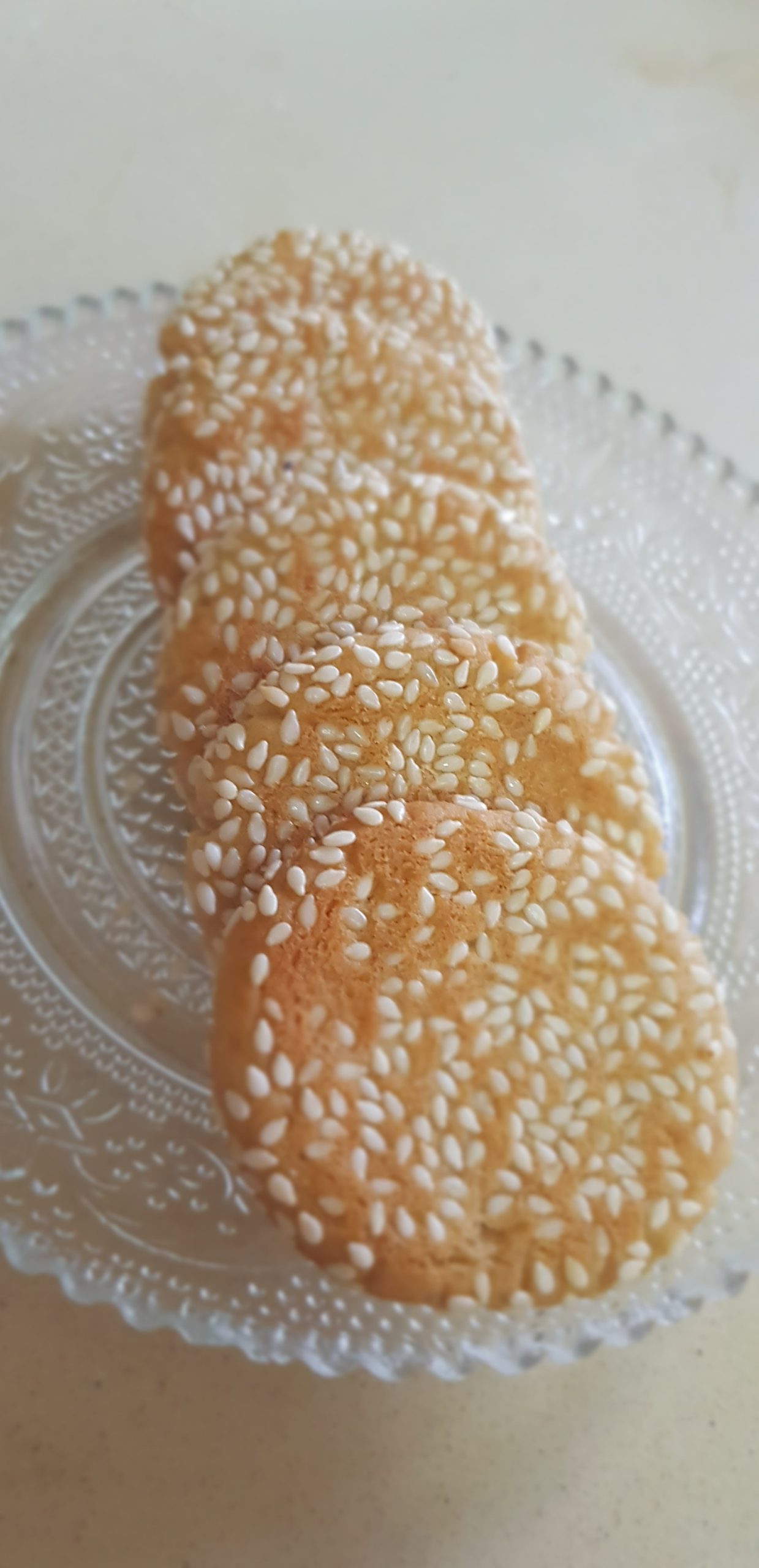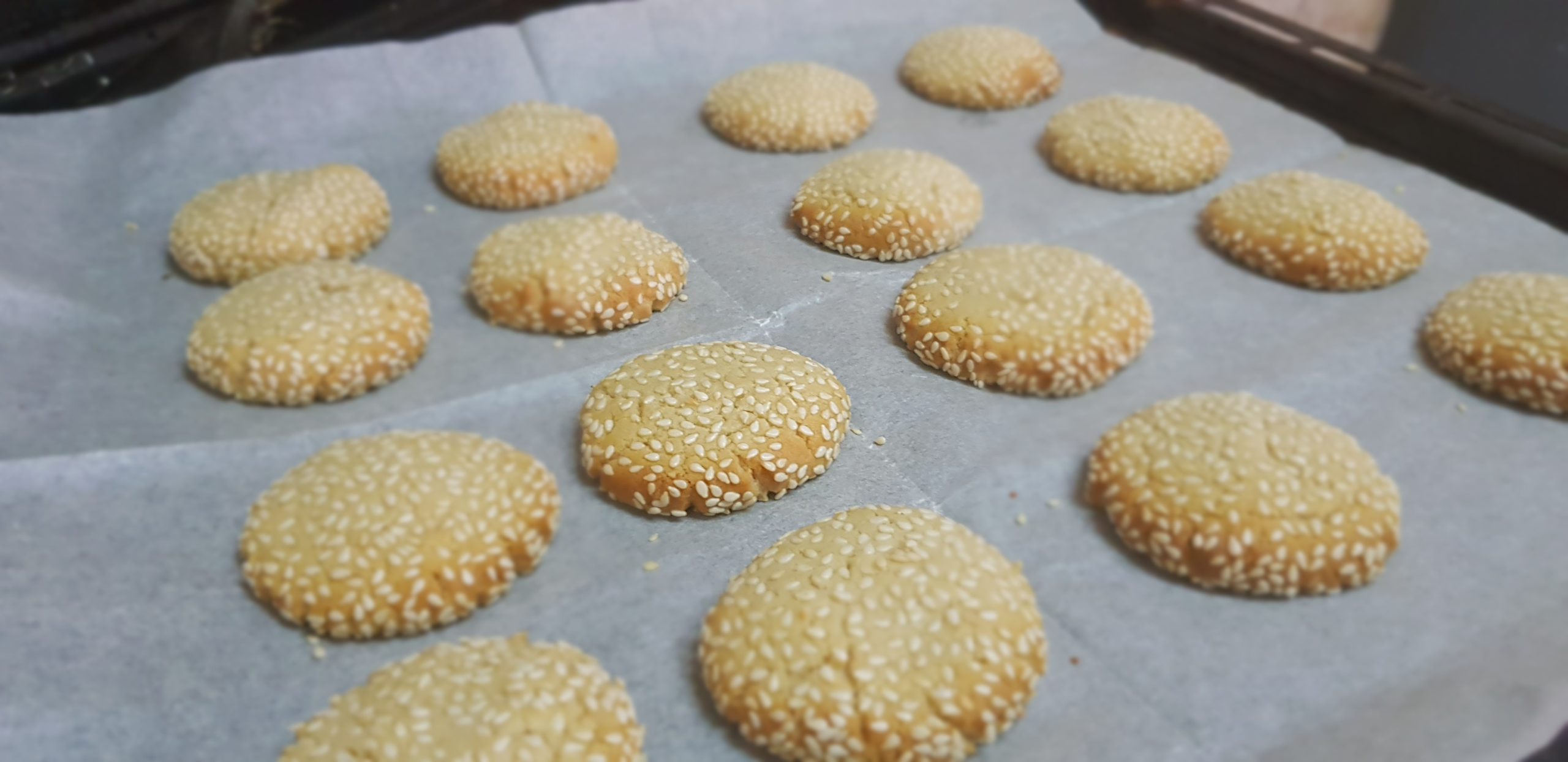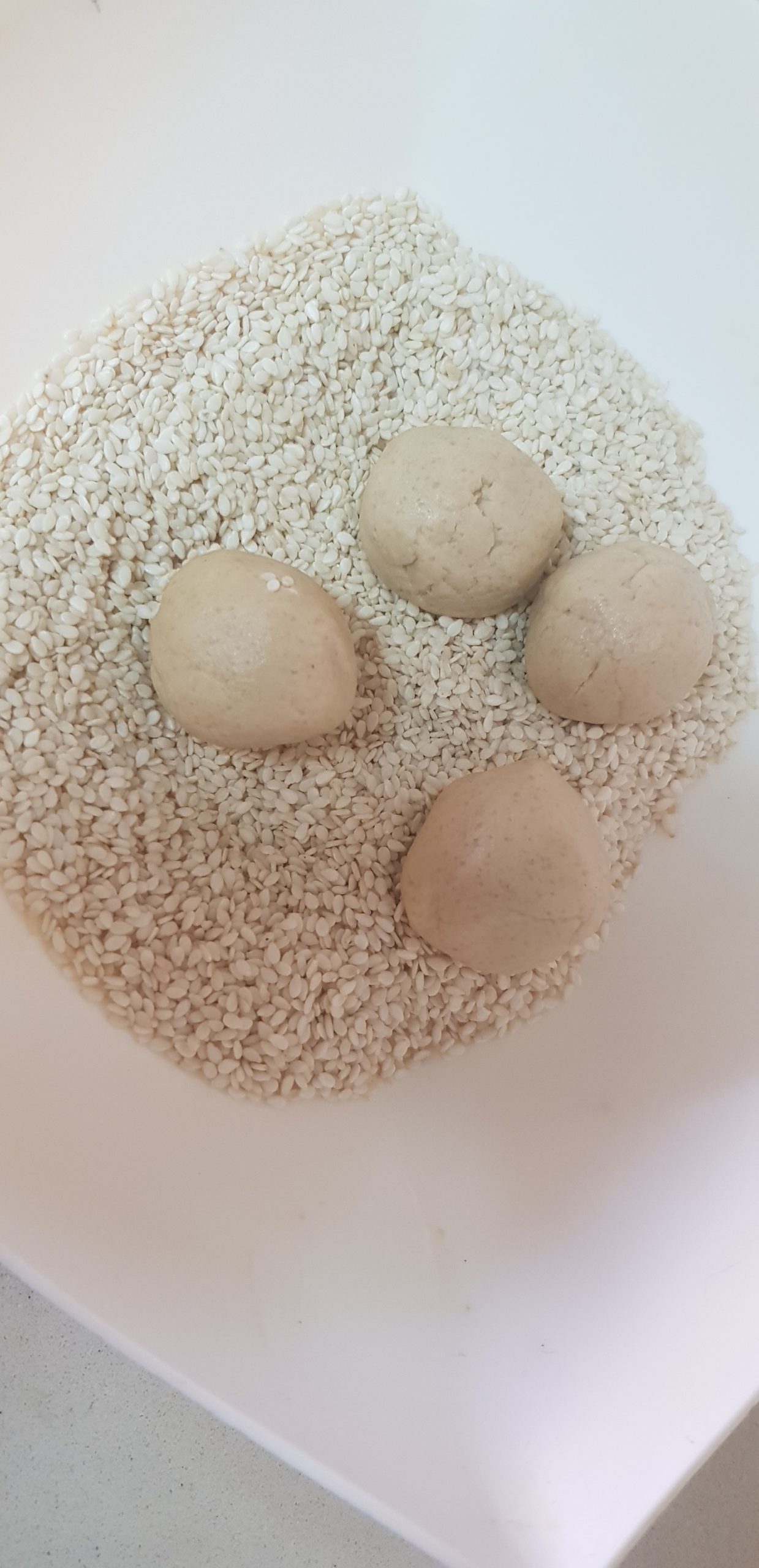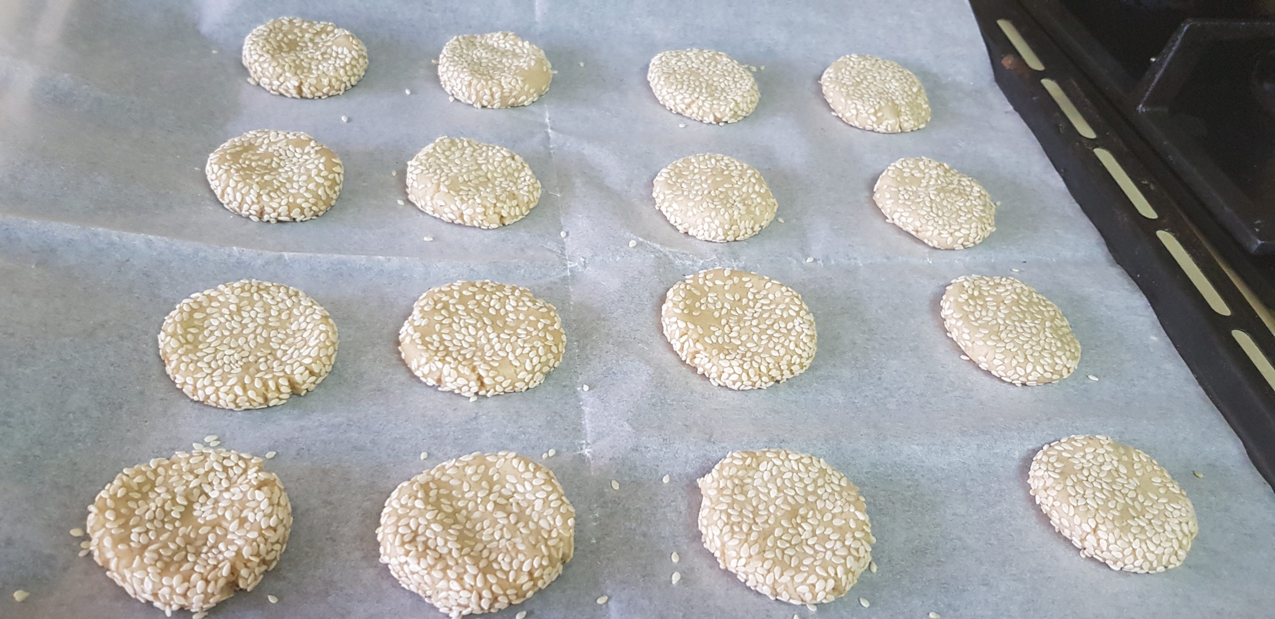 5. Façonner une boule, puis rouler dans les graines de sésame et aplatir les biscuits en disques.