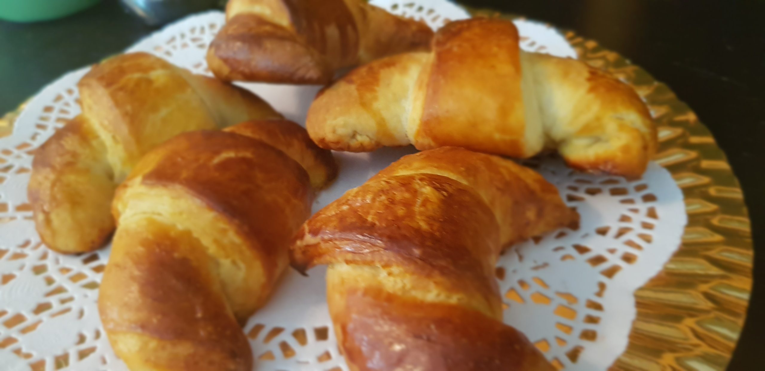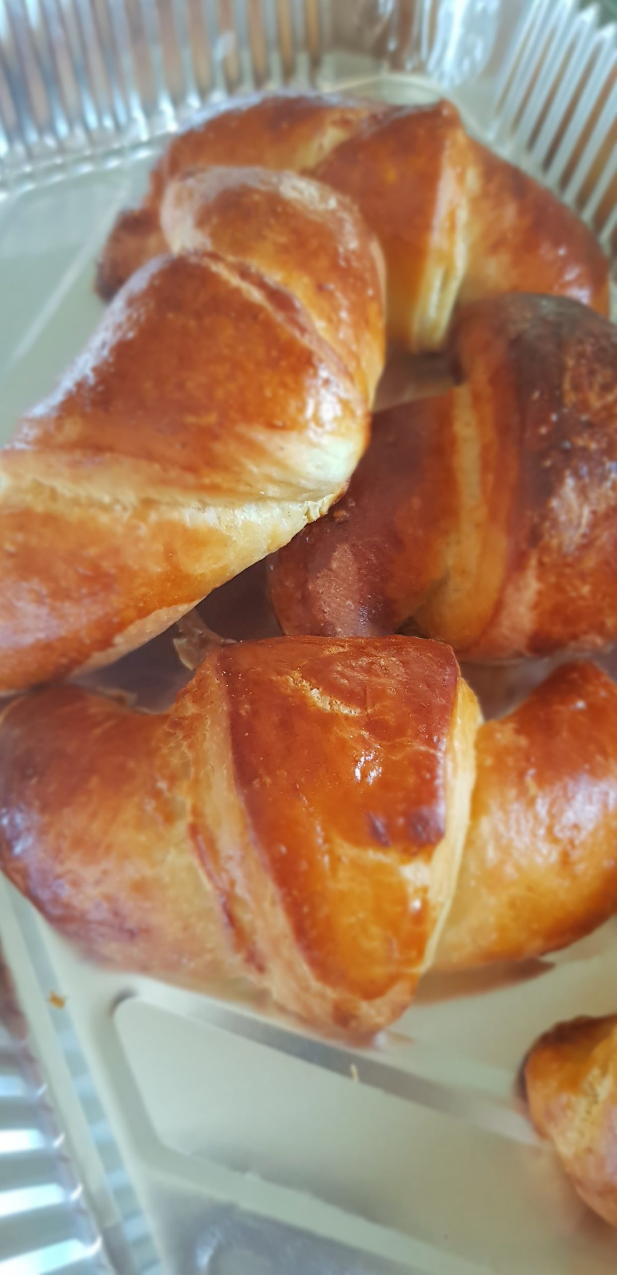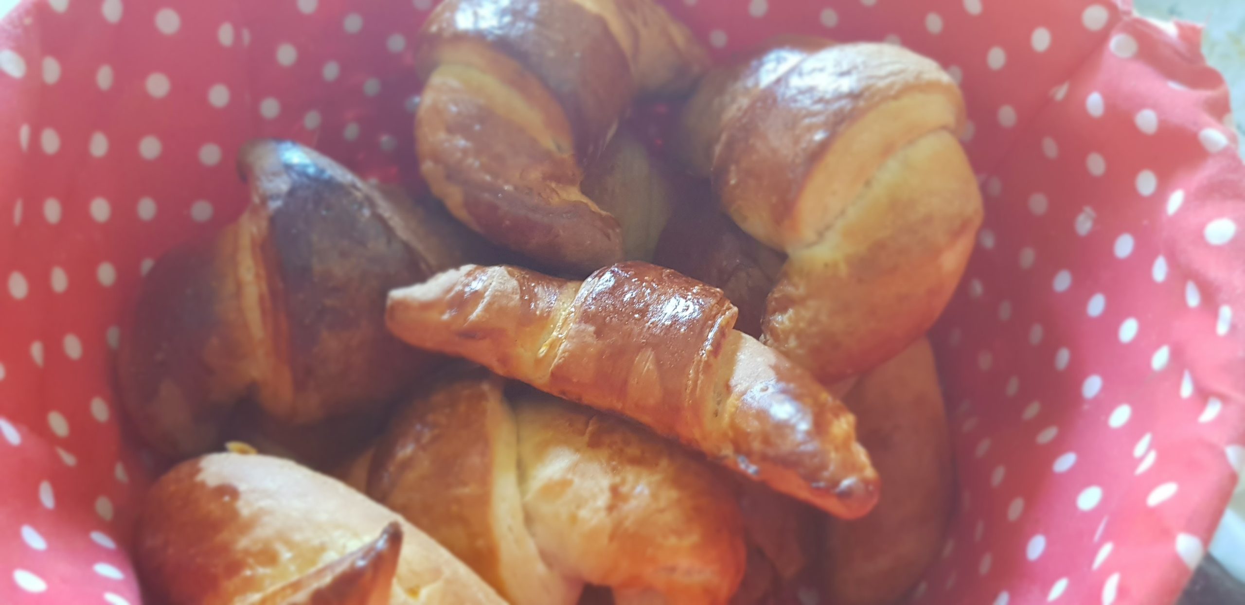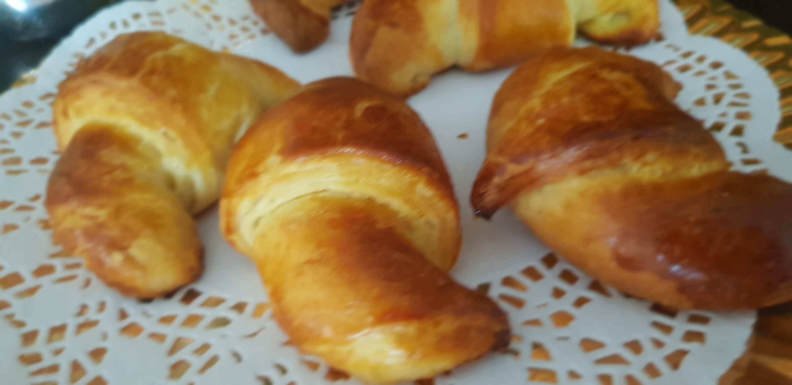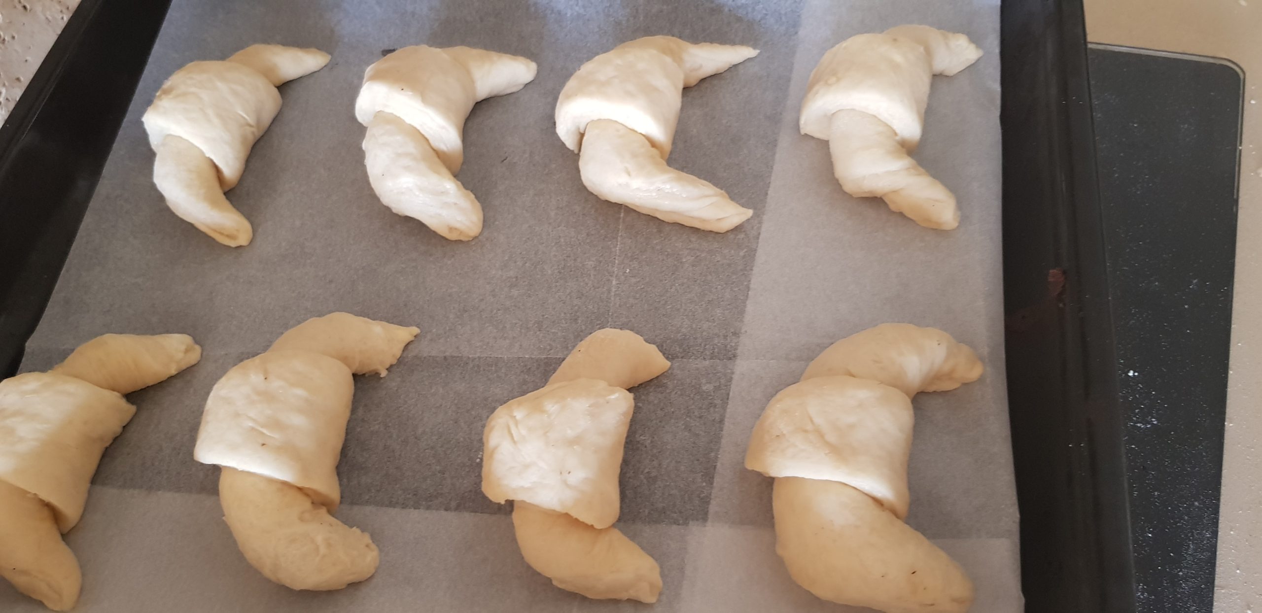 Quand le beurre a bien pénétrée la pâte , faire des bandes et des triangles et rouler vos croissants, les laisser monter et les badigeonner et mettre au four chaud à 240 °