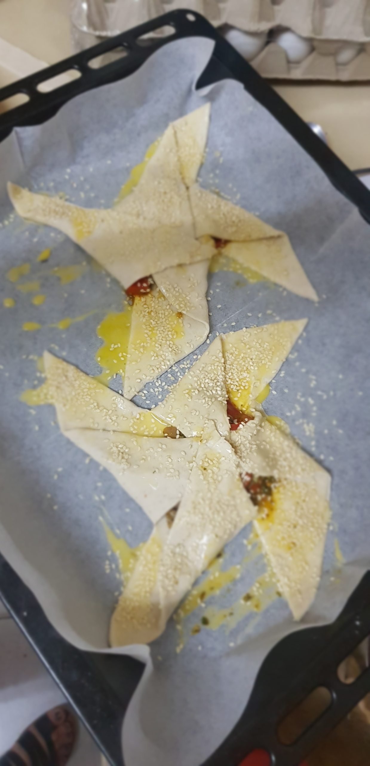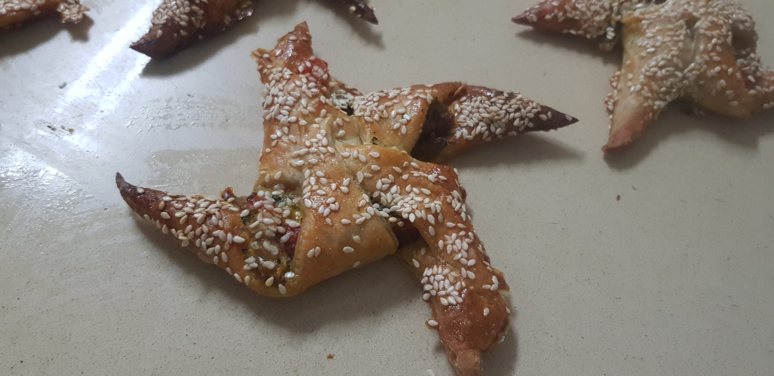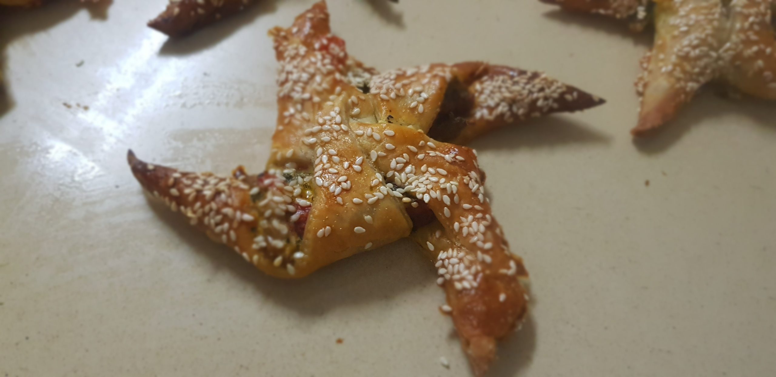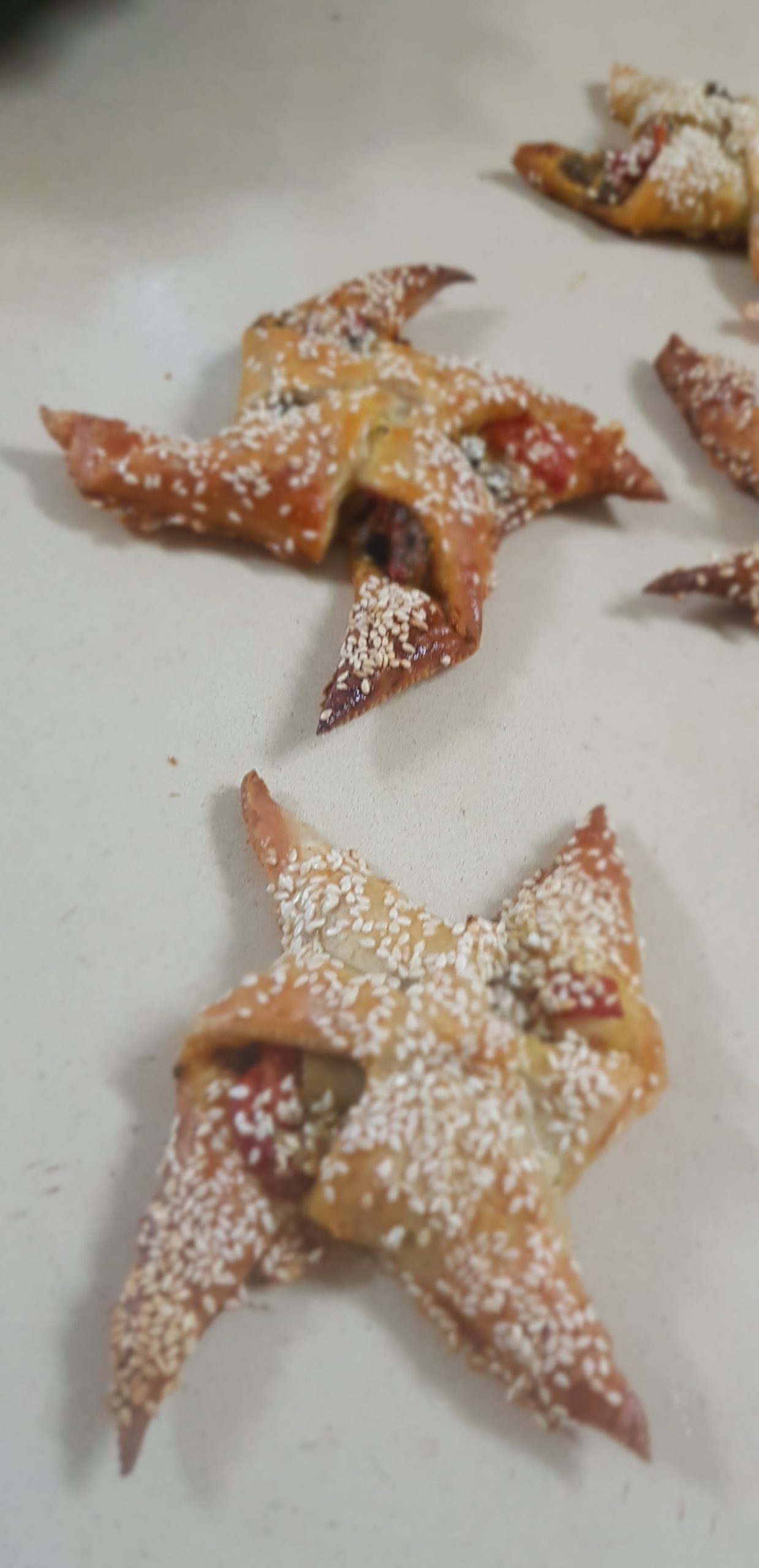Etaler la pate feuilleté à 1/2 centimètre de largeur et couper des carrés comme le modèle ci dessous et placer votre farce, couper partiellement les 4 cotes et plier comme sur les images, badigeonner les étoiles et parsemer de graines de sésames :