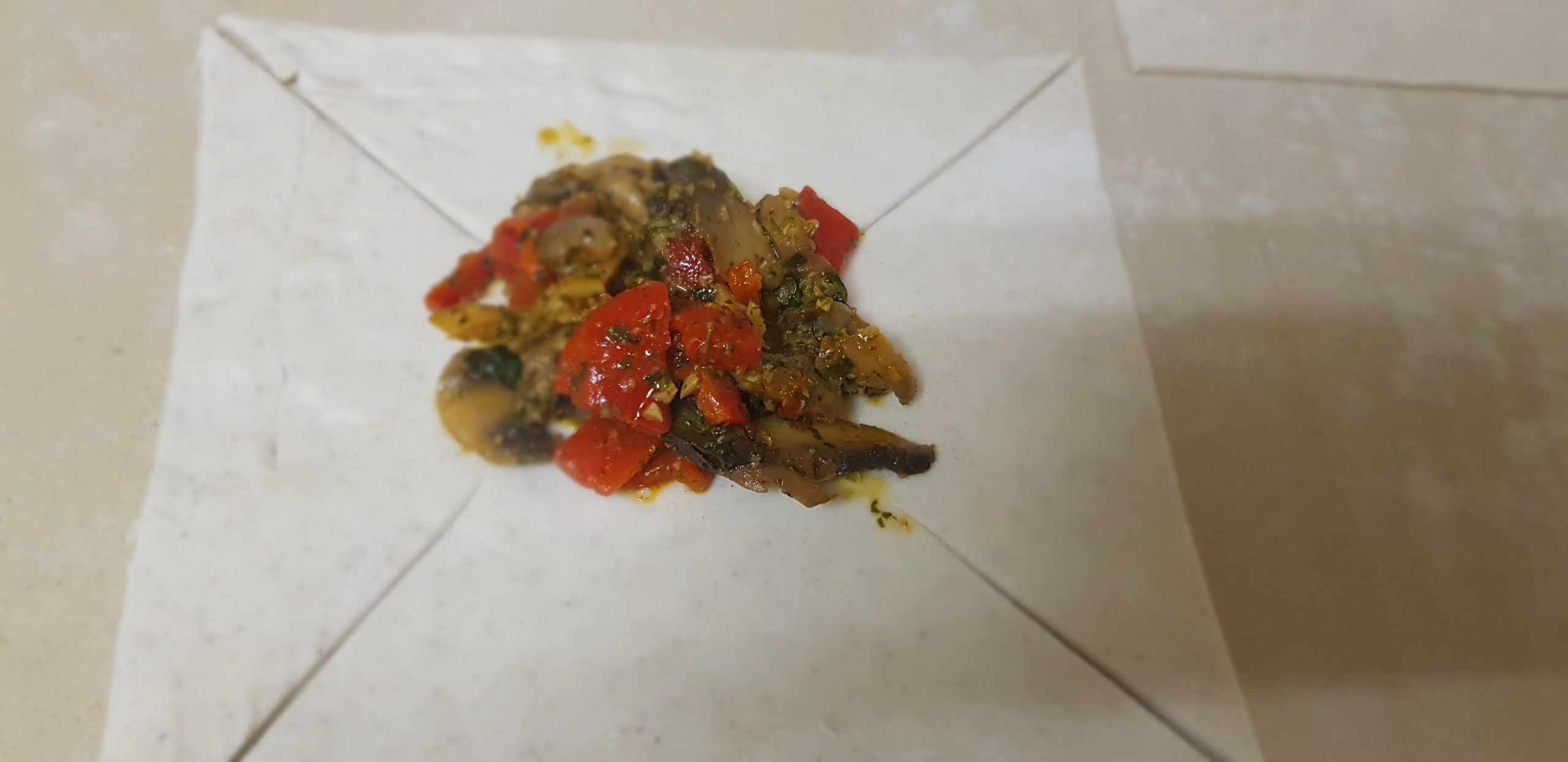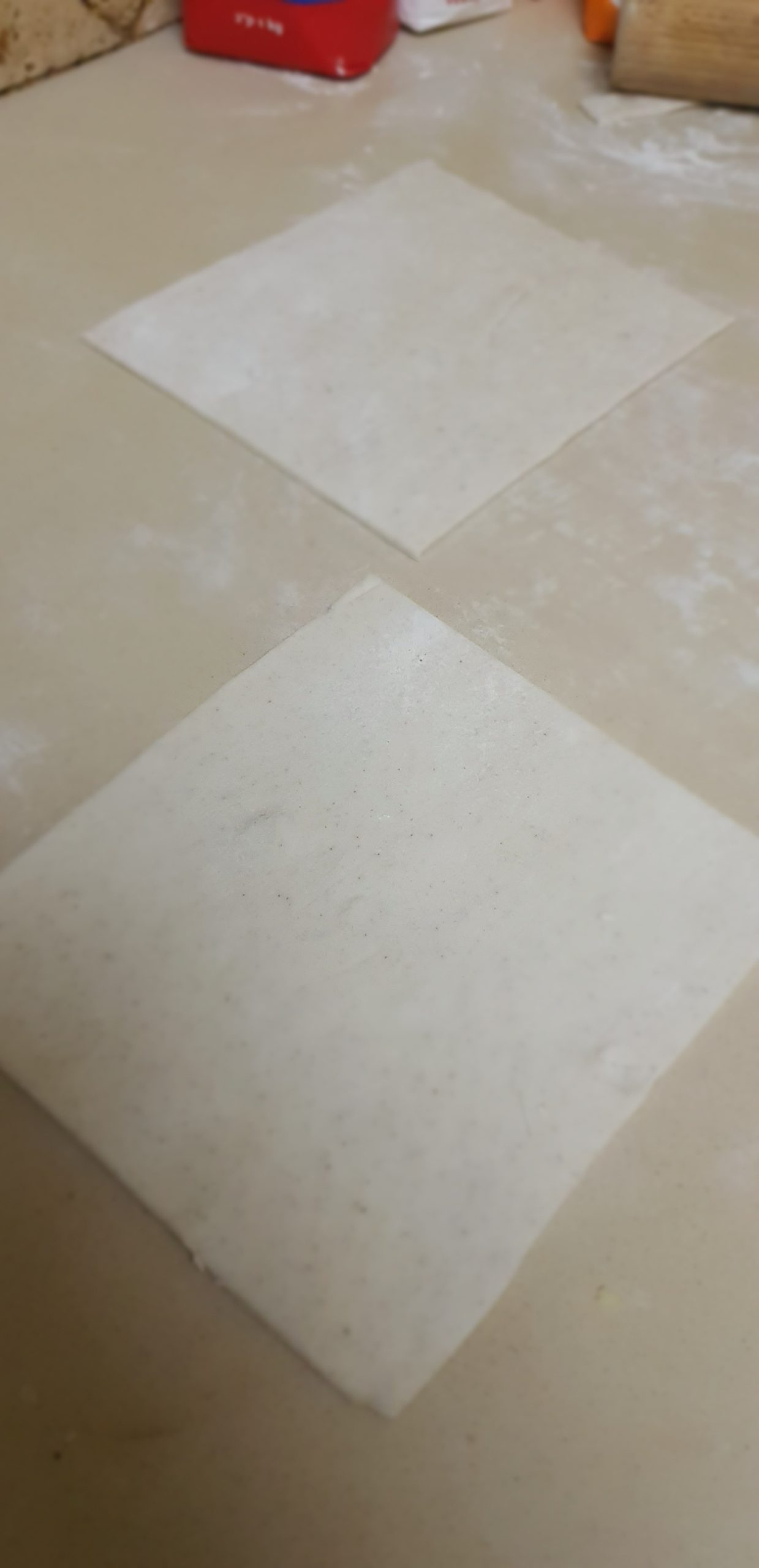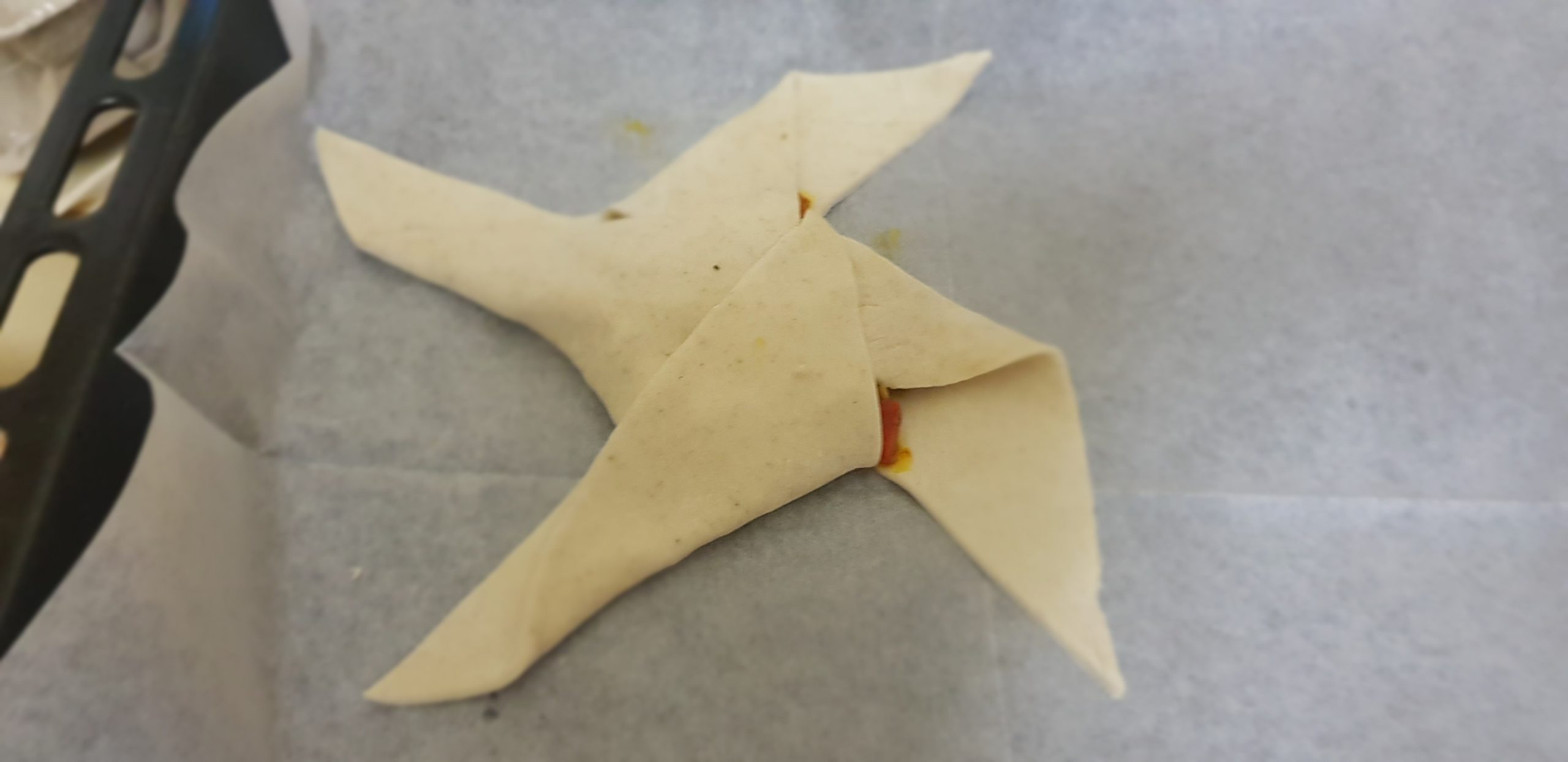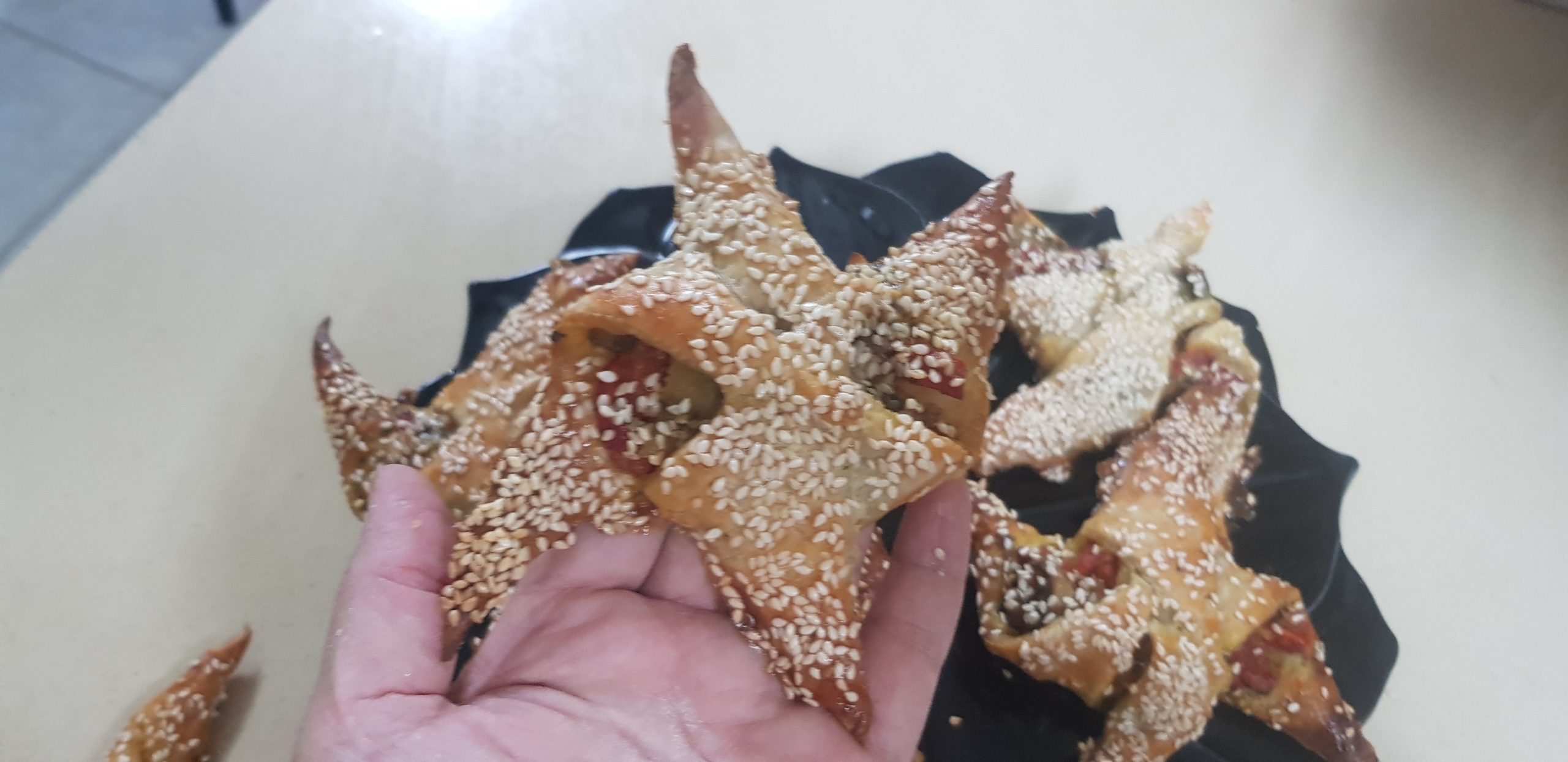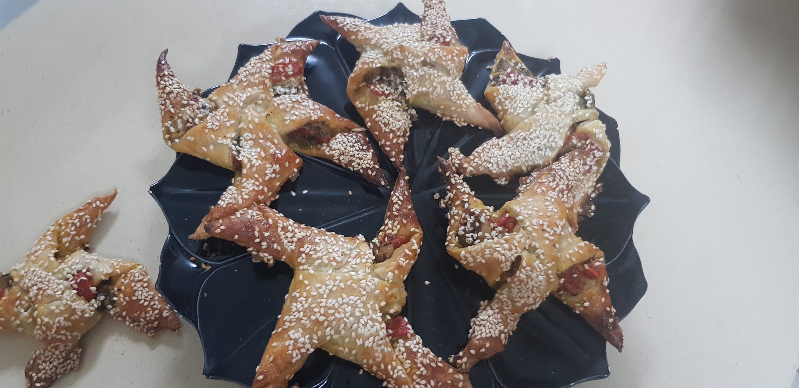 Etaler la pate feuilleté à 1/2 centimètre de largeur et couper des carrés comme le modèle ci dessous et placer votre farce, couper partiellement les 4 cotes et plier comme sur les images, badigeonner les étoiles et parsemer de graines de sésames :