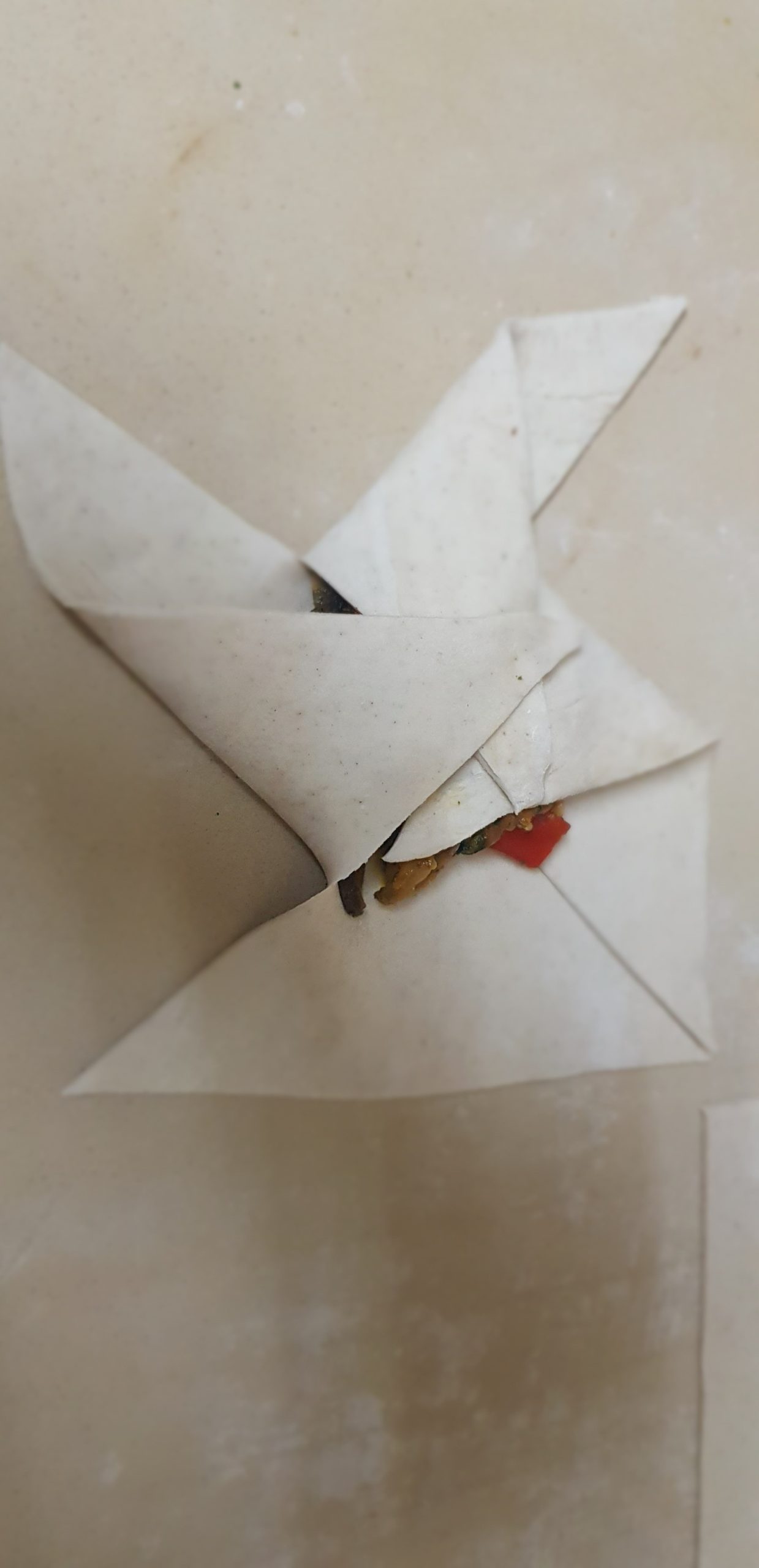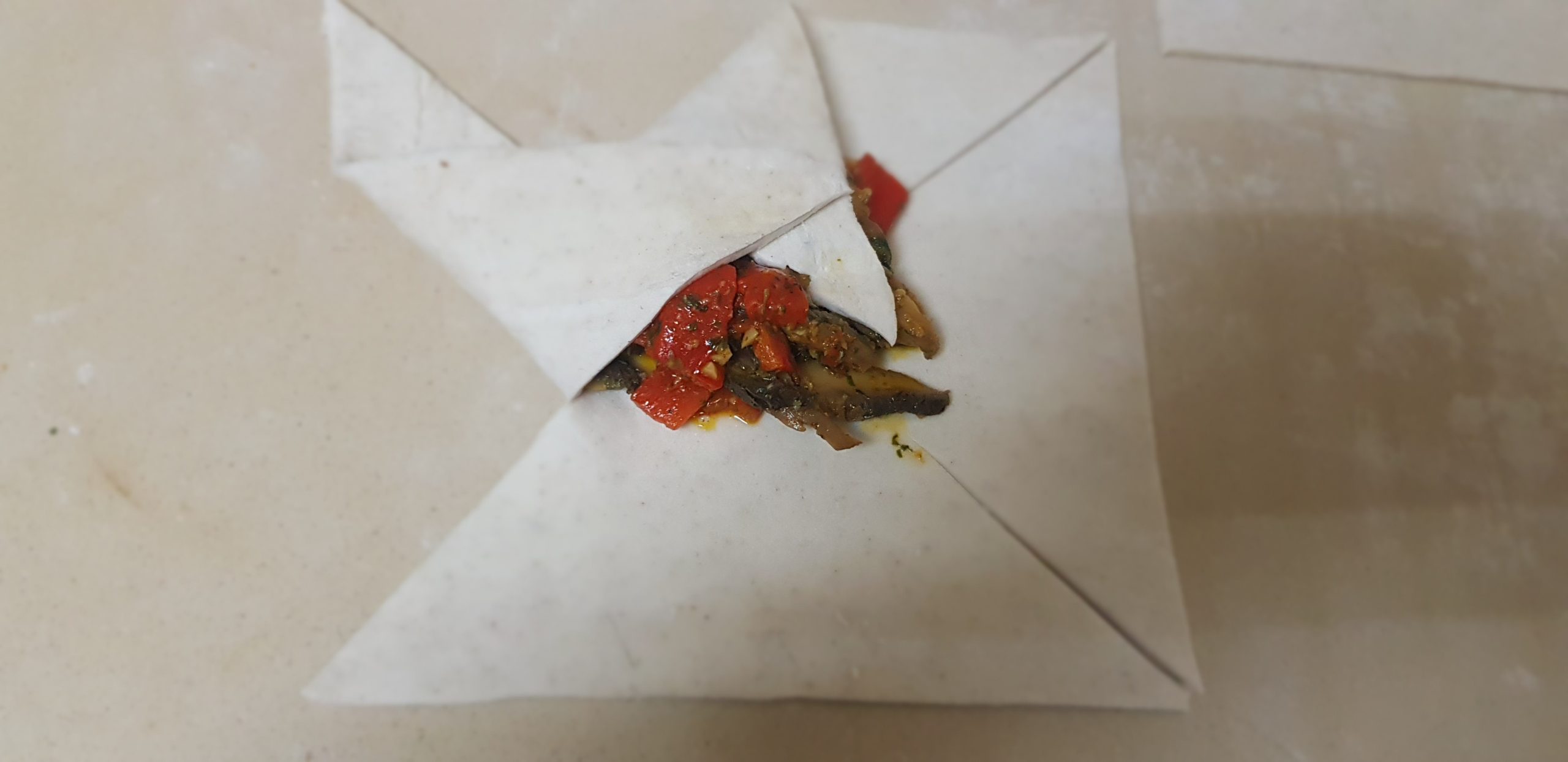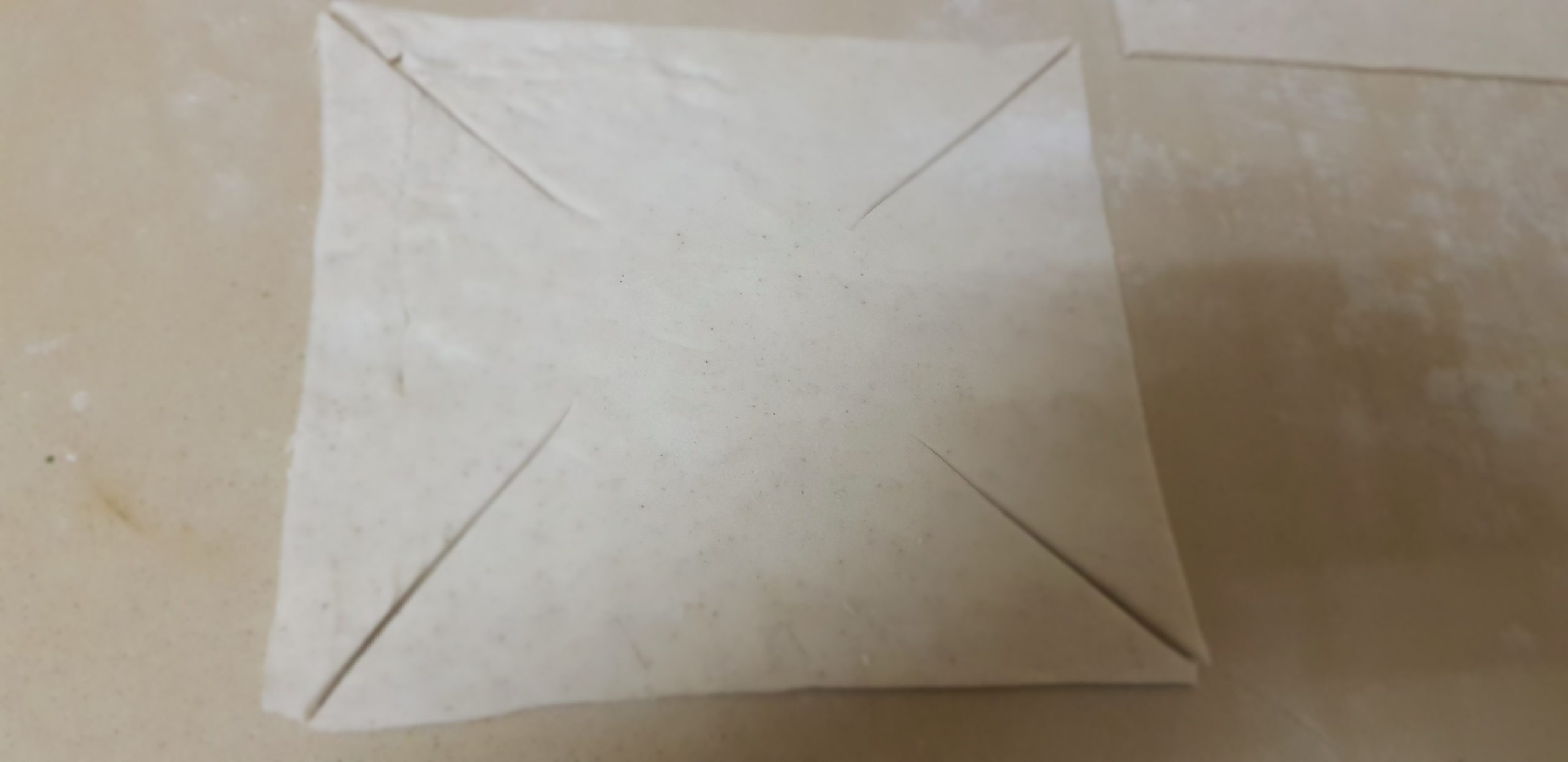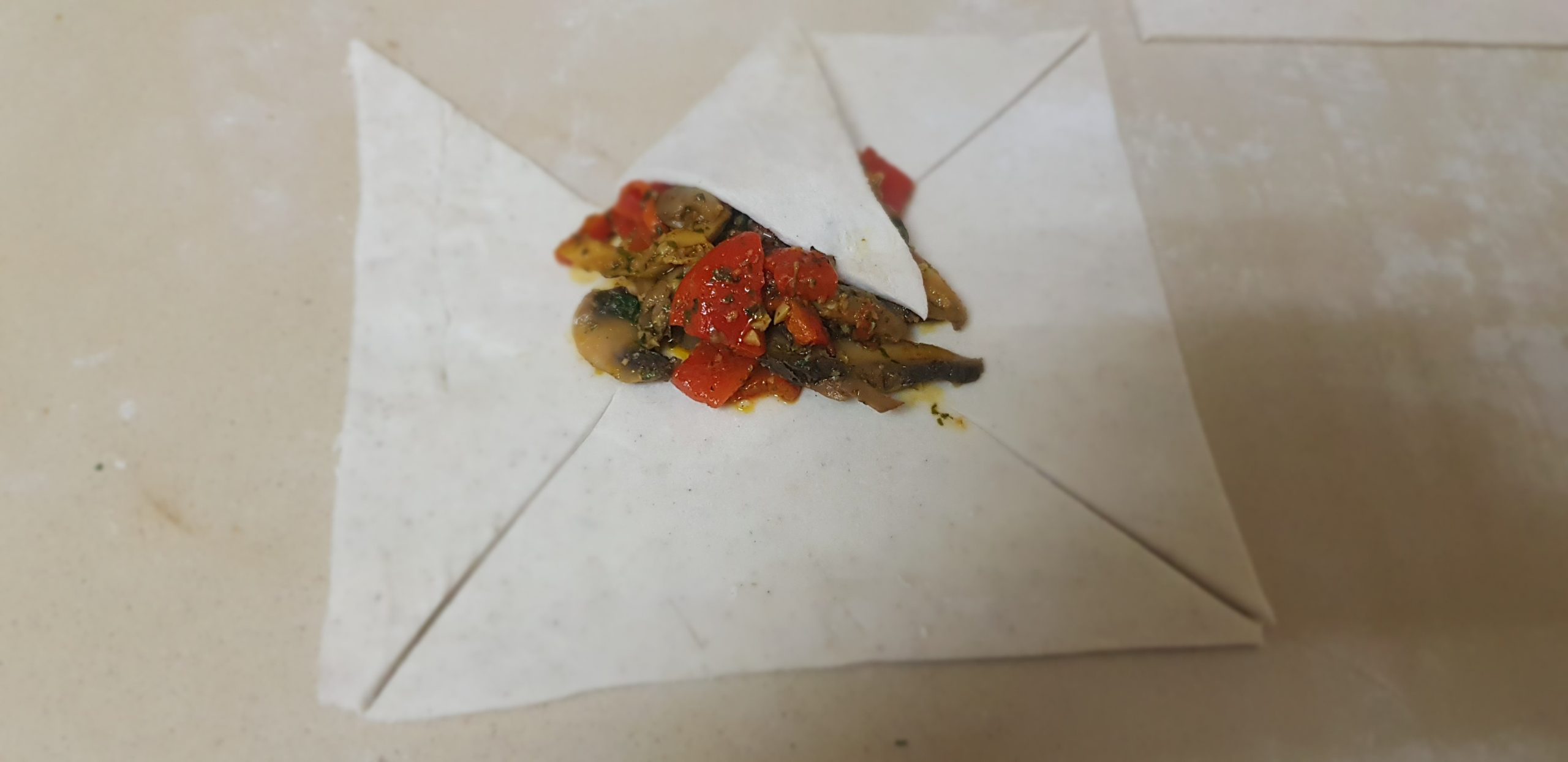 Etaler la pate feuilleté à 1/2 centimètre de largeur et couper des carrés comme le modèle ci dessous et placer votre farce, couper partiellement les 4 cotes et plier comme sur les images, badigeonner les étoiles et parsemer de graines de sésames :