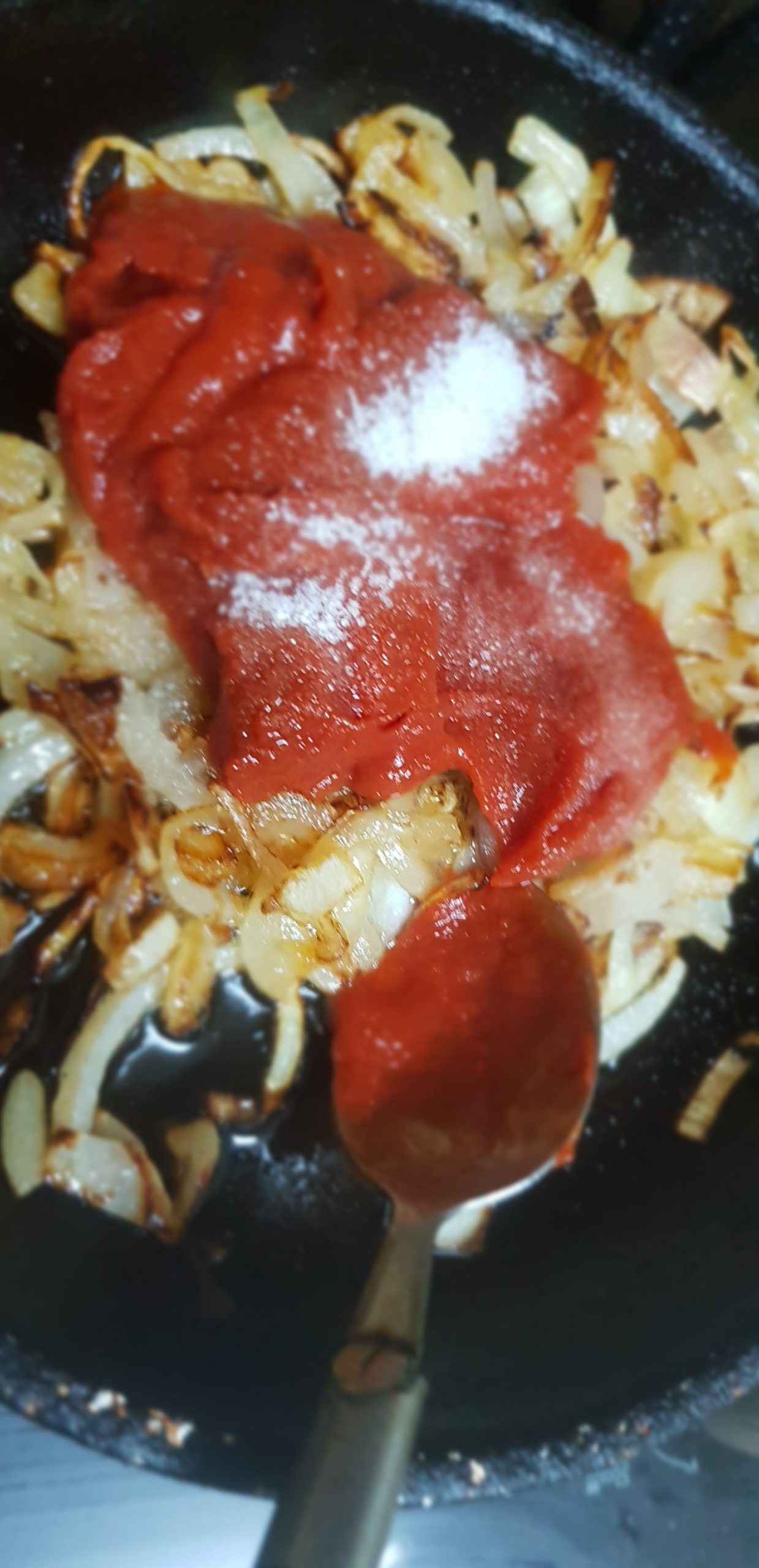 Faire revenir les oignons dans l’huile, jusqu’à qu’ils commencent à devenir légèrement dorés, ensuite ajouter le concentré de tomate et laisser réduire, puis ajouter les olives et faire cuire encore 5 minutes et placer dans un plat jusqu’à refroidissement.