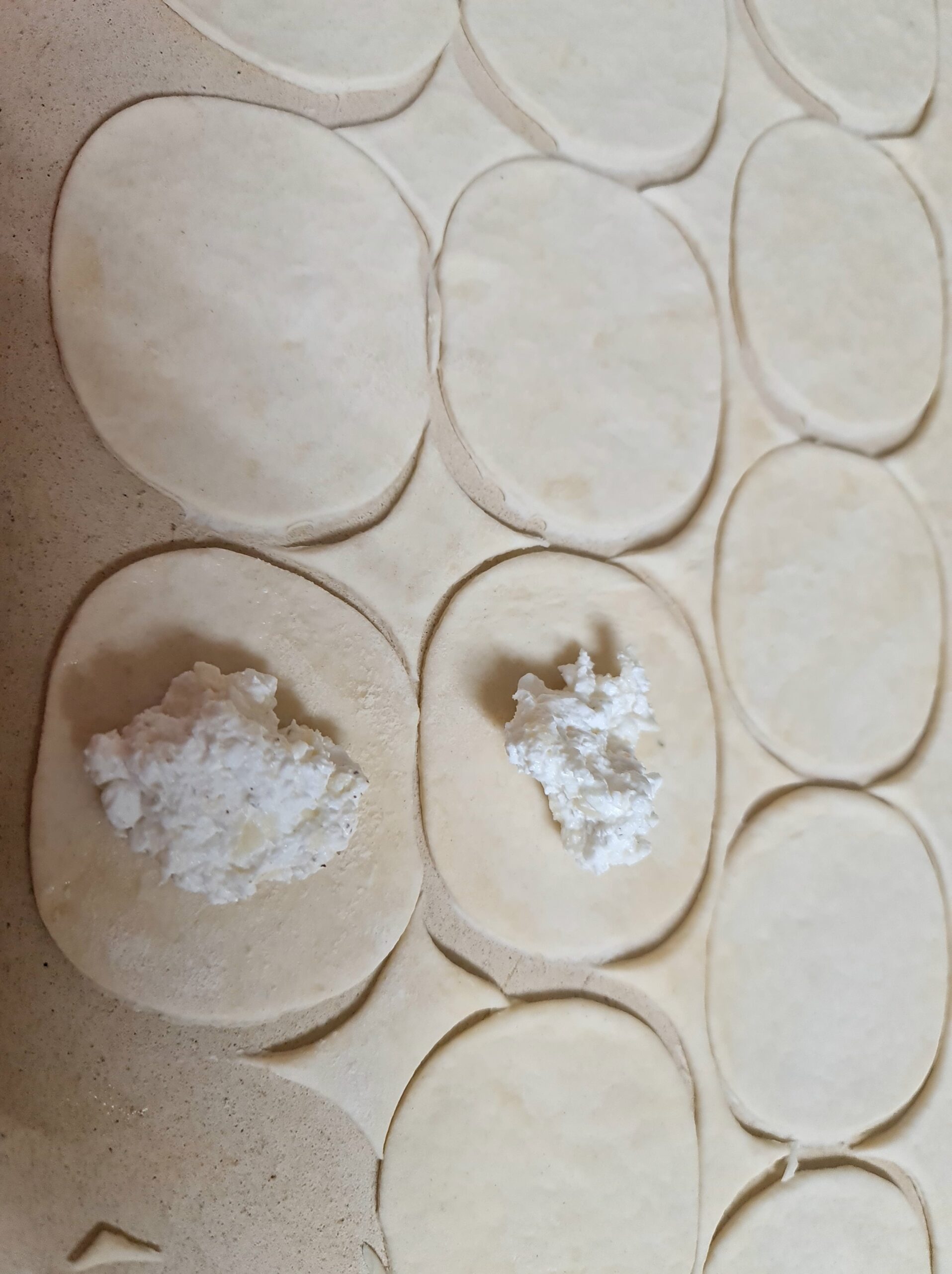 Déposer environ une demi cuillère à café de farce sur chaque cercle, plier et souder les bords.