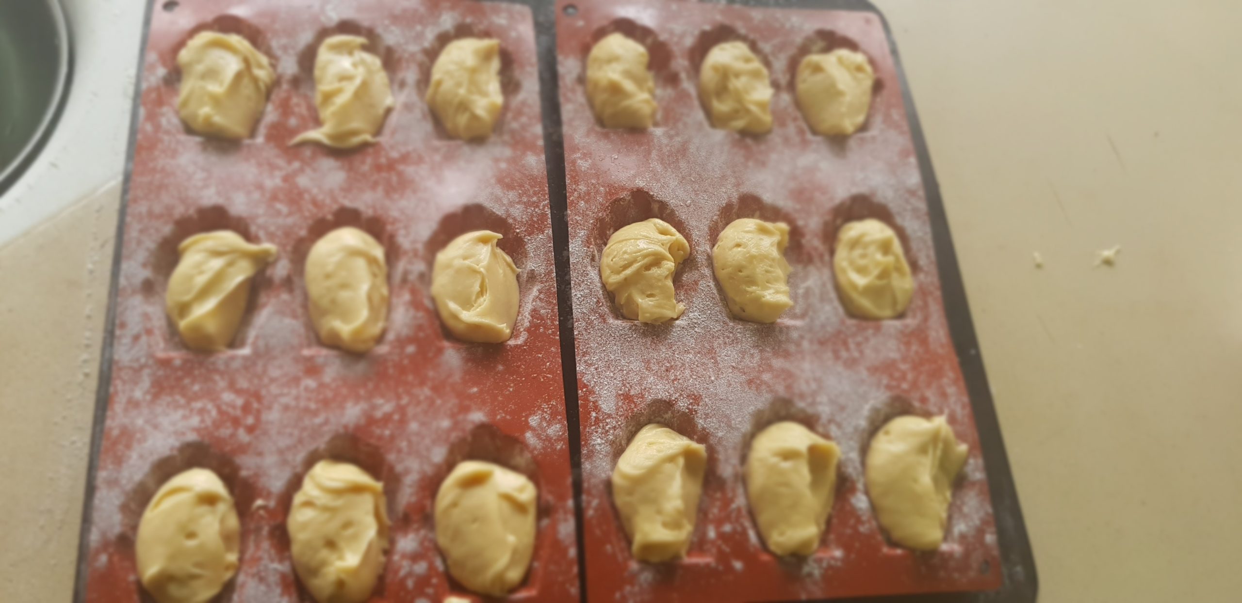 8 – Remplir les alvéoles du moule à madeleines d’une cuillère à soupe de pâte sans l’étaler .