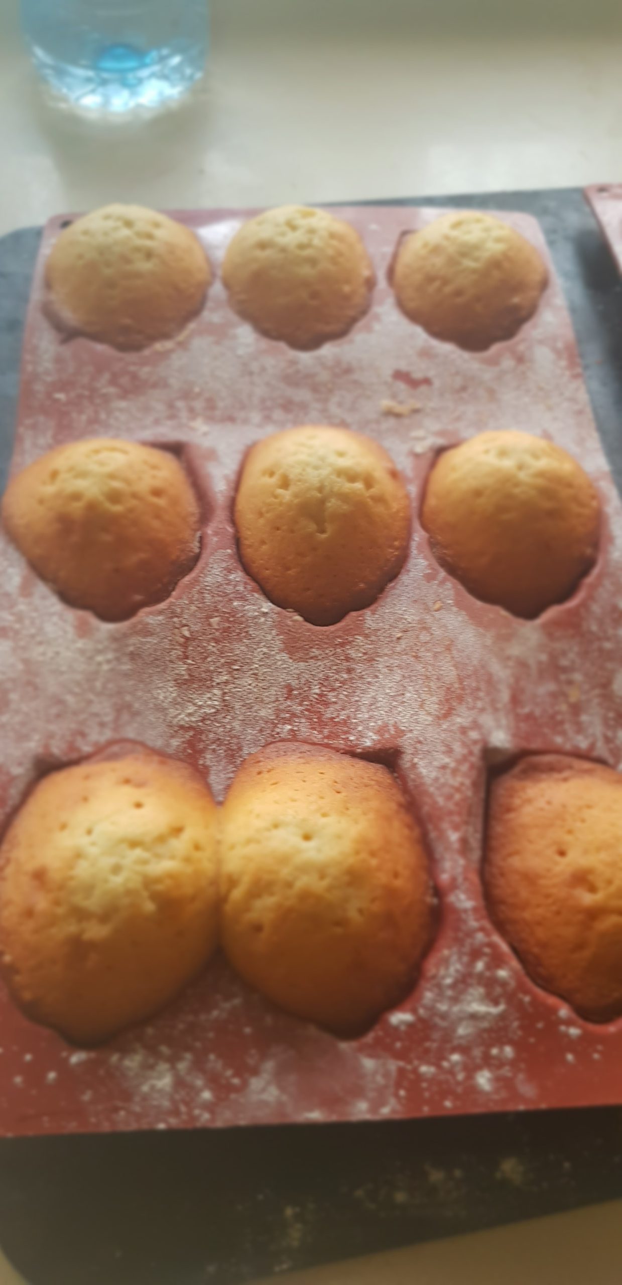 10 – Au bout de 3 à 5 min, le centre de la madeleine forme une petite dépression : Baisser encore le thermostat du four à environ 180° C et poursuivre la cuisson. A la place de la dépression, va se former le bombé caractéristique de la madeleine, la fameuse « bosse ».