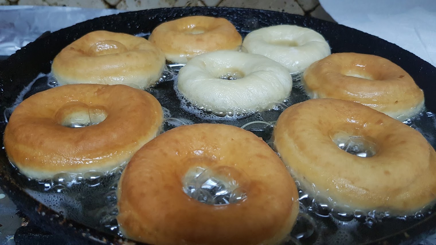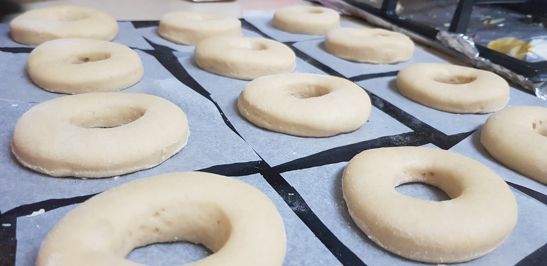 Abaisser la pâte sur une épaisseur d’environ 1 cm et demi. Étalez les cercles de beignets de la pâte avec un emporte piece et placez chaque cercle troué sur un carré de papier sulfurisé. Gardez les trous de beignet de côté sur une plaque recouverte de papier sulfurisé. Rassemblez le reste de la pâte en boule, couvrez avec une serviette, laissez reposer 5 minutes.