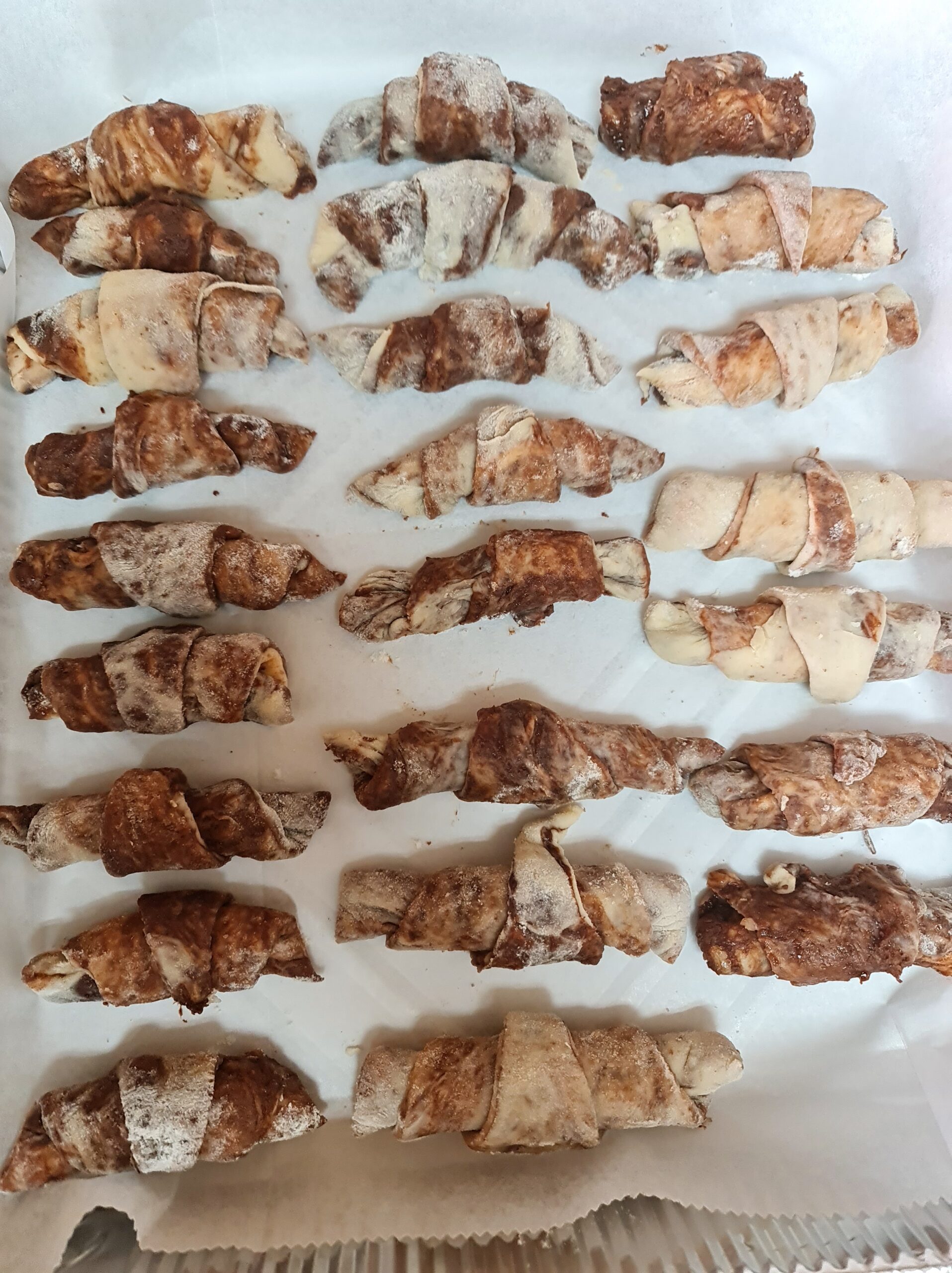 Chaque morceau de pâte est fariné et roulé en un rectangle d’épaisseur moyenne, étalé sur la moitié du rectangle de la garniture au chocolat et plié en deux, serrer les bords pour que la pâte à tartiner ne s’échappe pas et fariner du haut et du bas.