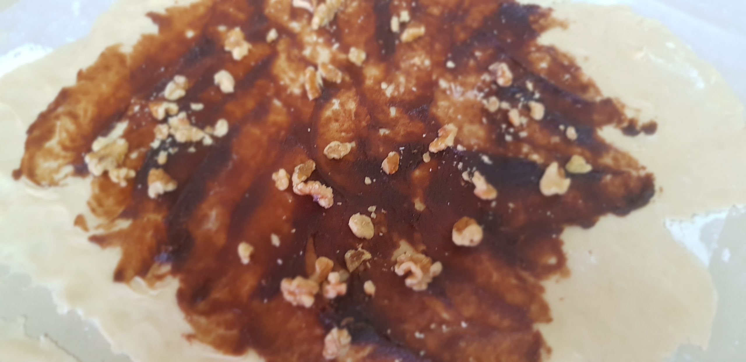 Étalez une fine couche de nuttela sur la pâte. Saupoudrer d’un peu de de noix hachées.