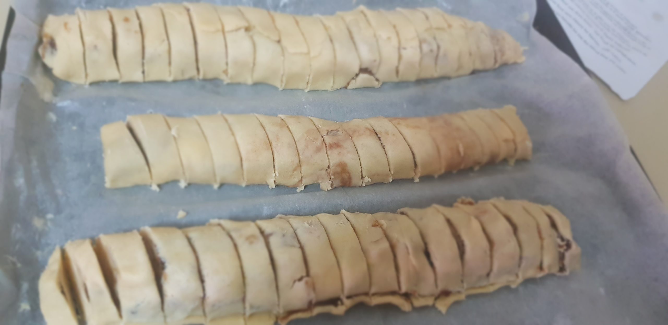 Coupez les rouleaux en biscuits (coupez jusqu’au bout sans séparer les biscuits).