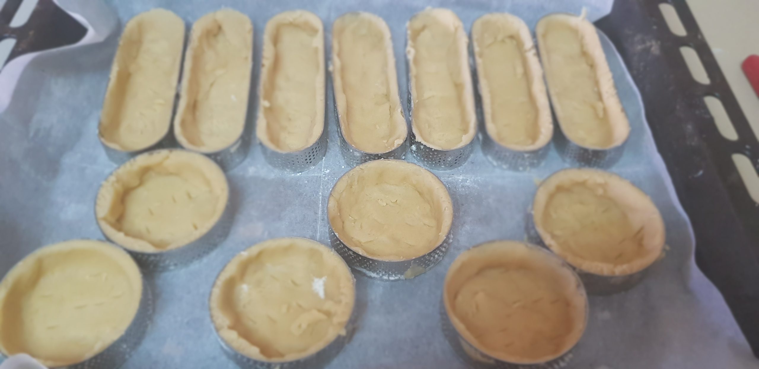 Mélanger tous les ingrédients dans un robot avec le crochet. Dés que vous avez une pâte sablée homogène, (ajouter un peu d’eau si votre pâte est trop dure), étaler la pâte de maximum 0.5 cm sur vos petits moules.