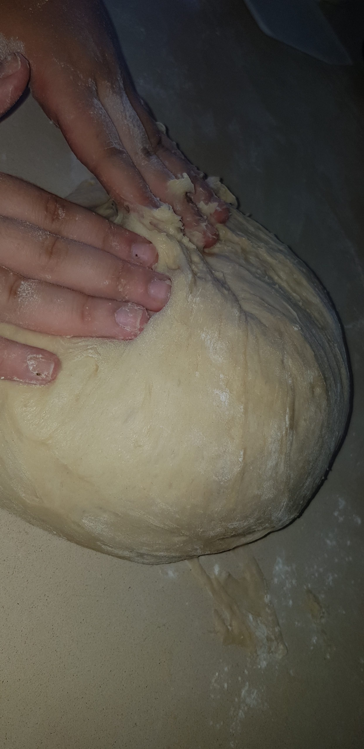 Mettre tous les ingrédients de la pâte dans le bol de votre robot avec le crochet et mélanger jusqu’à avoir une pâte souple et un peu collante et la placer une demi heure au frigo et 45 minutes dehors recouverte d’un tissus propre.