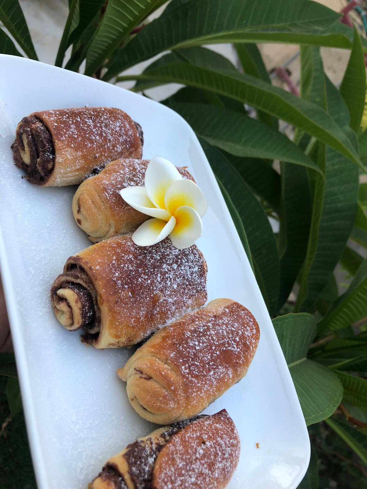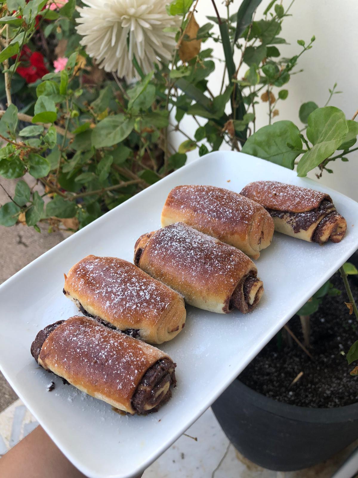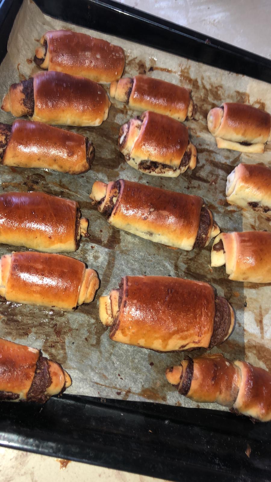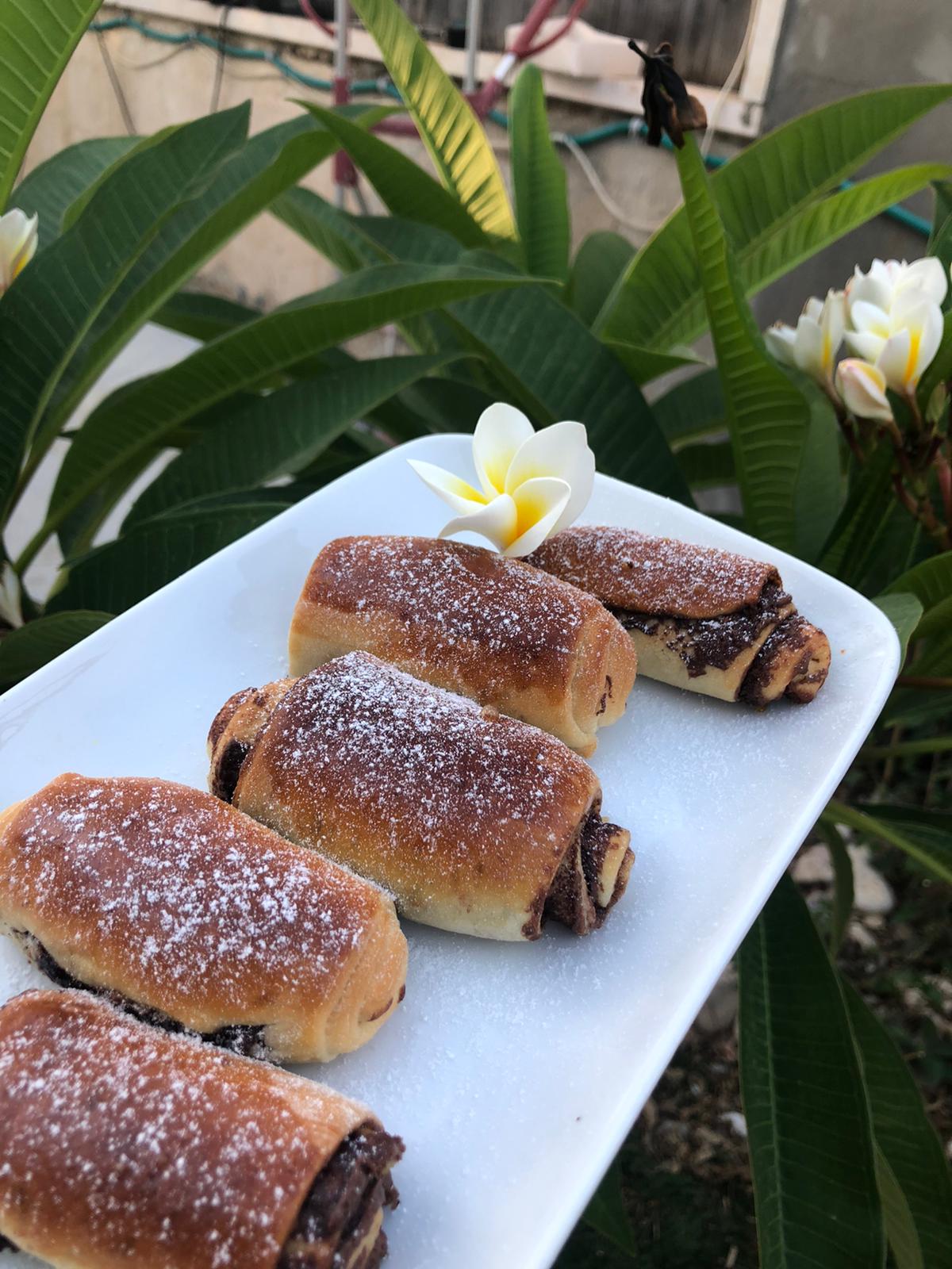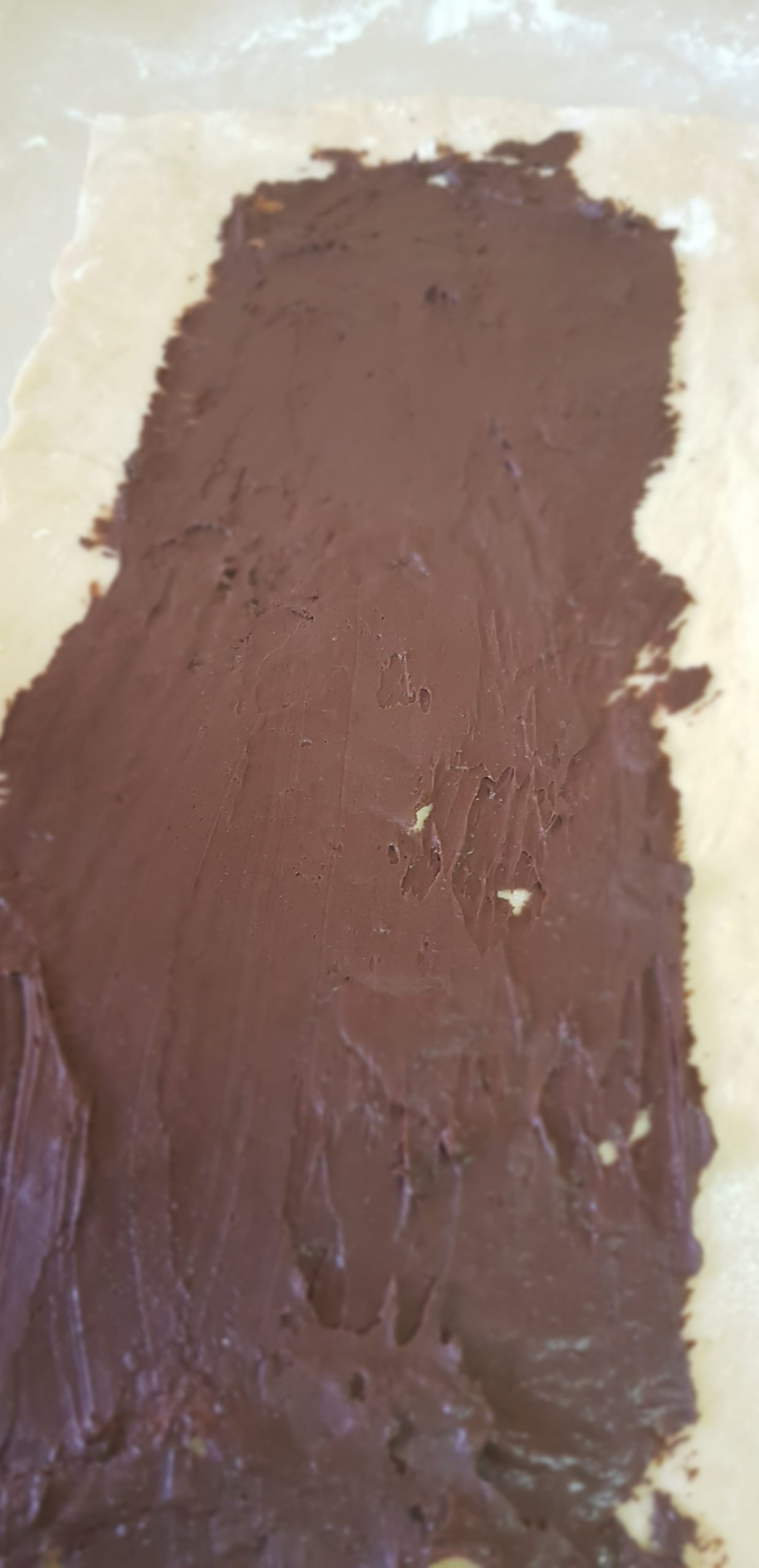 Des que la pâte est montée, faire un grand rectangle au rouleau de deux millimètres d’épaisseur et napper de chocolat et plier en deux dans la longueur puis découper des bandes et rouler pour en faire des pains au chocolat et laisser monter sur une plaque avec du papier sulfurisé.