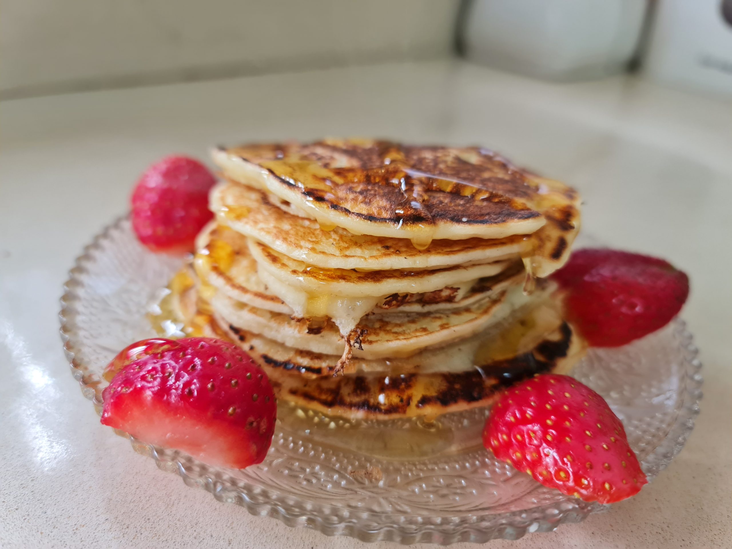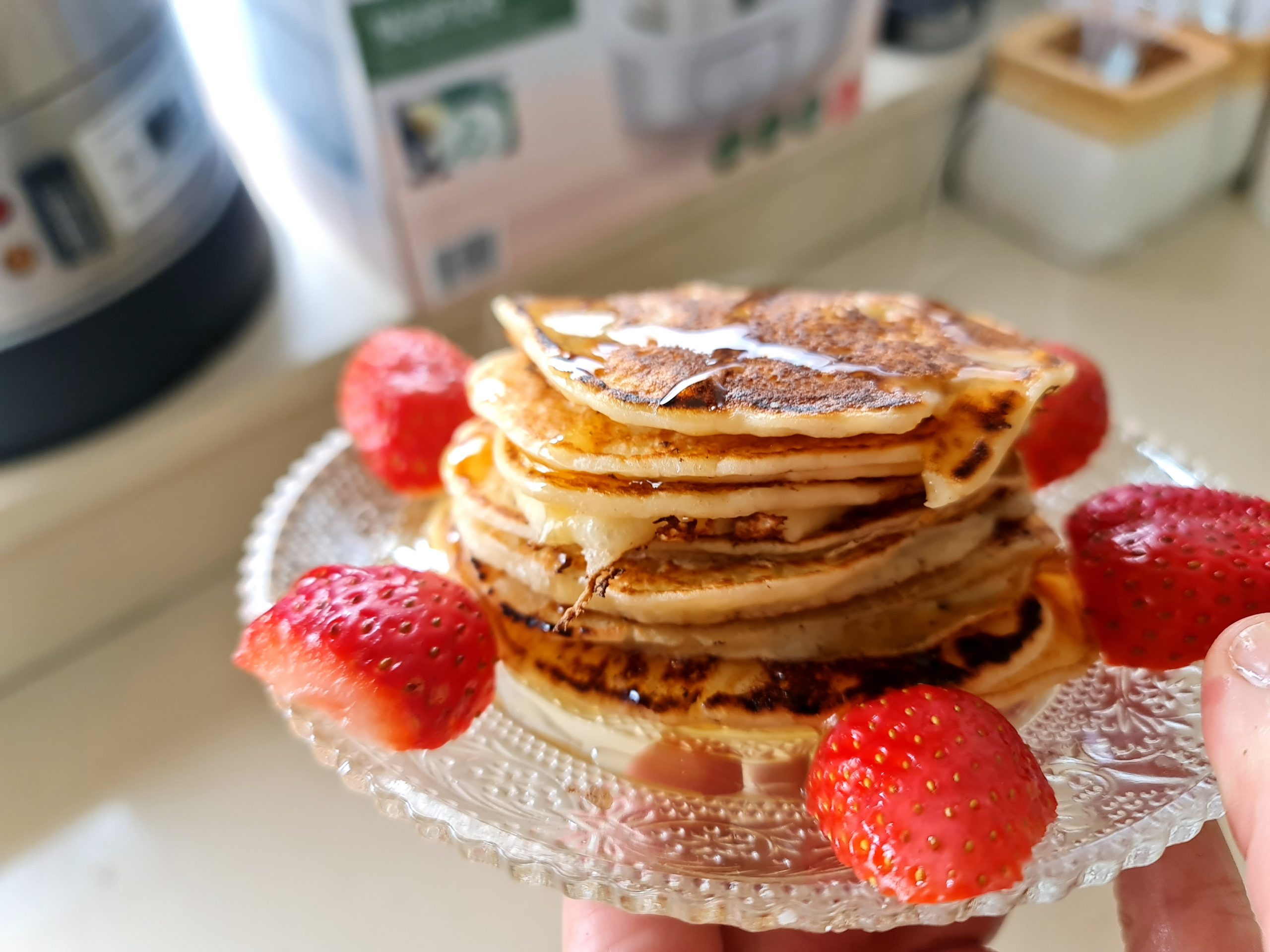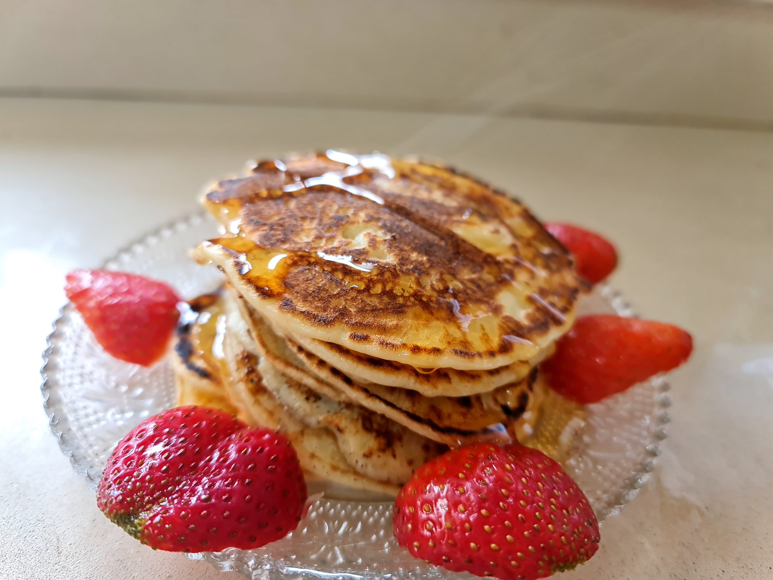Préchauffez une poêle avec un peu de beurre et mettez y une petite qualité du melange et cuire 1 à 2 minutes sur les cotés. Placer sur une assiette et parsemer de miel, et de fraises.