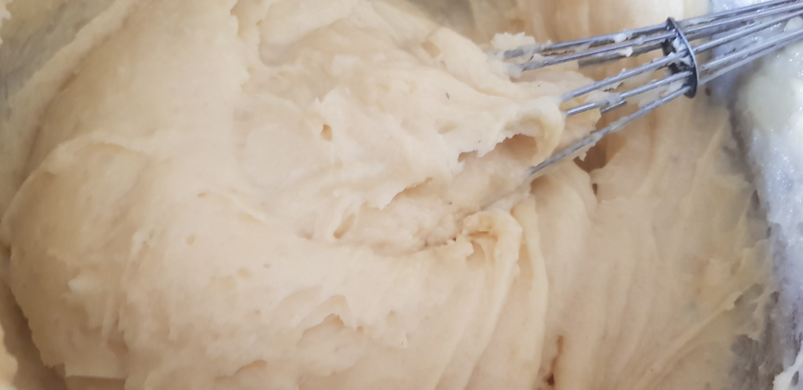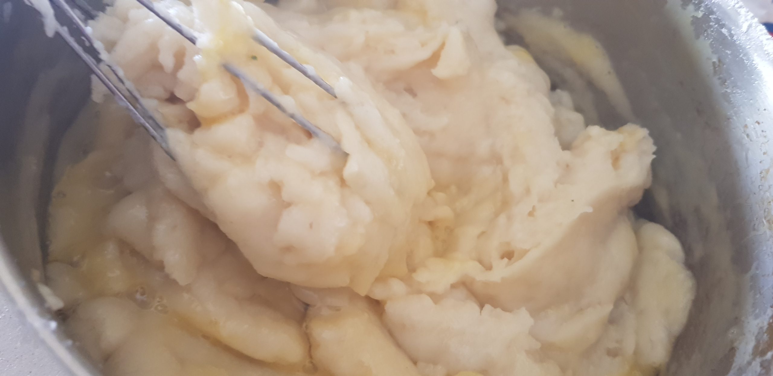5 – Entre temps, mettre les oeufs un à un dans la pâte. Si cela est trop dure, je vous conseille d’utiliser le robot avec la feuille .