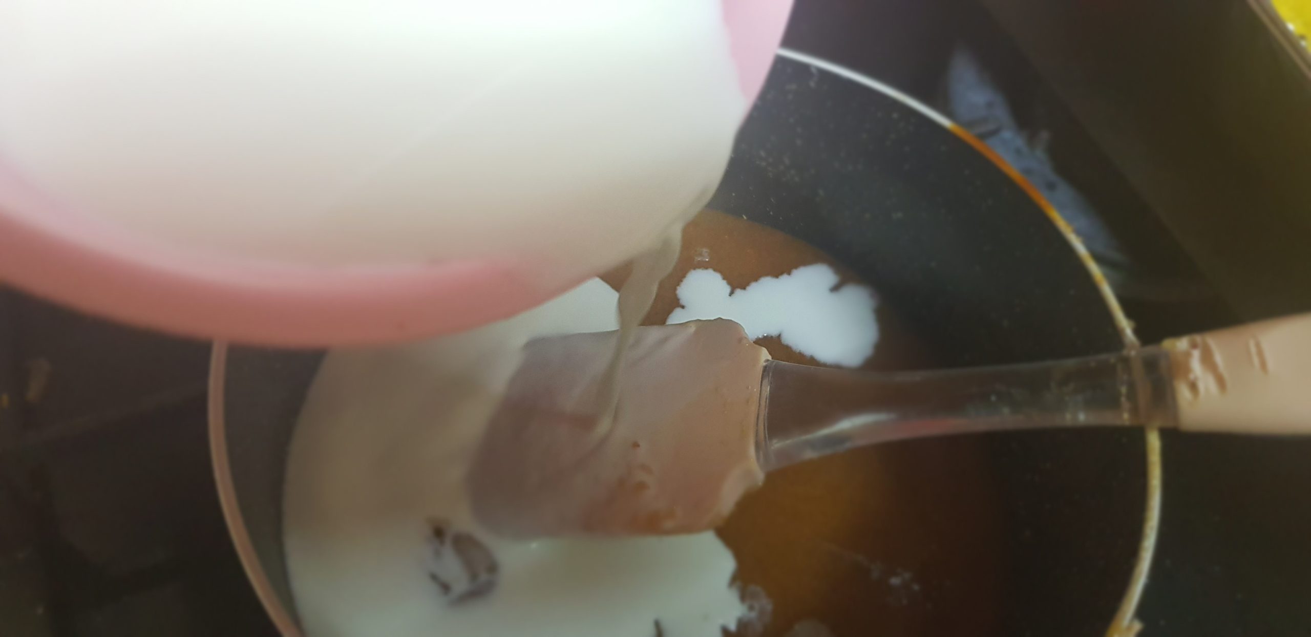 4 – Quand le caramel est prêt versez la crème chaude en un tout petit filet