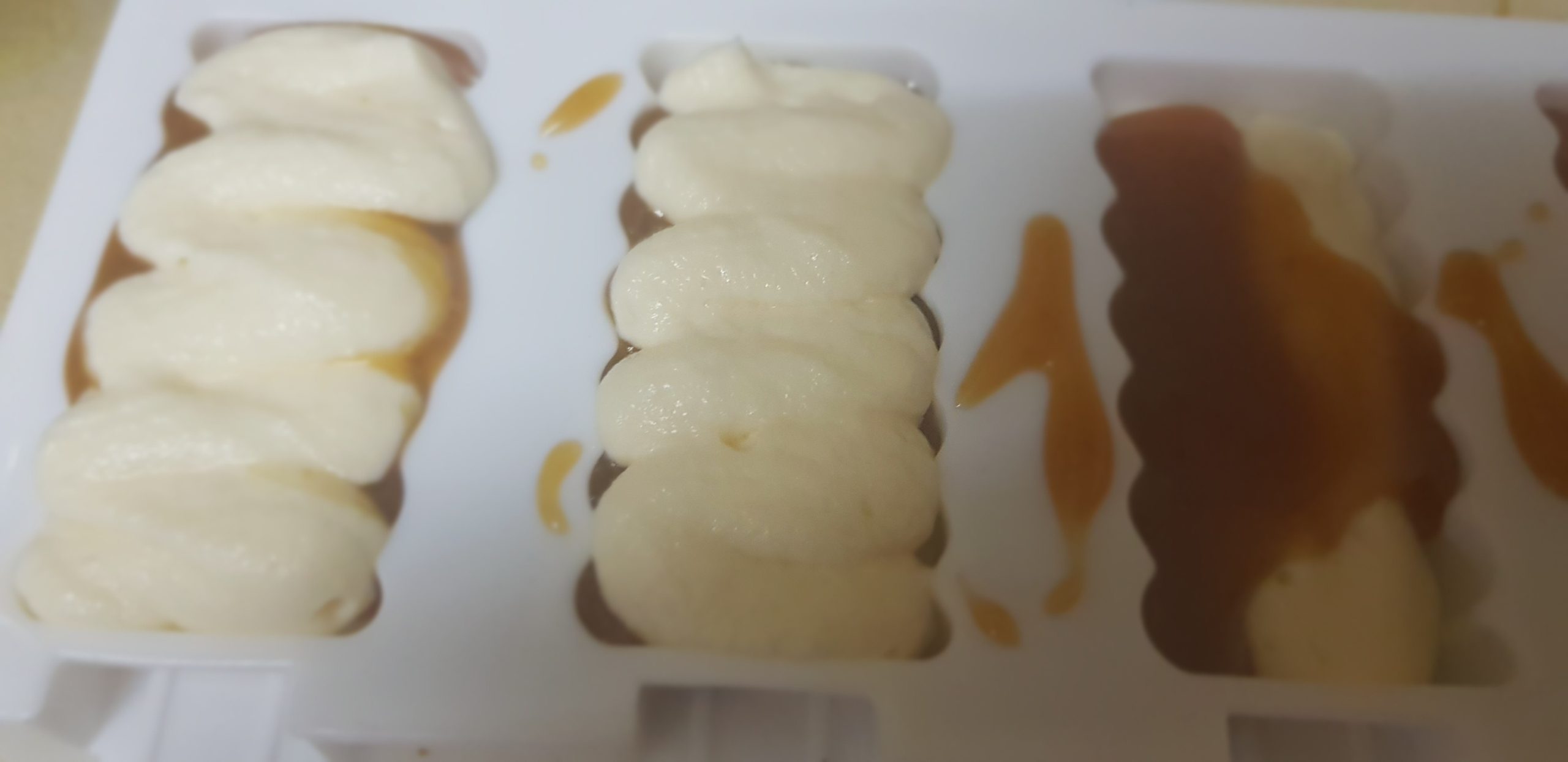 Ce sont des petites glaces mais si vous avez d’autres moules plus grands, rien ne vous empêche de faire des glaces plus grandes ! Pour cette recette, il y a trois préparations différentes : le caramel au beurre salé, l’appareil qui est la glace et l’enrobage aux noisettes.