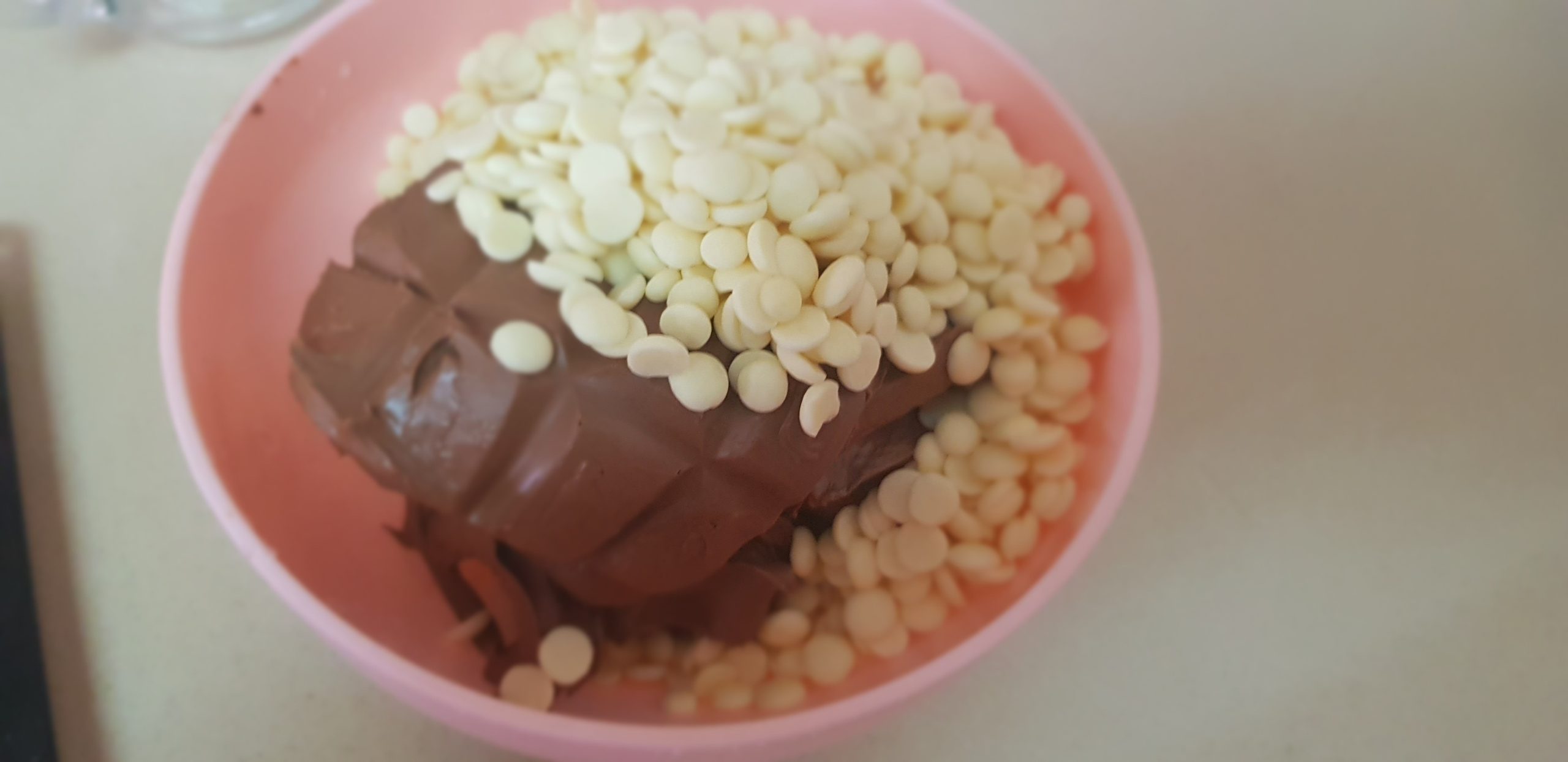 1 – Fondre le chocolat avec le beurre de cacao et l’huile.