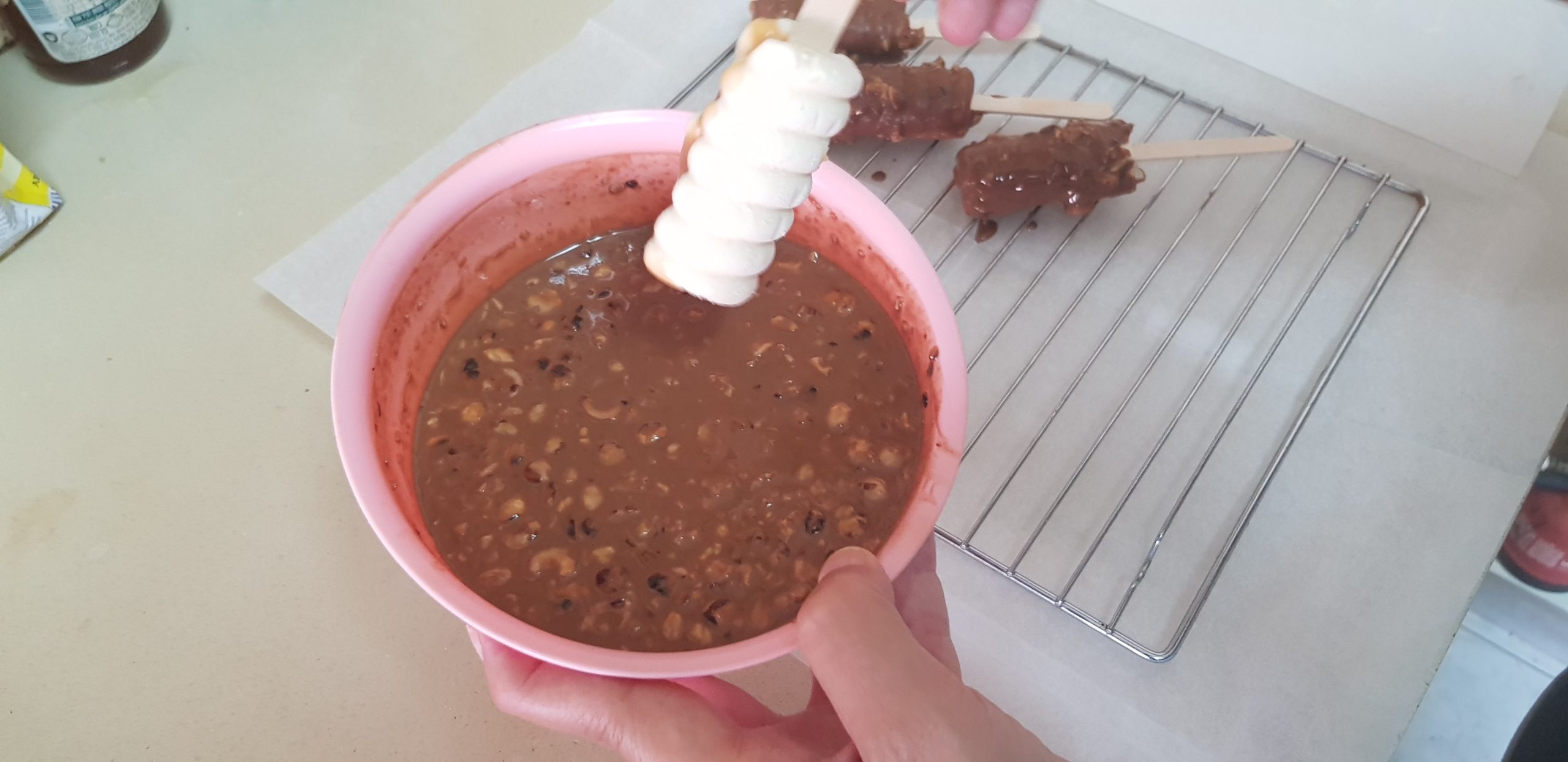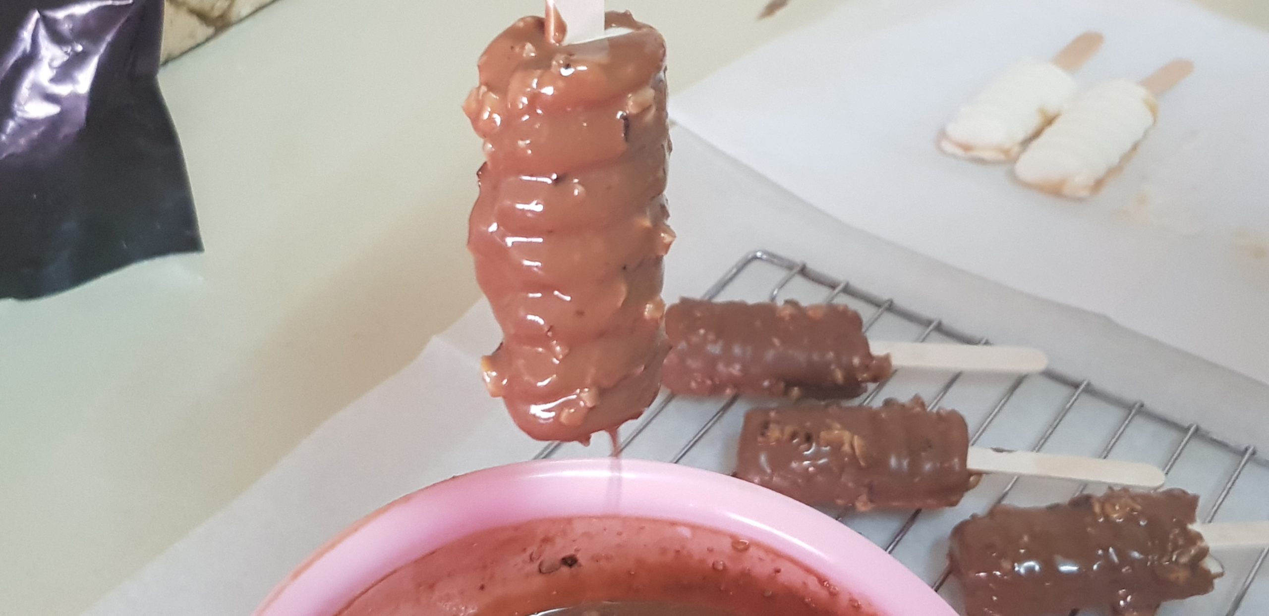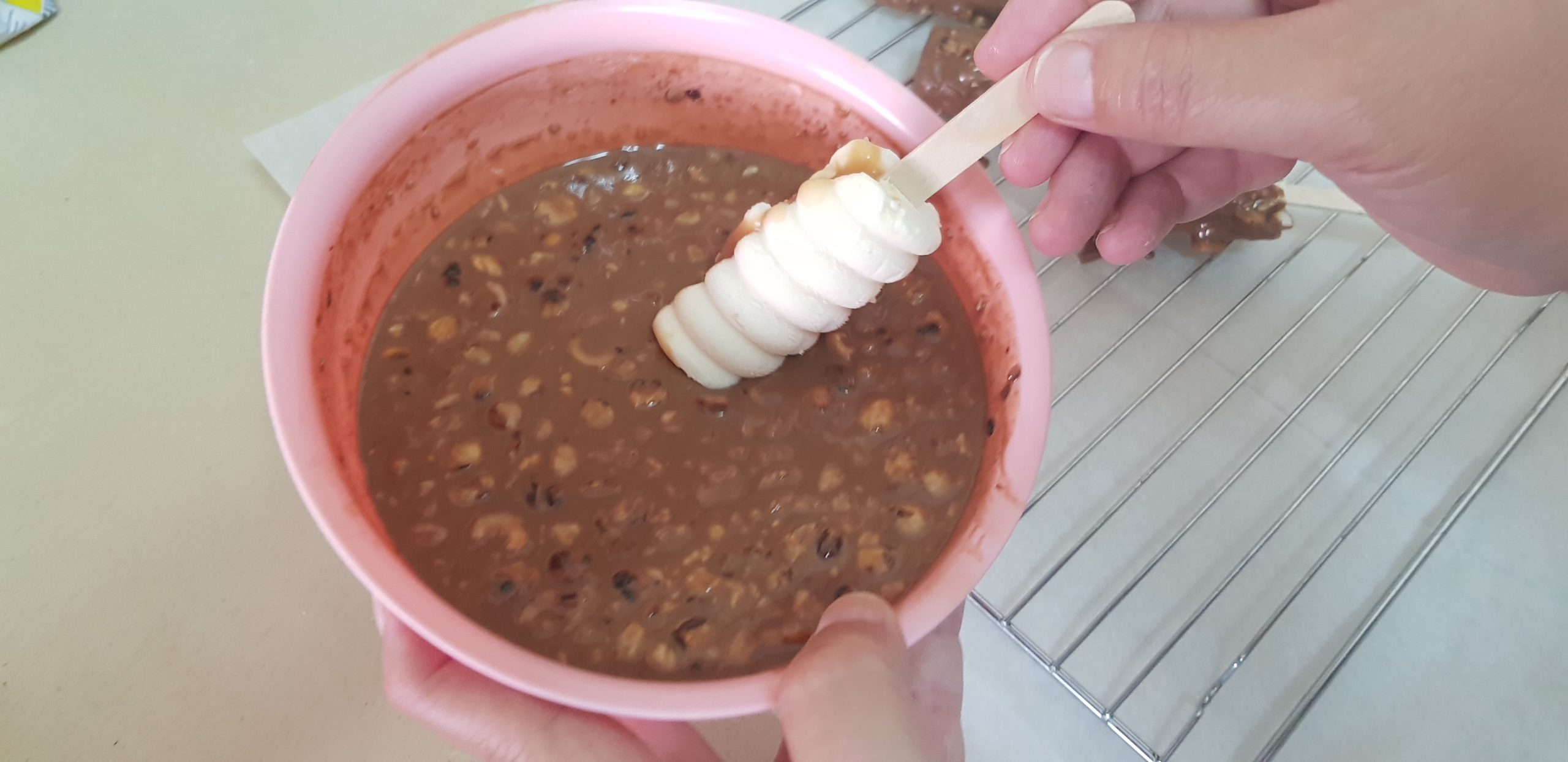 3 – Le chocolat doit refroidir à une température d’environ 35 degrés pour tremper les glaces dedans.