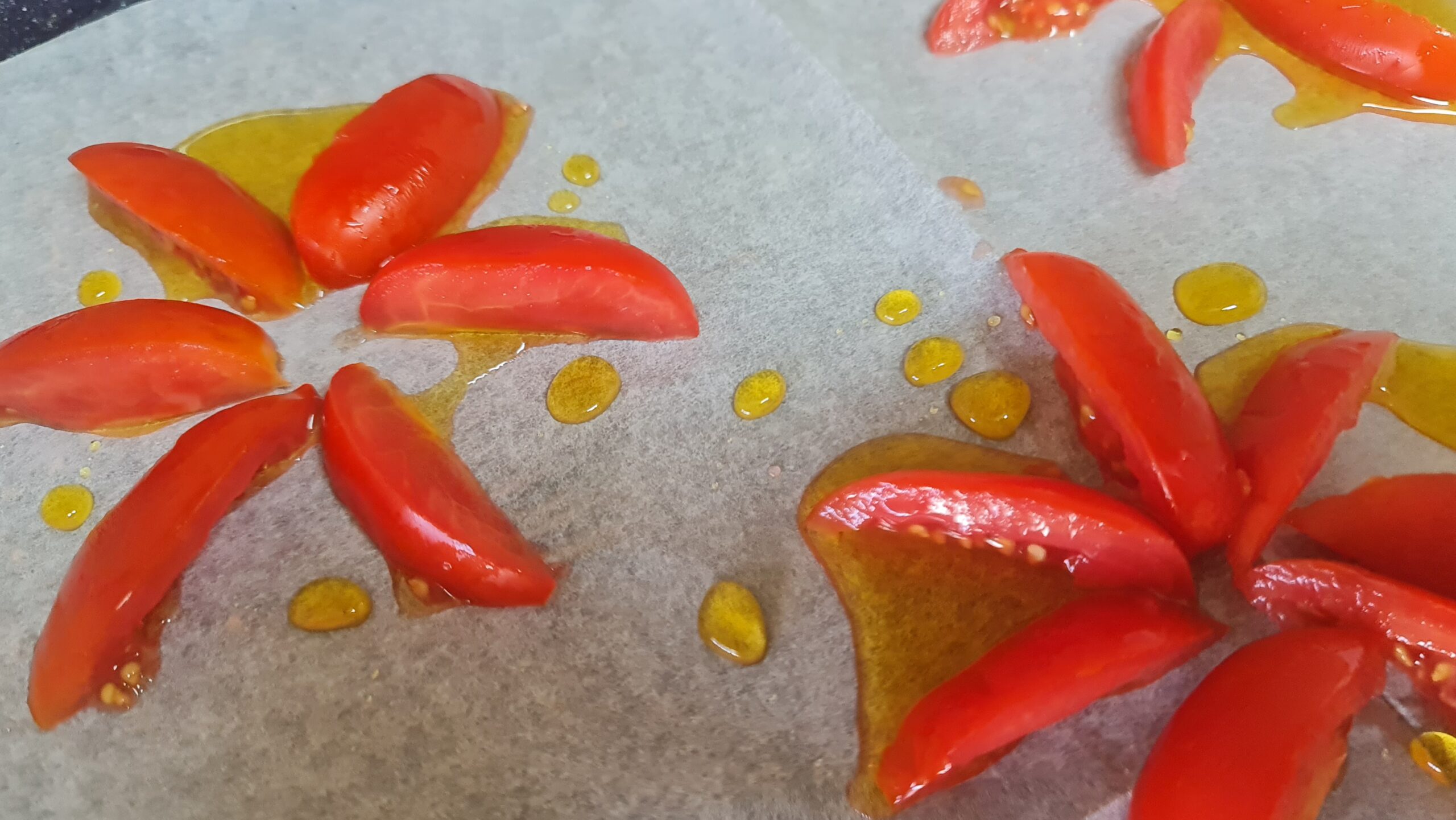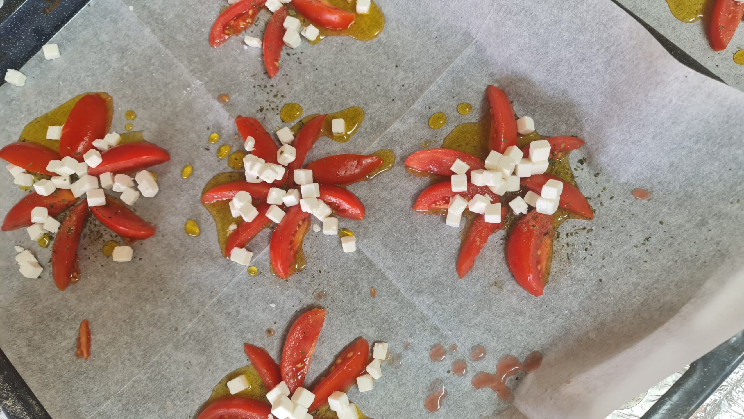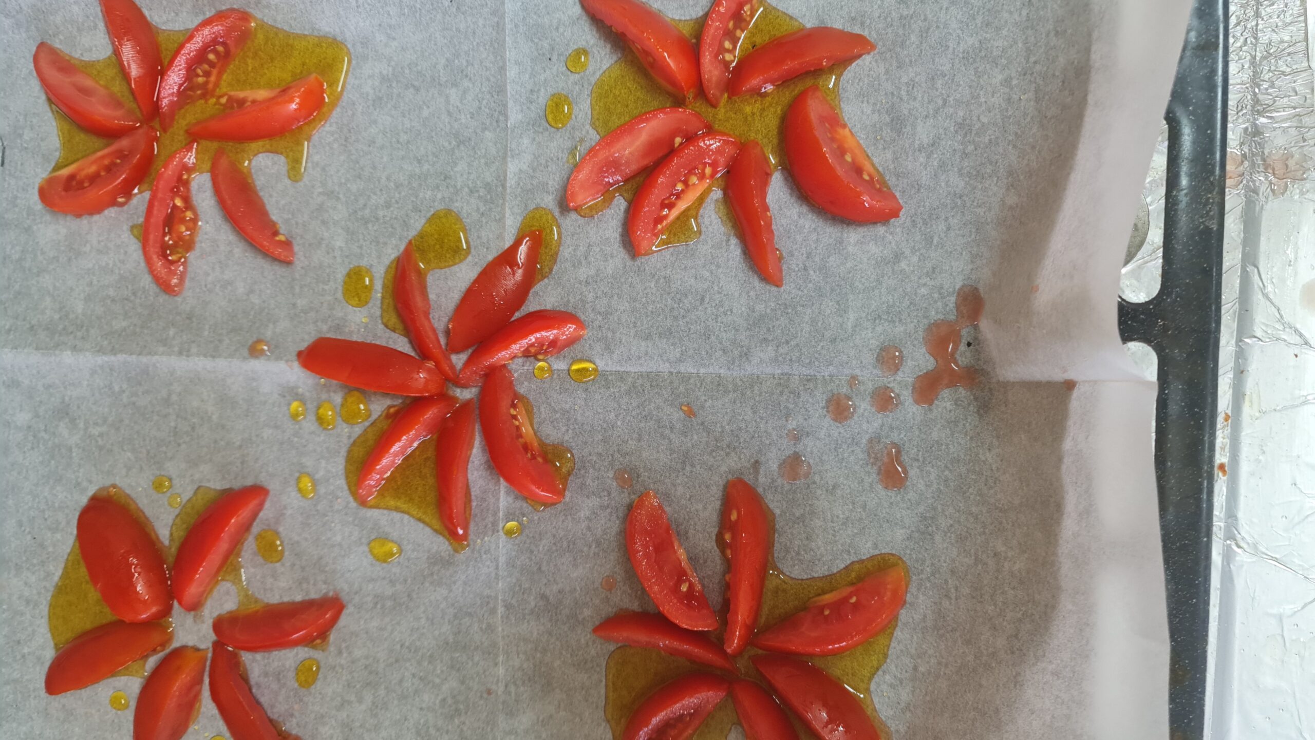 Déposer des demies tomates cerises avec la partie coupé face contre la plaque.