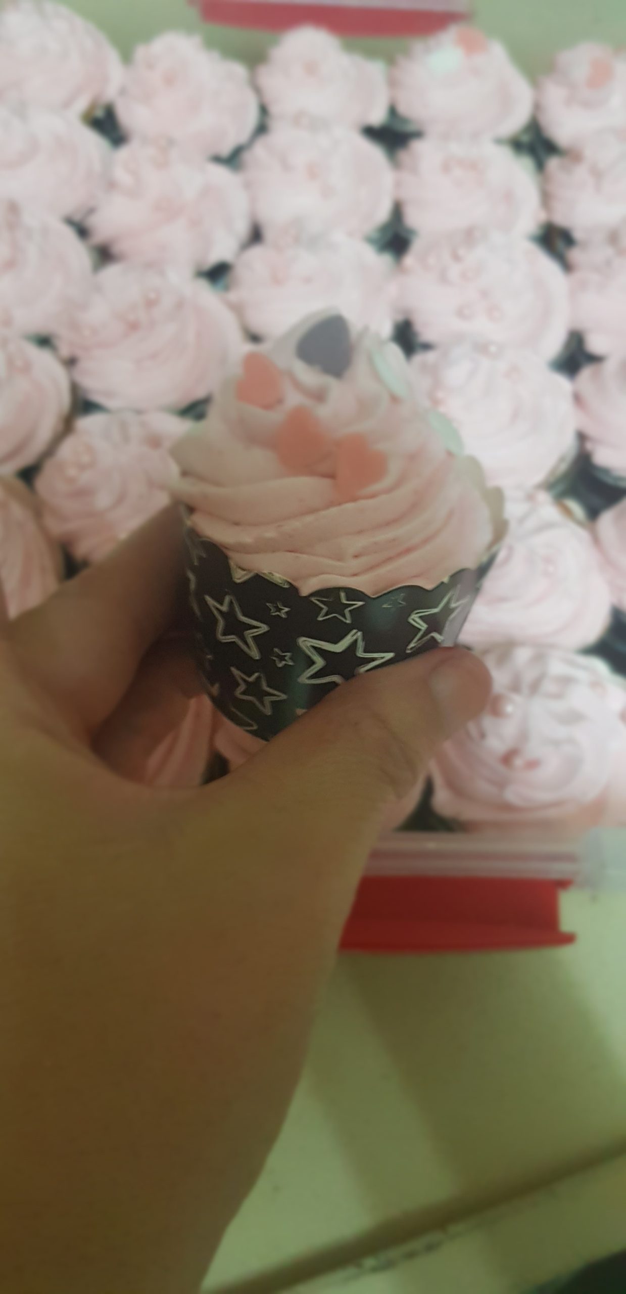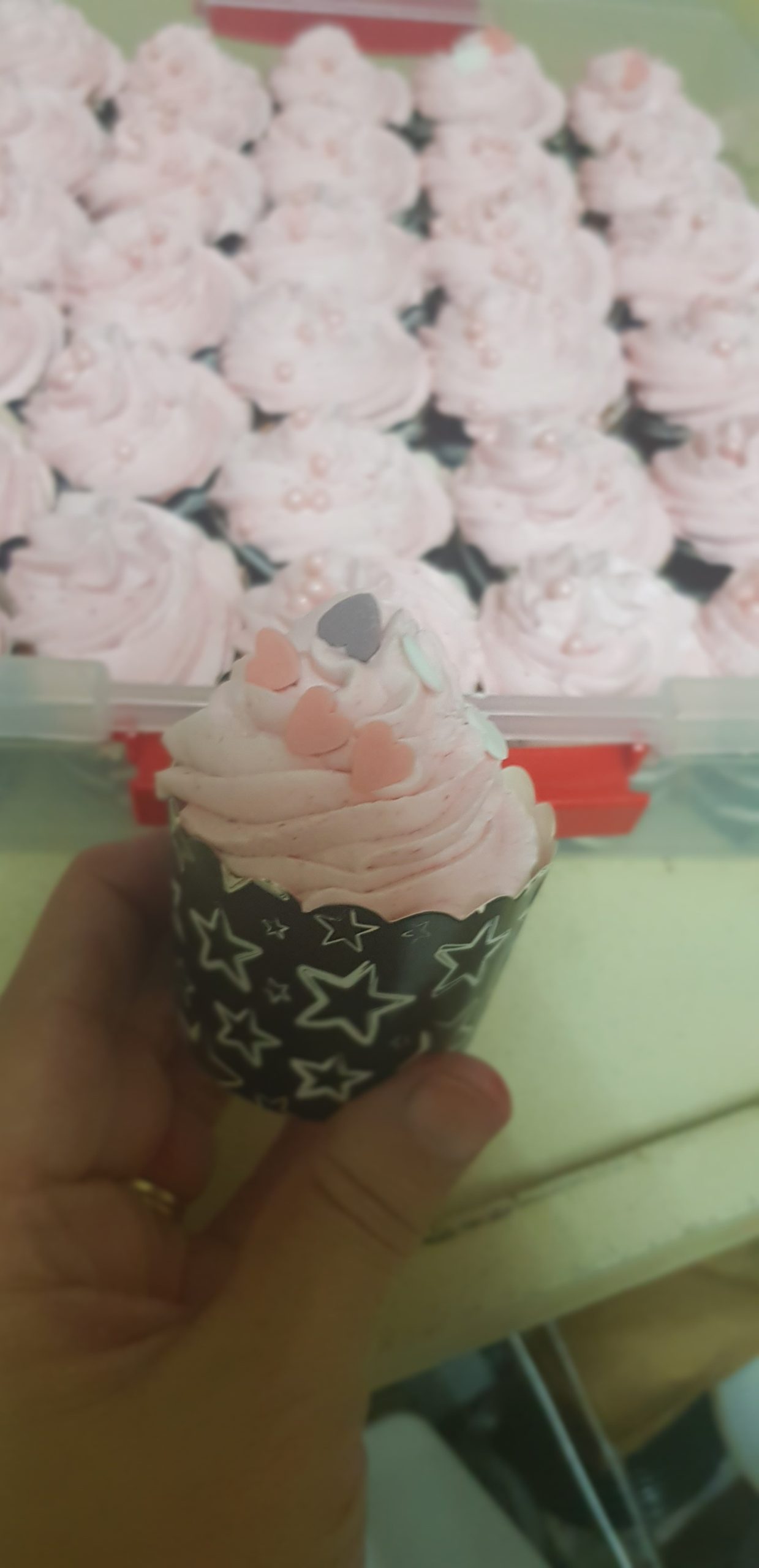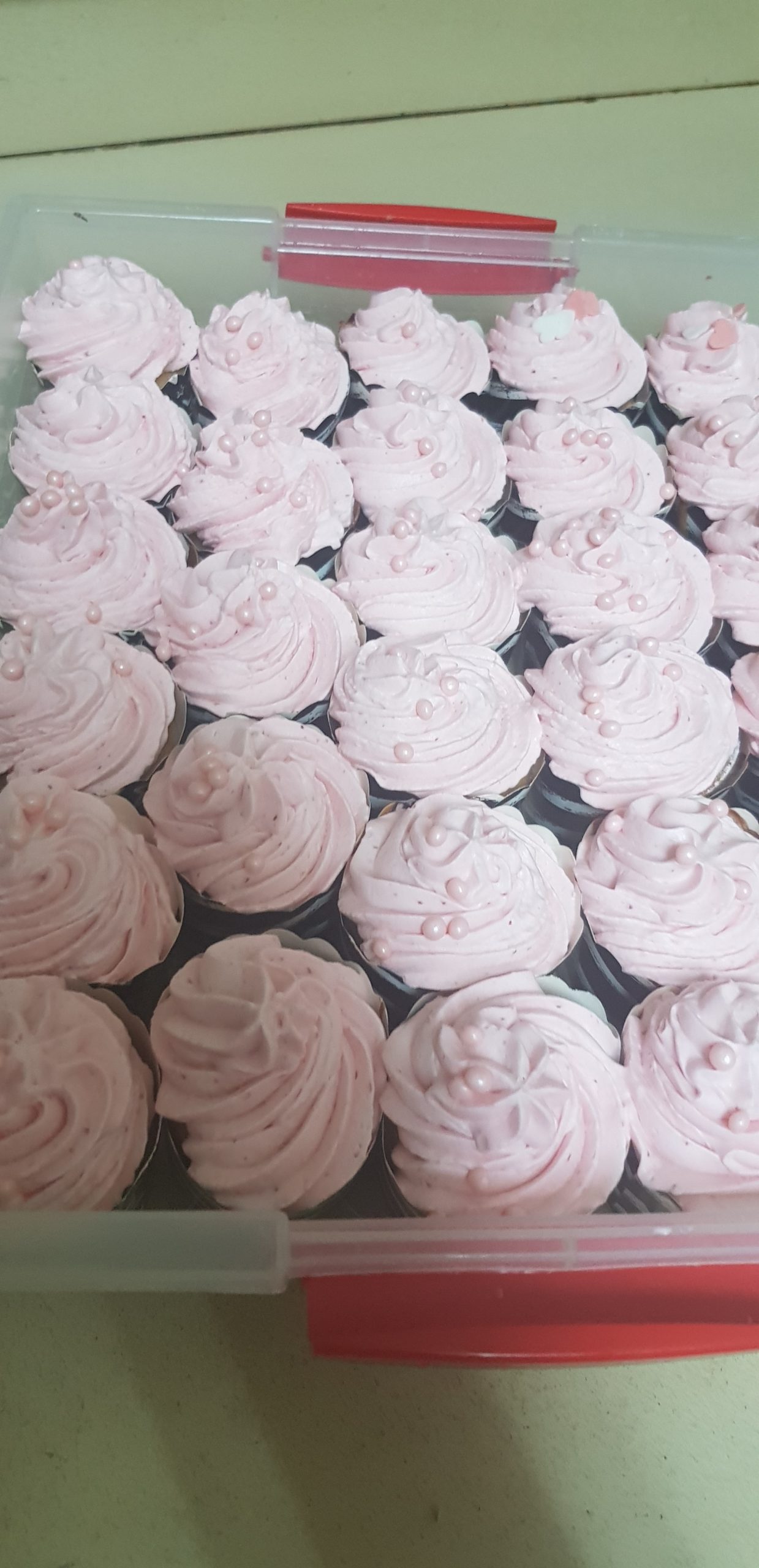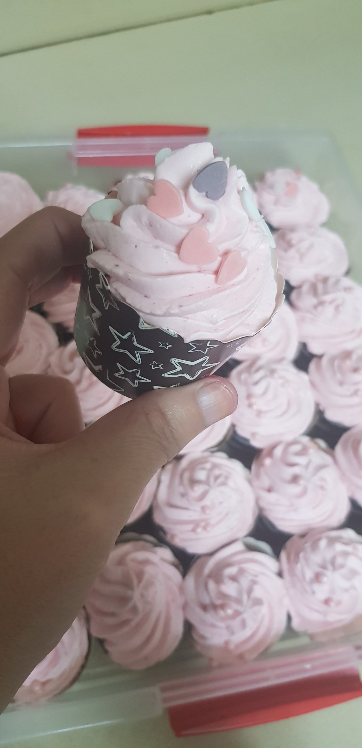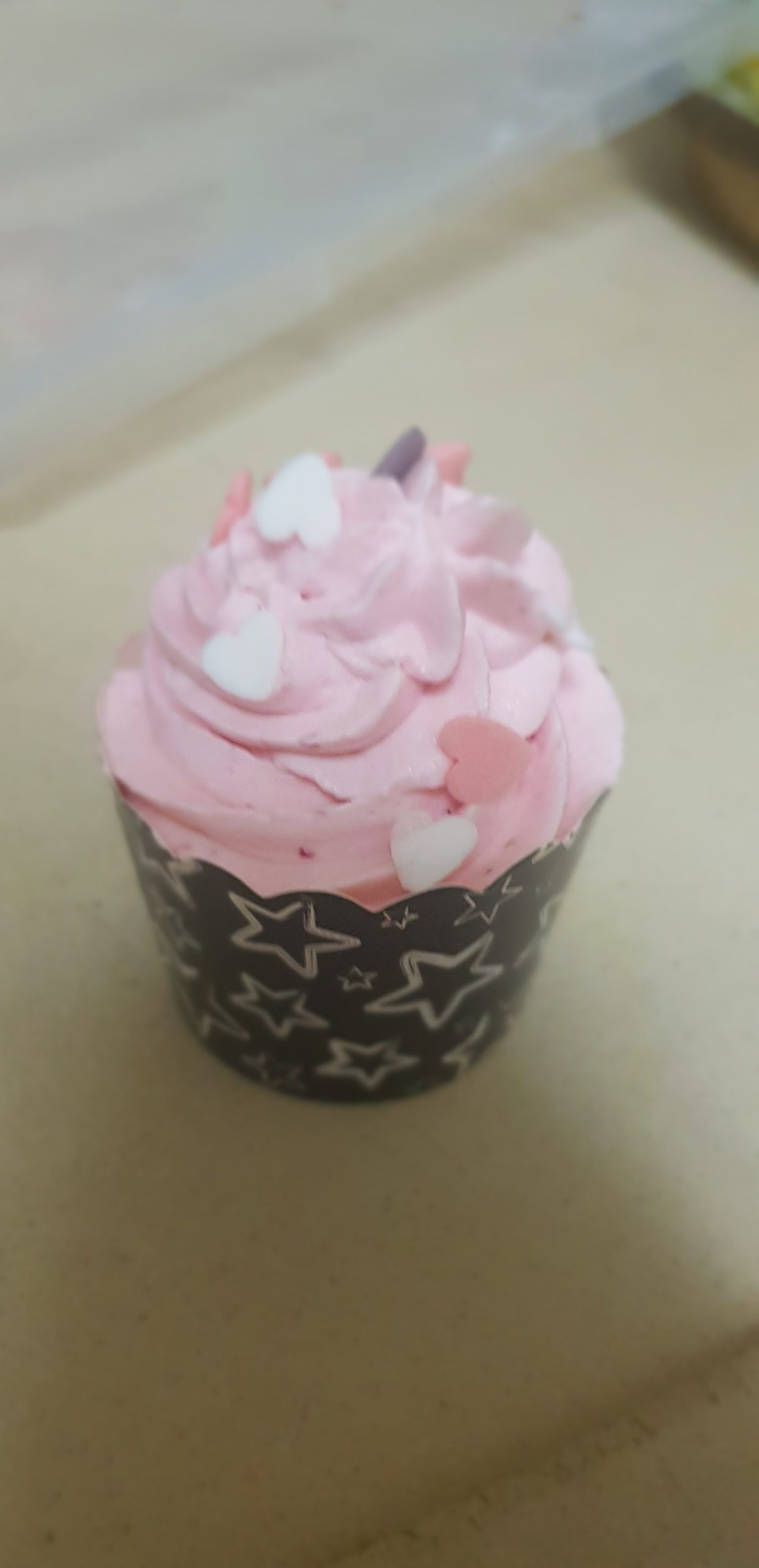 Pour le coté plus gourmand (et plus de 83 calories) , battre 500 ml de creme fraiche liquide avec 200 gr de sucre glace, puis ajouter un demi verre de fraise congelé et mixer. Placer dans une douille et décorer vos muffins !