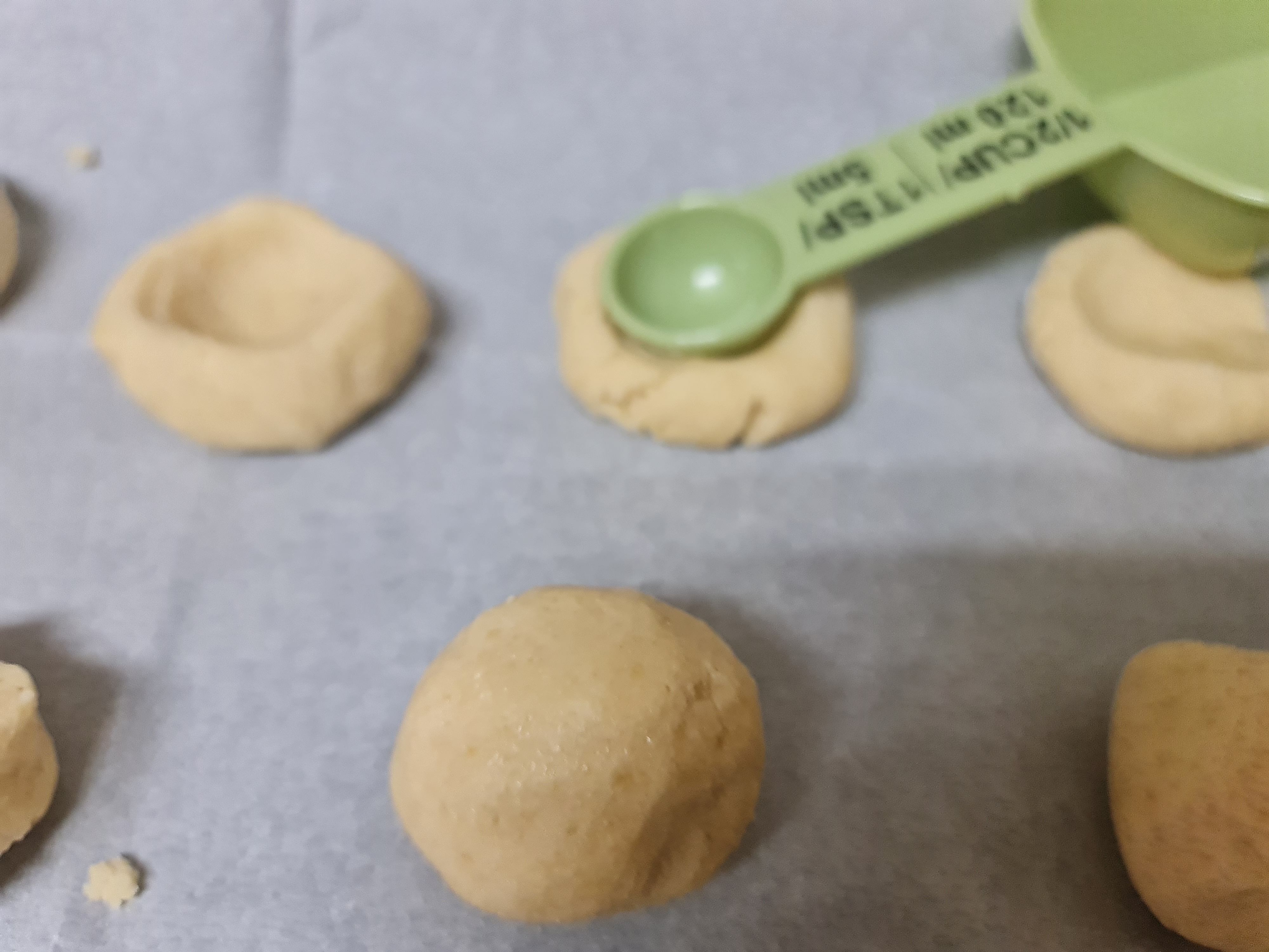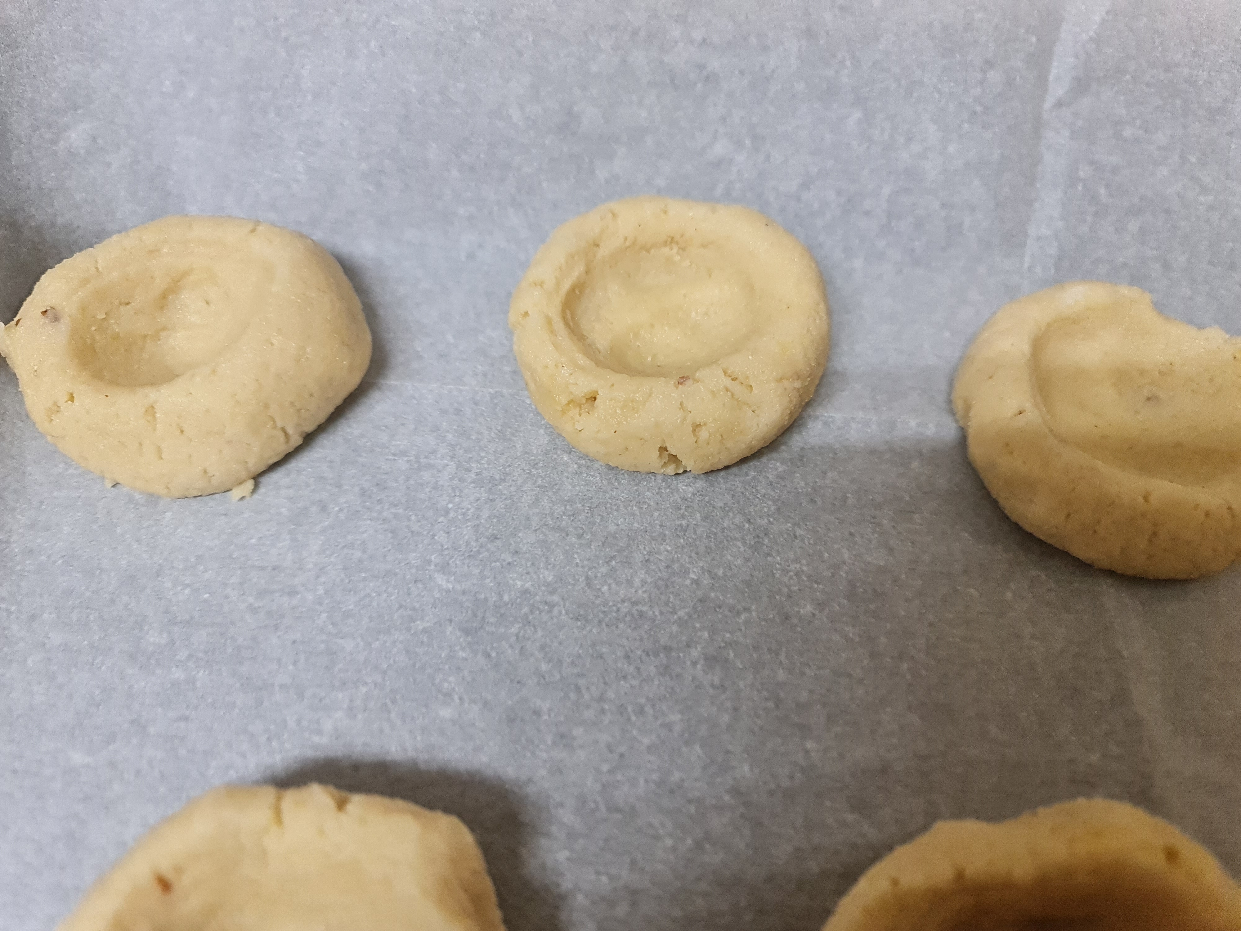 Avec le manche d’une cuillère en bois creusez le centre de la boule et aplatissez un peu le biscuit.